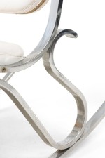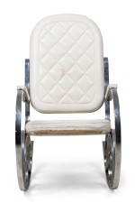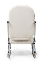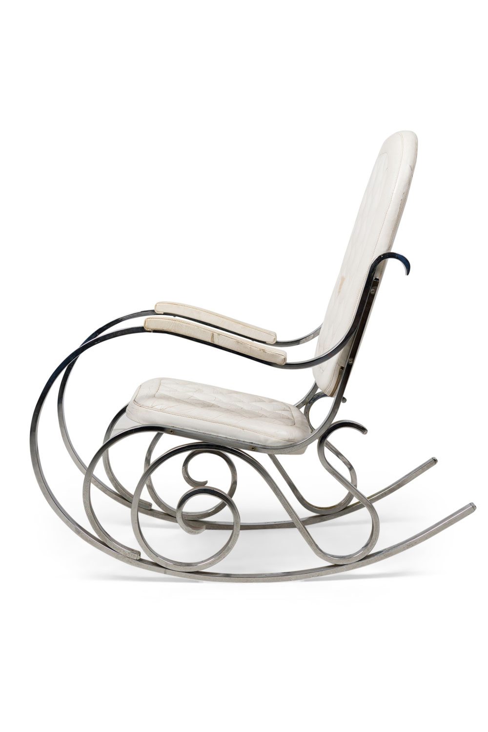French Mid-Century rocking armchair with an ornate polished nickel scroll design frame with quilted white leather upholstered seat and back. (MAISON JANSEN)(Available in black leather: REG5217A).