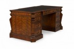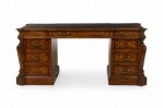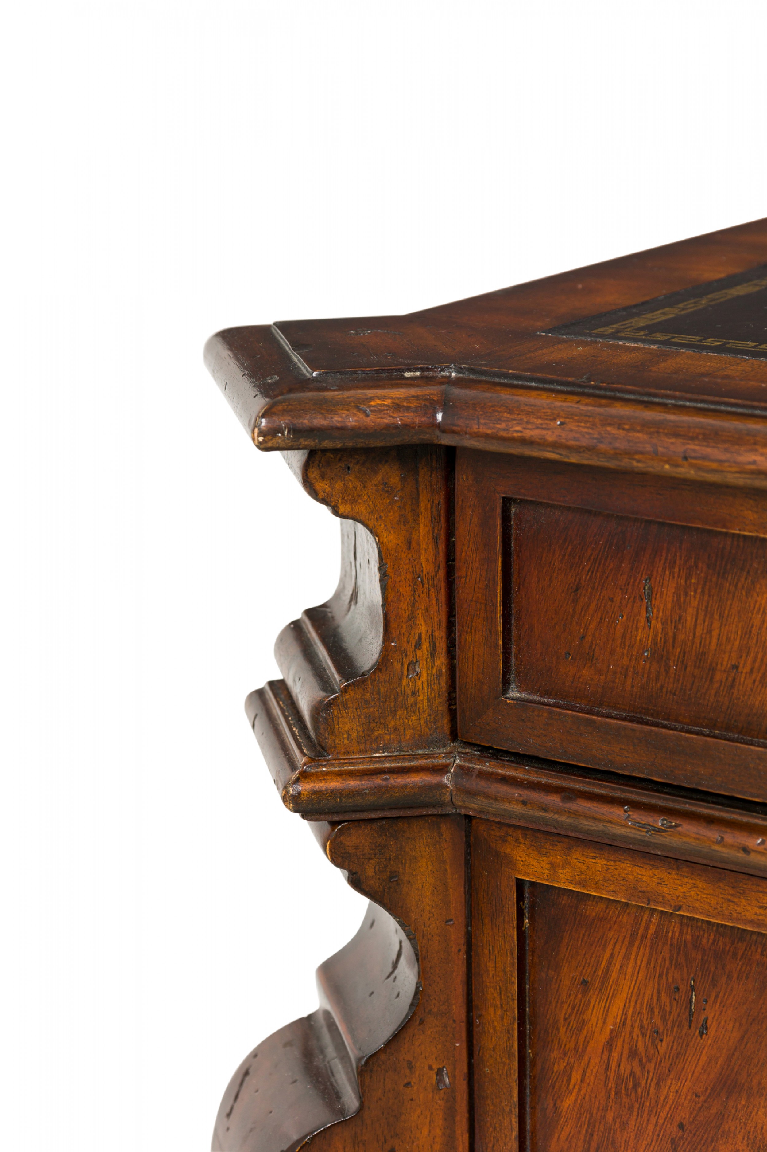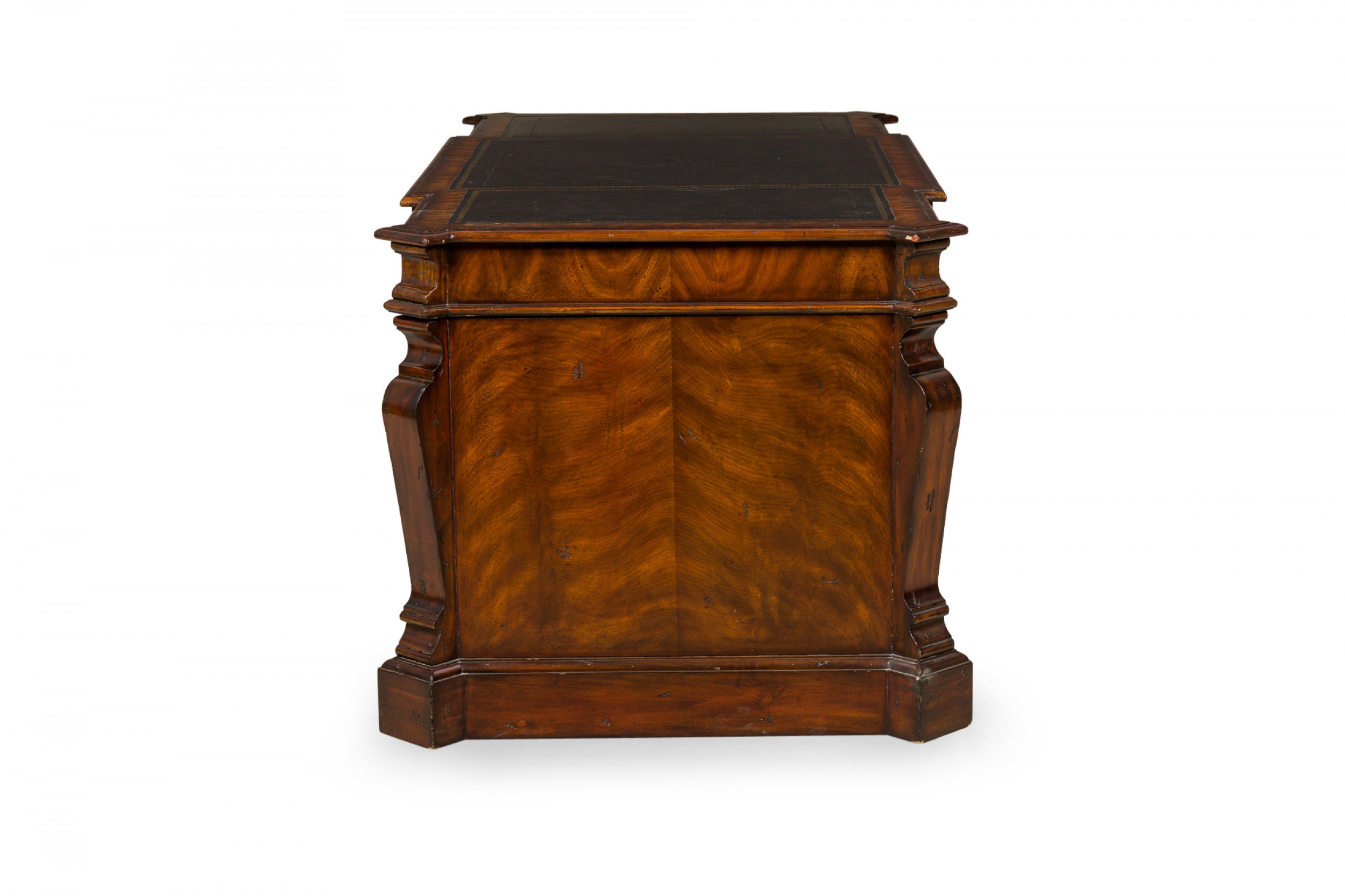 English Regency style (Mid-20th Century) mahogany kneehole desk with shaped molded corners, inset leather top including a gold leaf embossed border plus starburst at center with 2 pedestal side cabinets having three front pullout drawers with brass garland pulls and 3 faux back drawers. (MAITLAND SMITH).