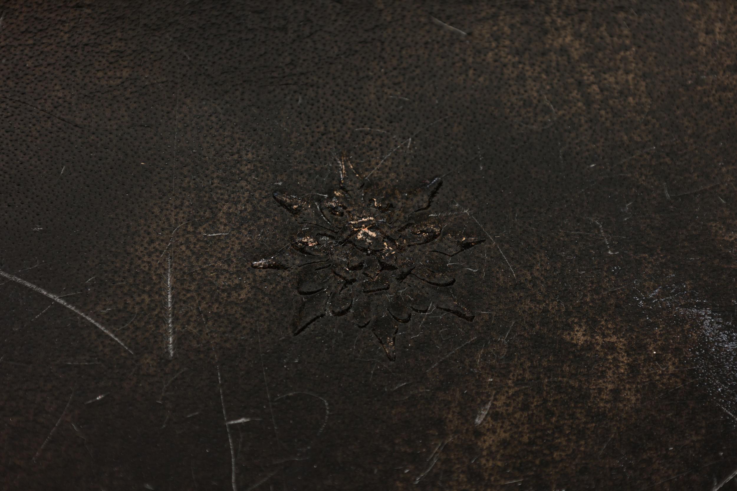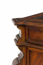 Style: English Materials & Techniques: Brass, embossed, metal, veneer, wood Category: Tables, Office/Library Condition: Wear & losses due to age and use. Cabinets: 35" W x 20.5" D x 25.5" H. Good; Minor losses