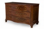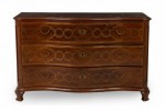 Continental Maltese (18th Century) rosewood chest / commode with decorative brass inlay having 3 serpentine-front drawers with each having two brass drawer pulls, resting on four low tapered legs..