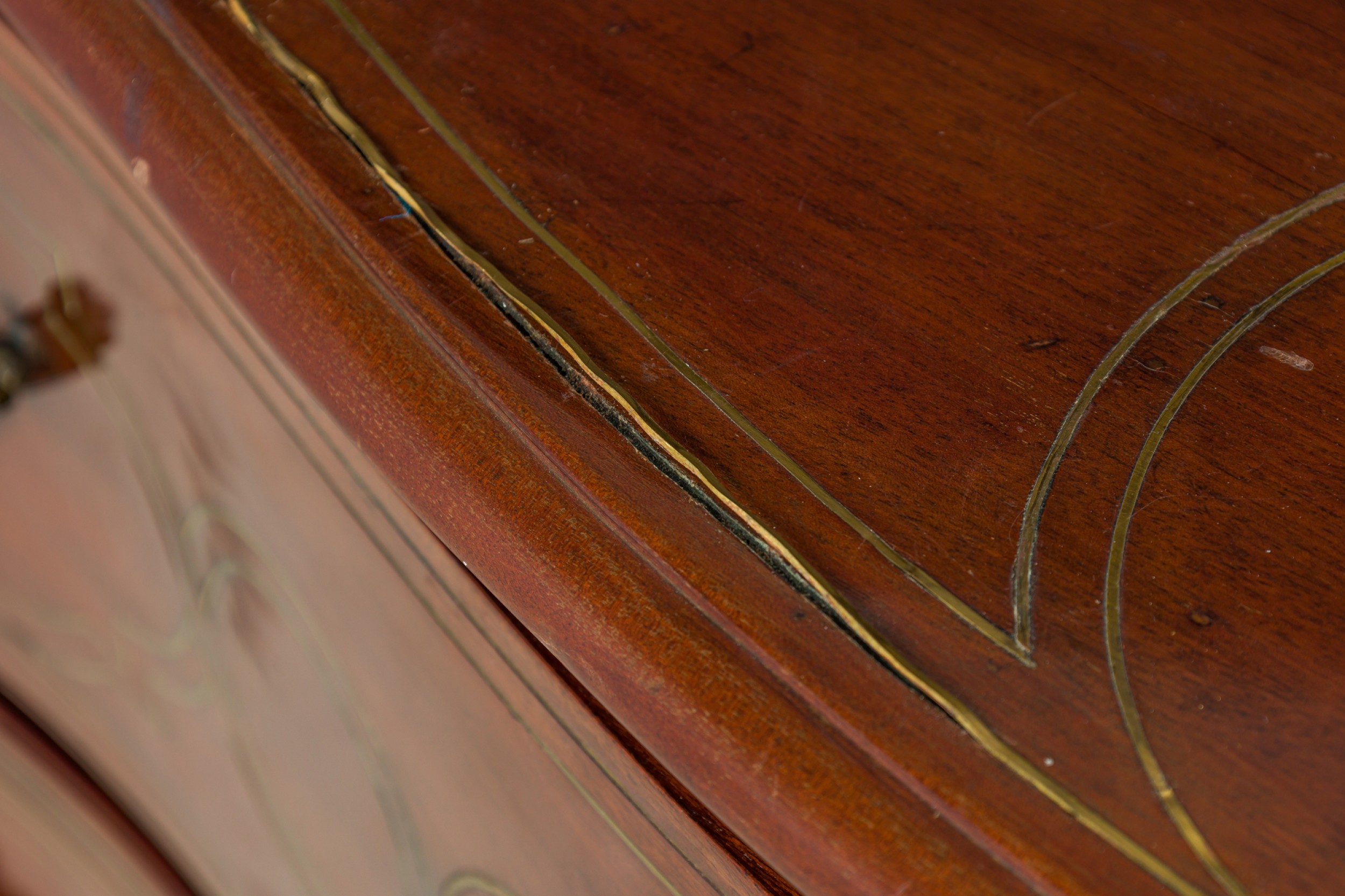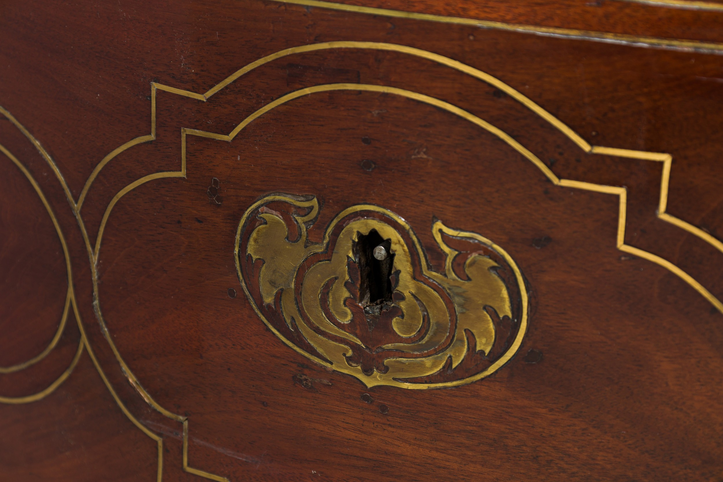 Style: Continental Materials & Techniques: Brass, inlaid, inlay, metal, rosewood, wood Category: Dining Room Condition: Losses to inlay, wear to finish. Good; Minor losses