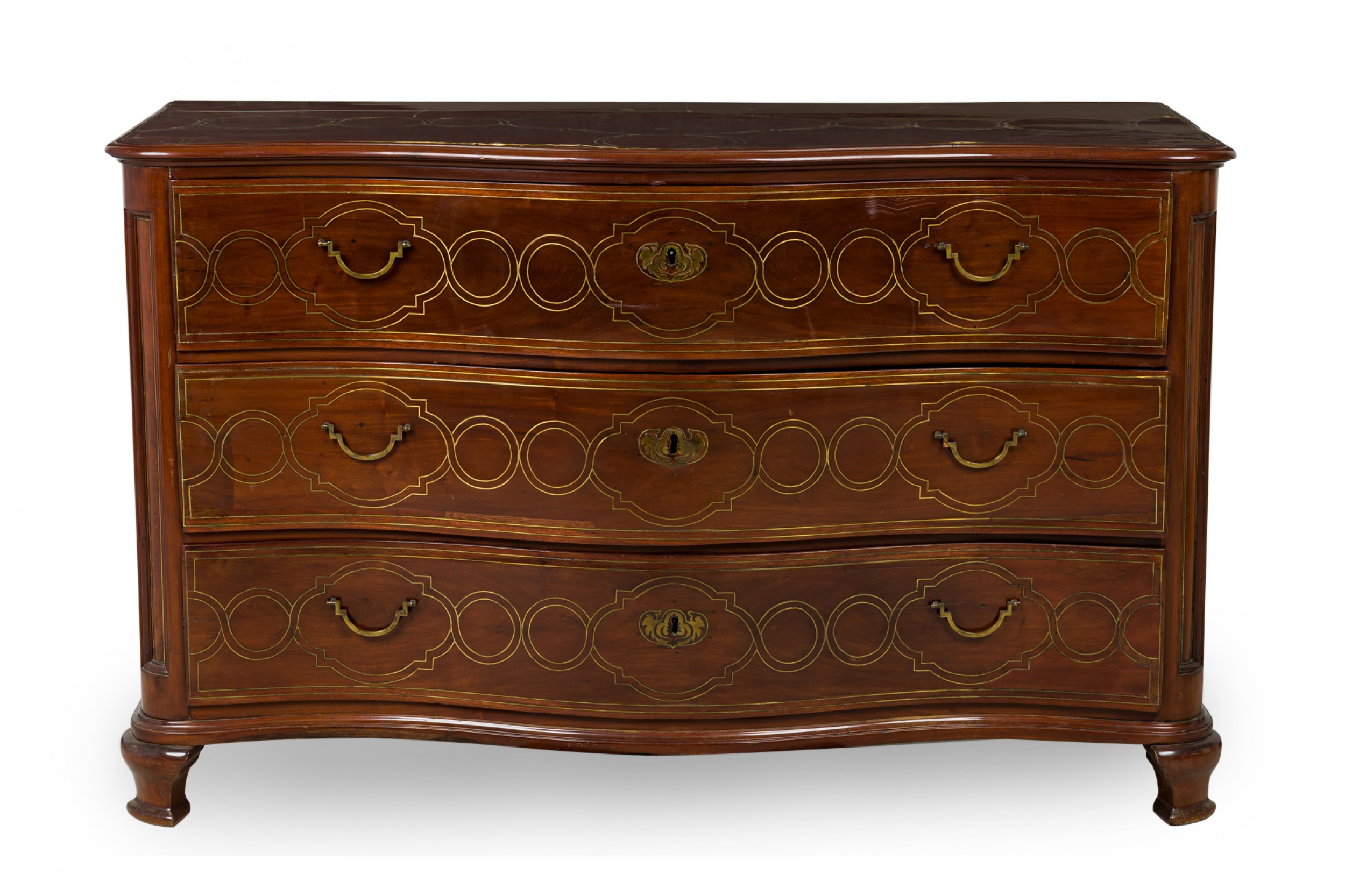 Continental Maltese (18th Century) rosewood chest / commode with decorative brass inlay having 3 serpentine-front drawers with each having two brass drawer pulls, resting on four low tapered legs.