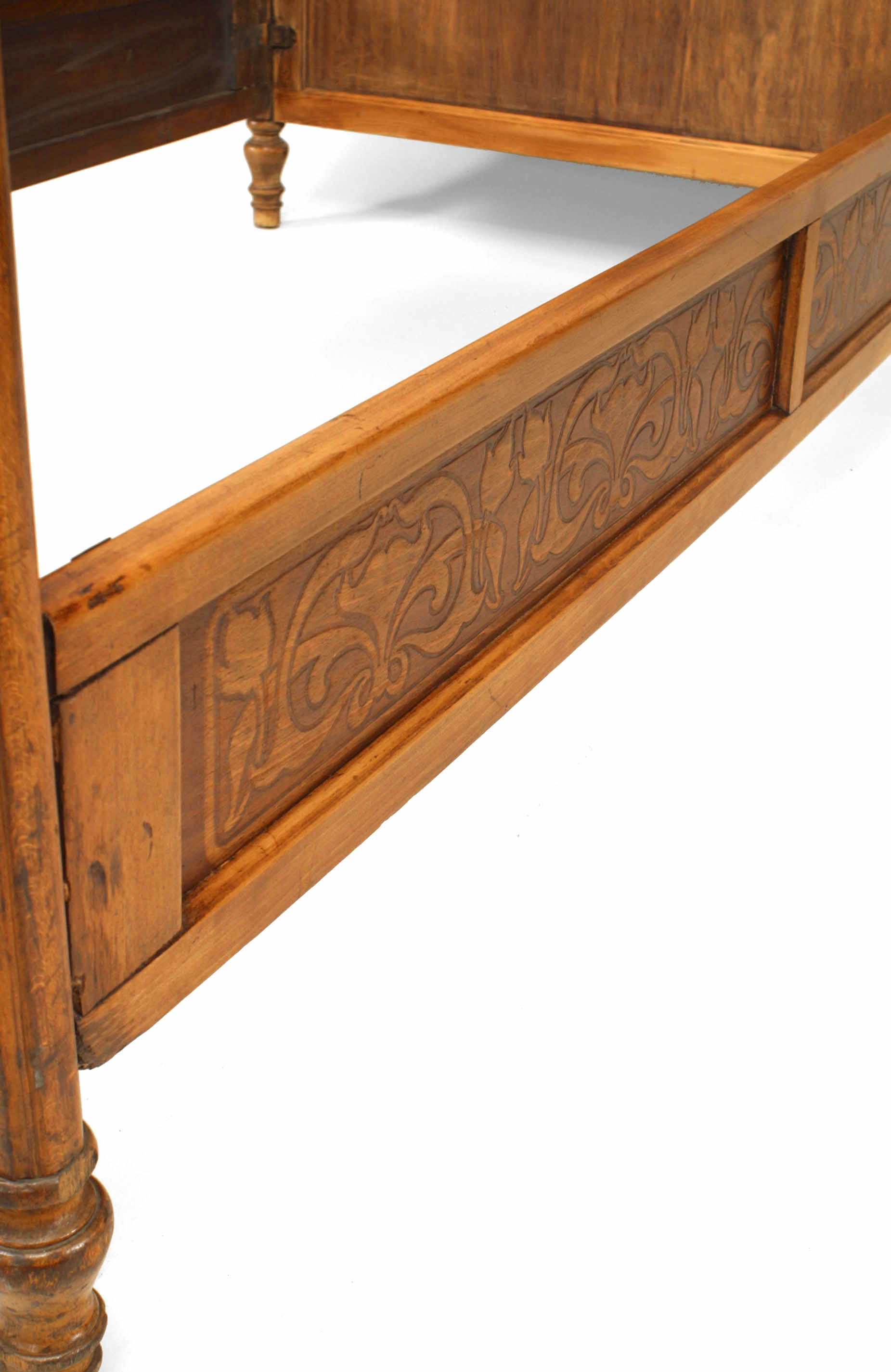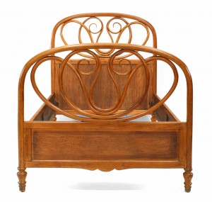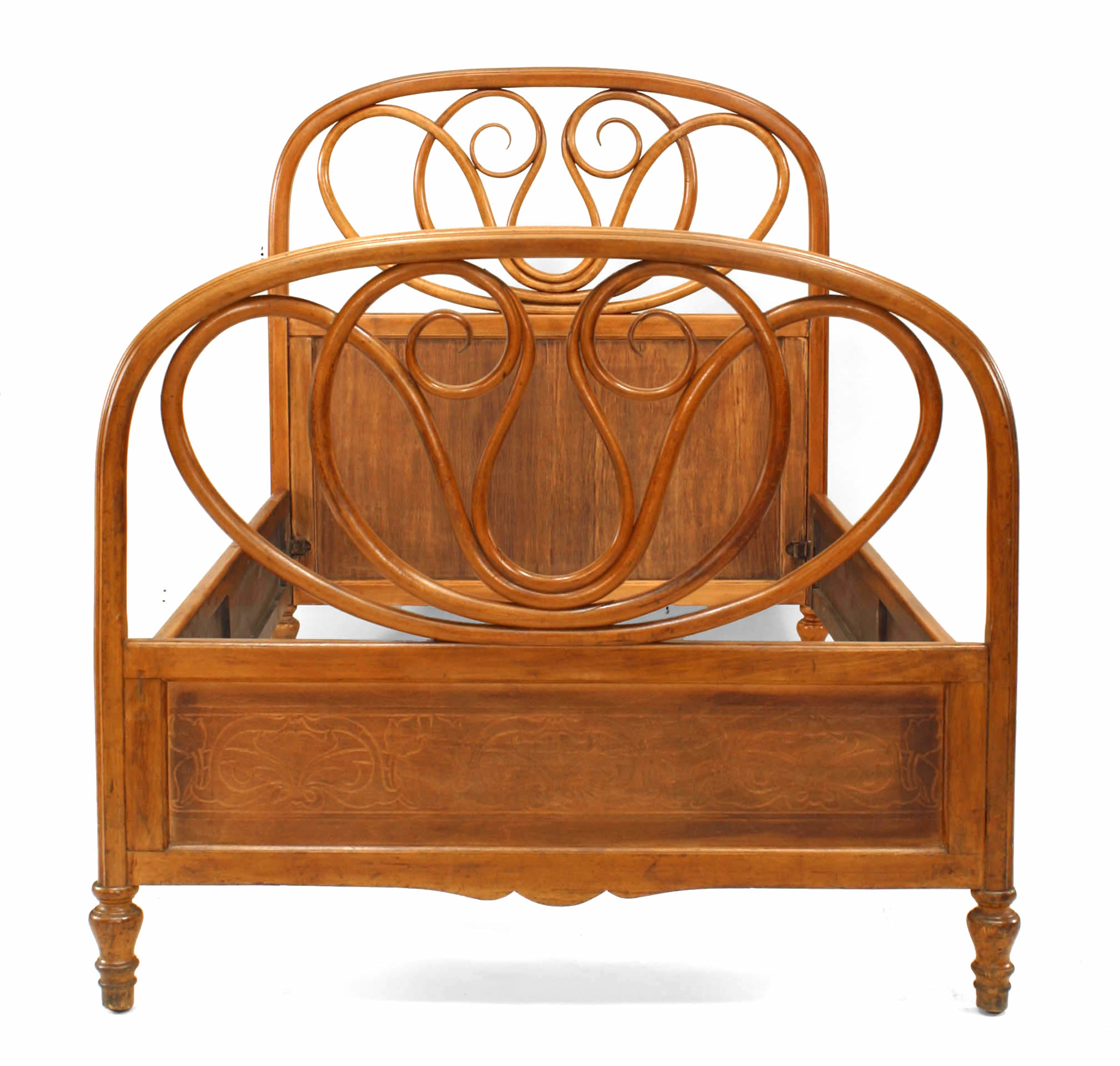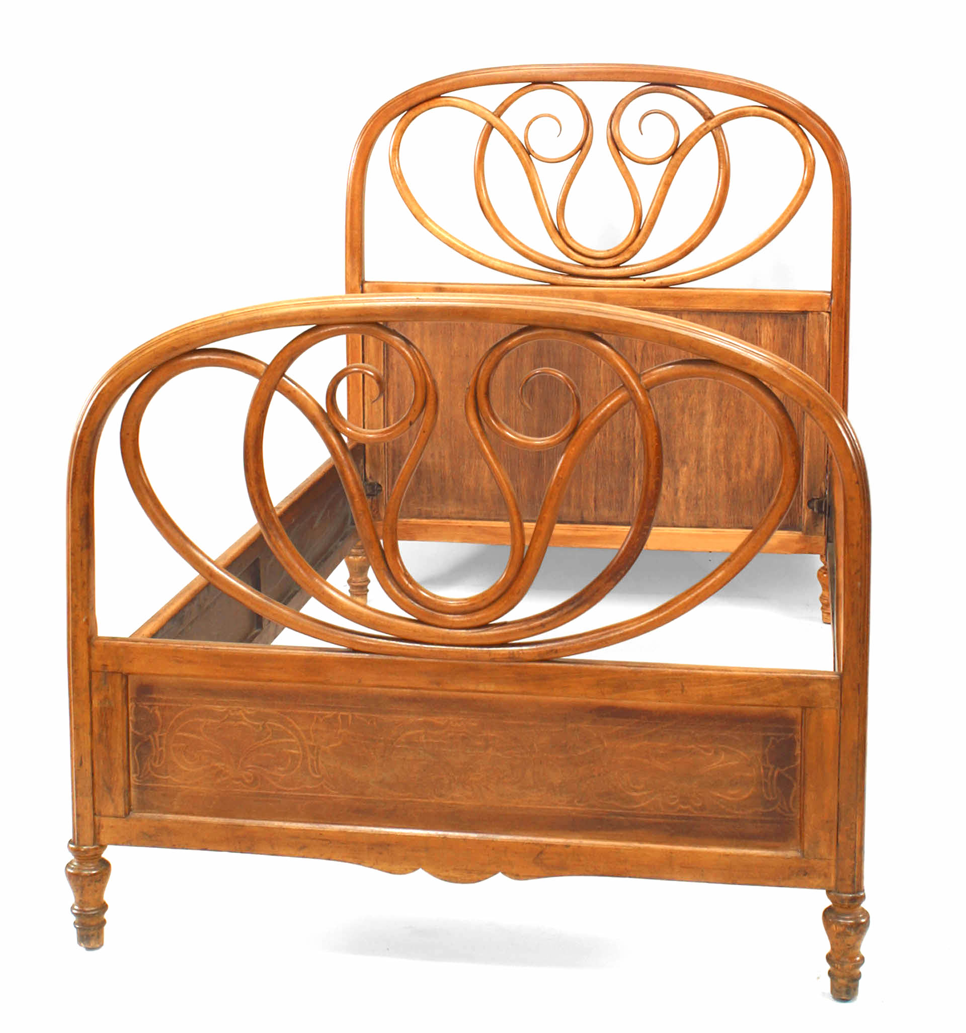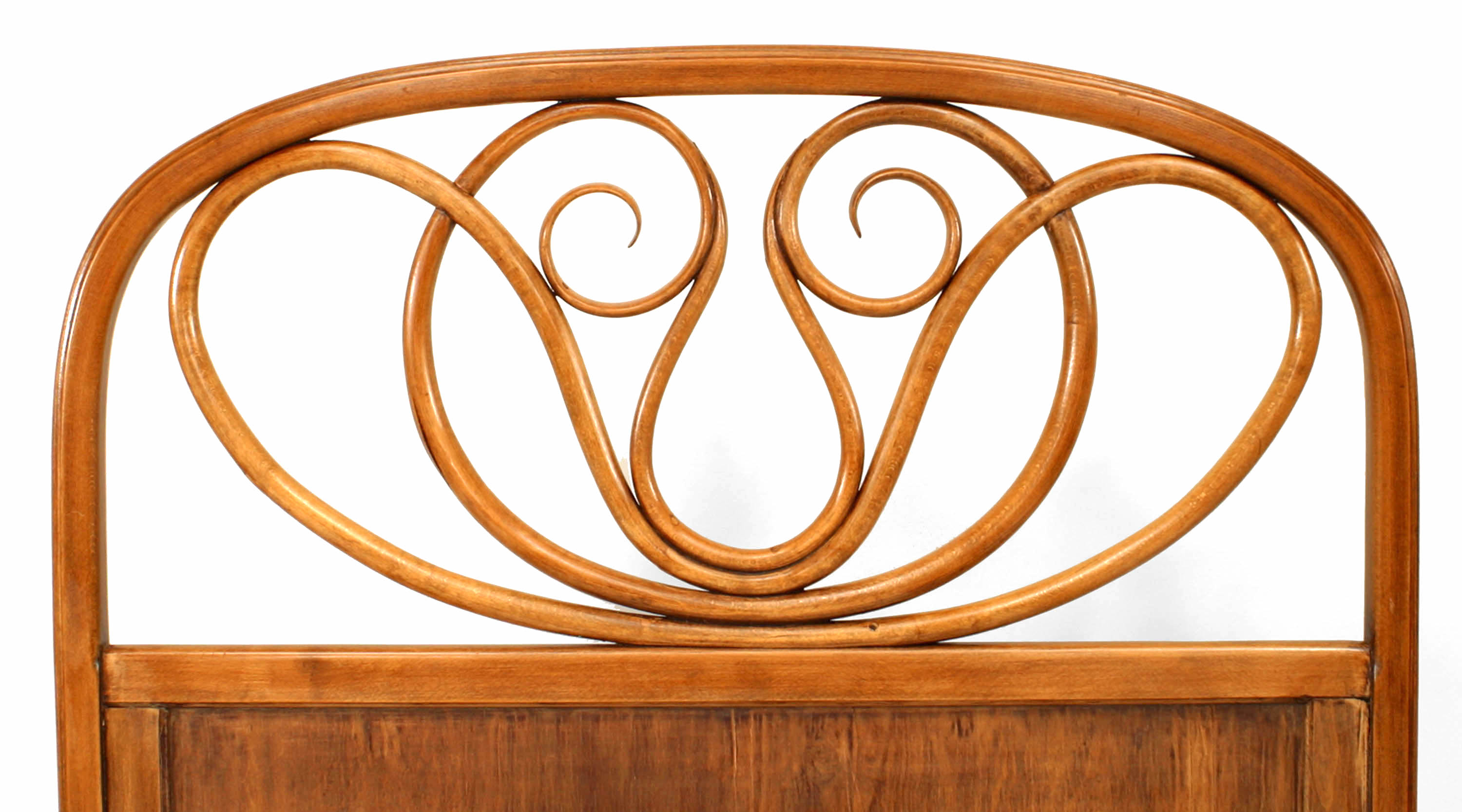 Bentwood (19/20th Century) maple stained twin size bed with double scroll center design (includes: headboard, footboard, rails).(paper label: JACOB JOSEP KOHN, WEIN). (Internal dimensions are 41.5" x 75.5")