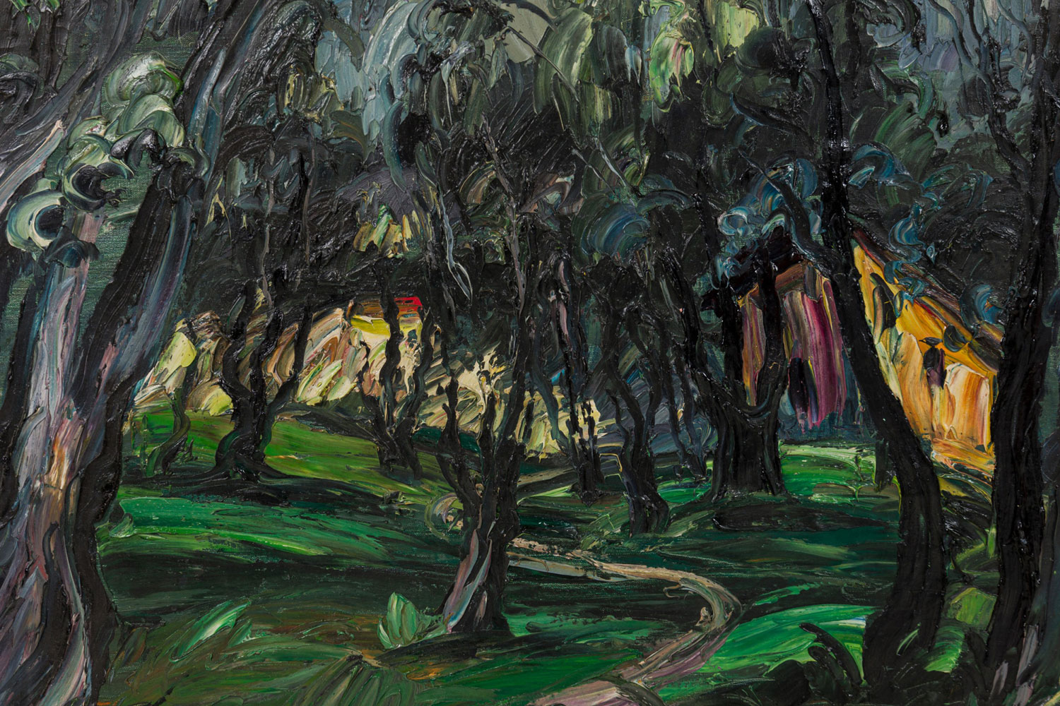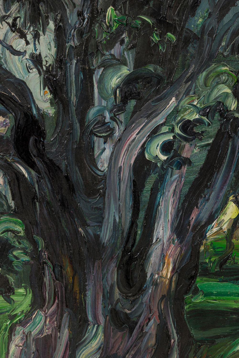 Framed oil on canvas abstract landscape of a wooded meadow at twilight in a gilt and driftwood frame.