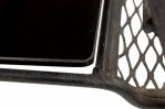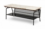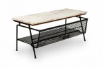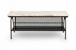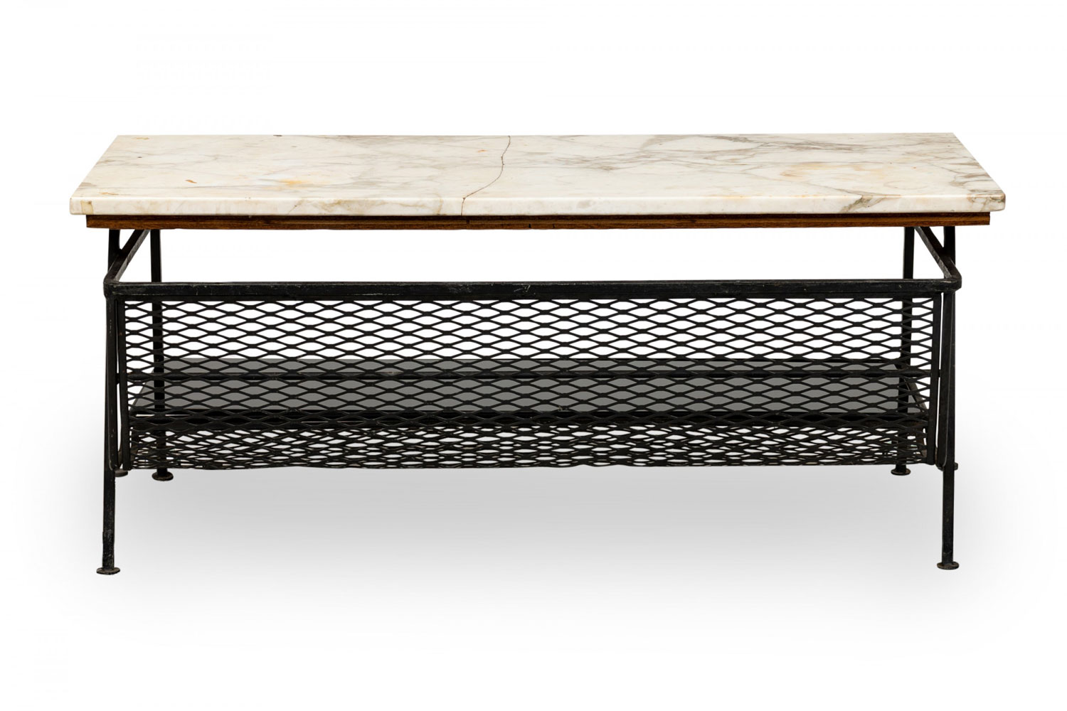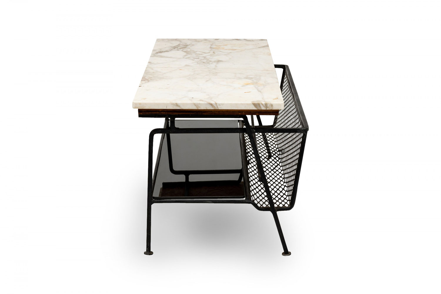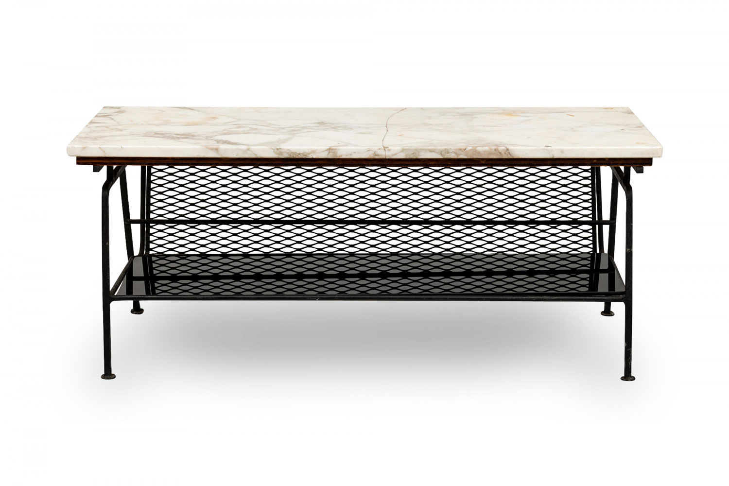 Mid-Century 2-tiered black metal coffee table with built in lattice magazine rack basket, white marble top and lower black glass shelf. (MAURIZIO TEMPESTINI FOR JOHN SALTERINI)