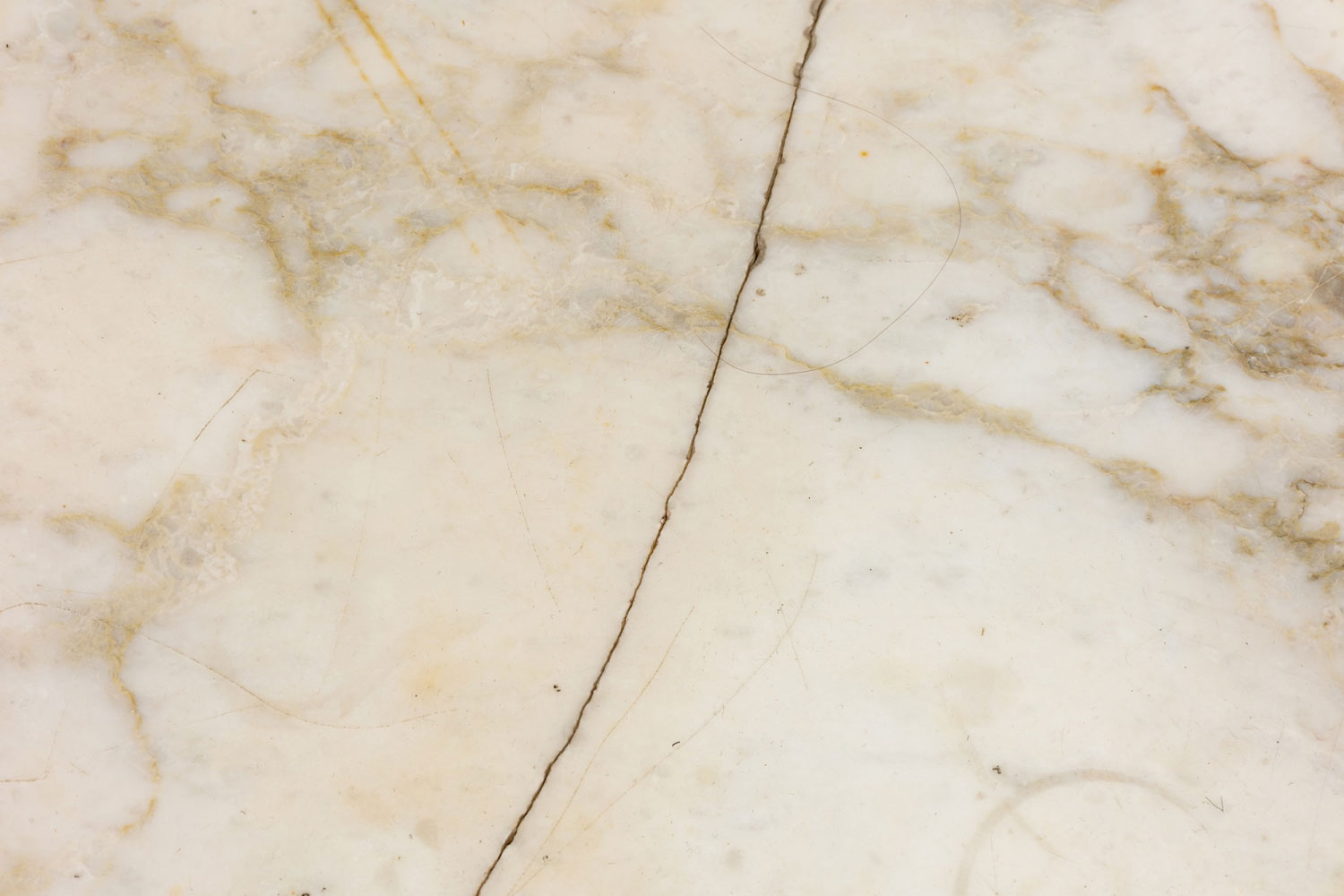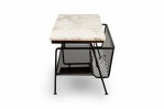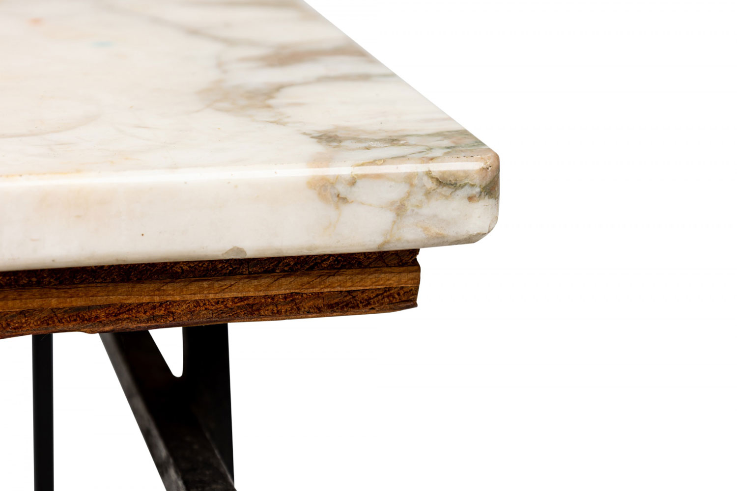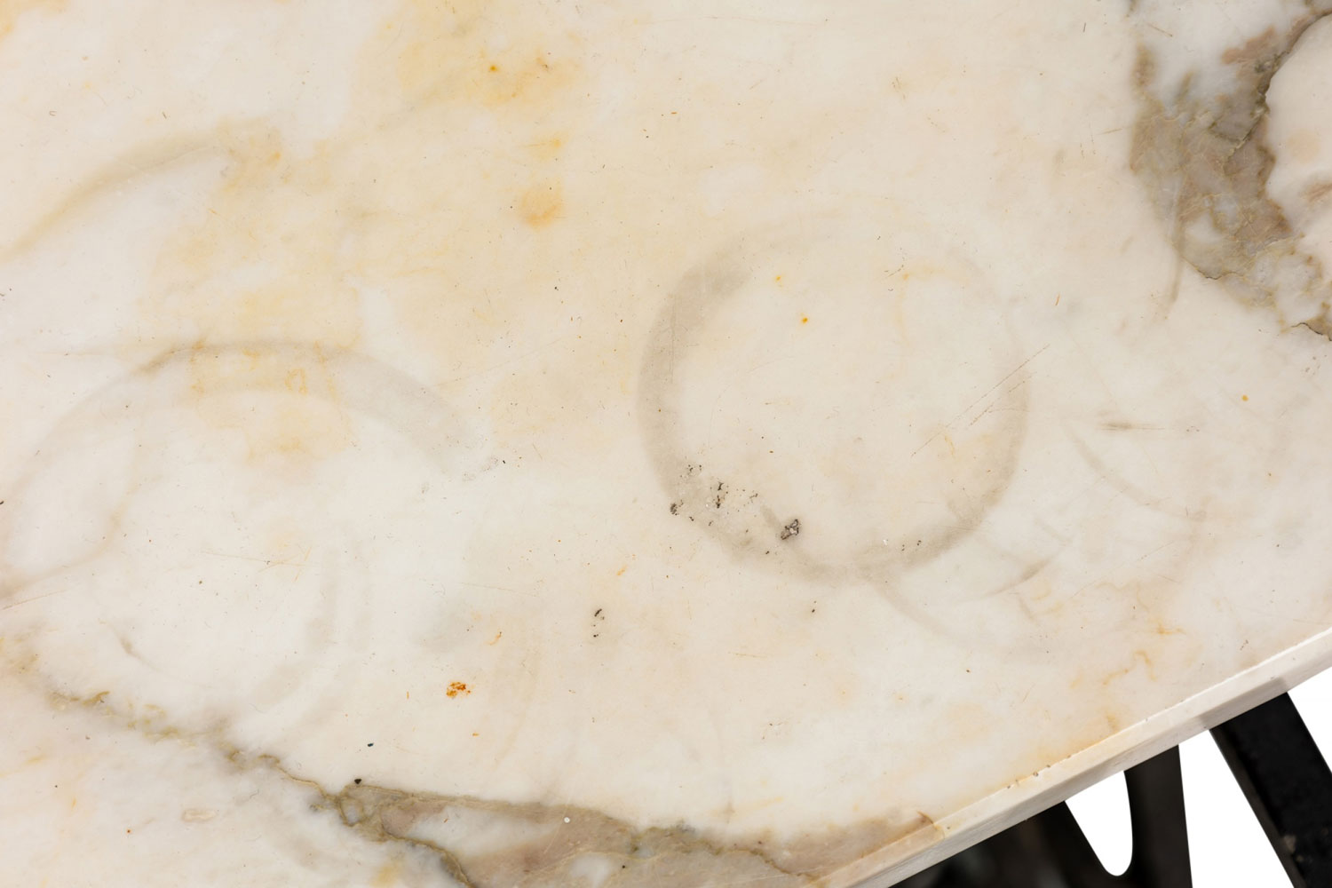 Style: Mid-Century Materials & Techniques: Glass, marble, metal, stone Category: Tables Condition: Some wear to finish. Marble top has a crack. Good; Minor losses