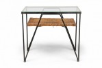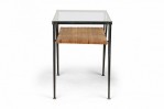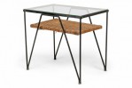 Mid-Century two-tiered, metal, rectangular end table in a minimalist design with glass top and basket woven rattan lower shelf, standing on four triangular supports. (MAURIZIO TEMPESTINI FOR JOHN SALTERINI).