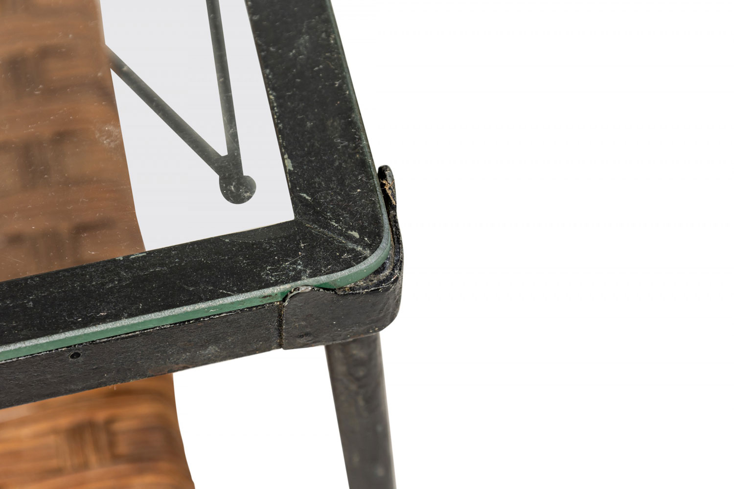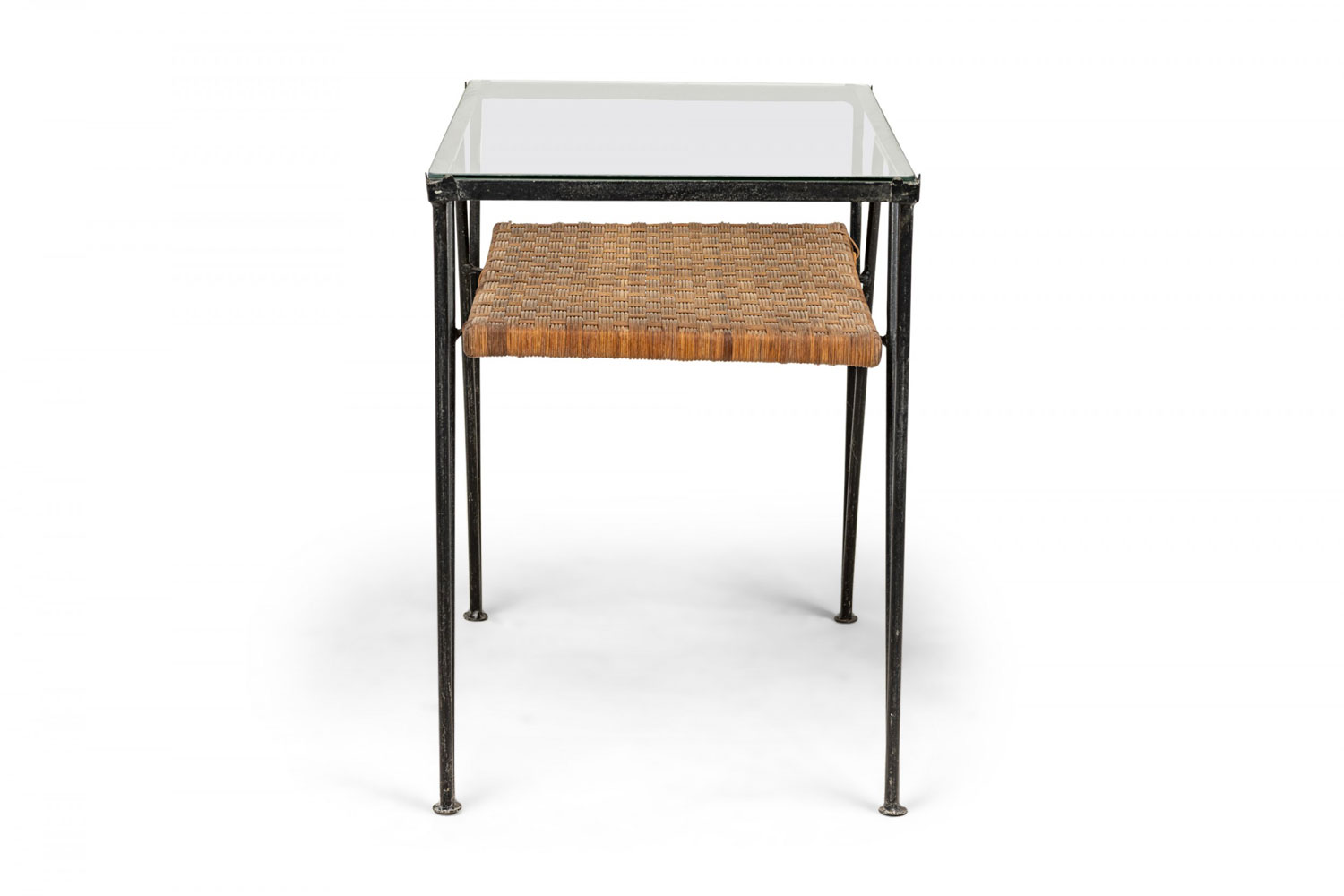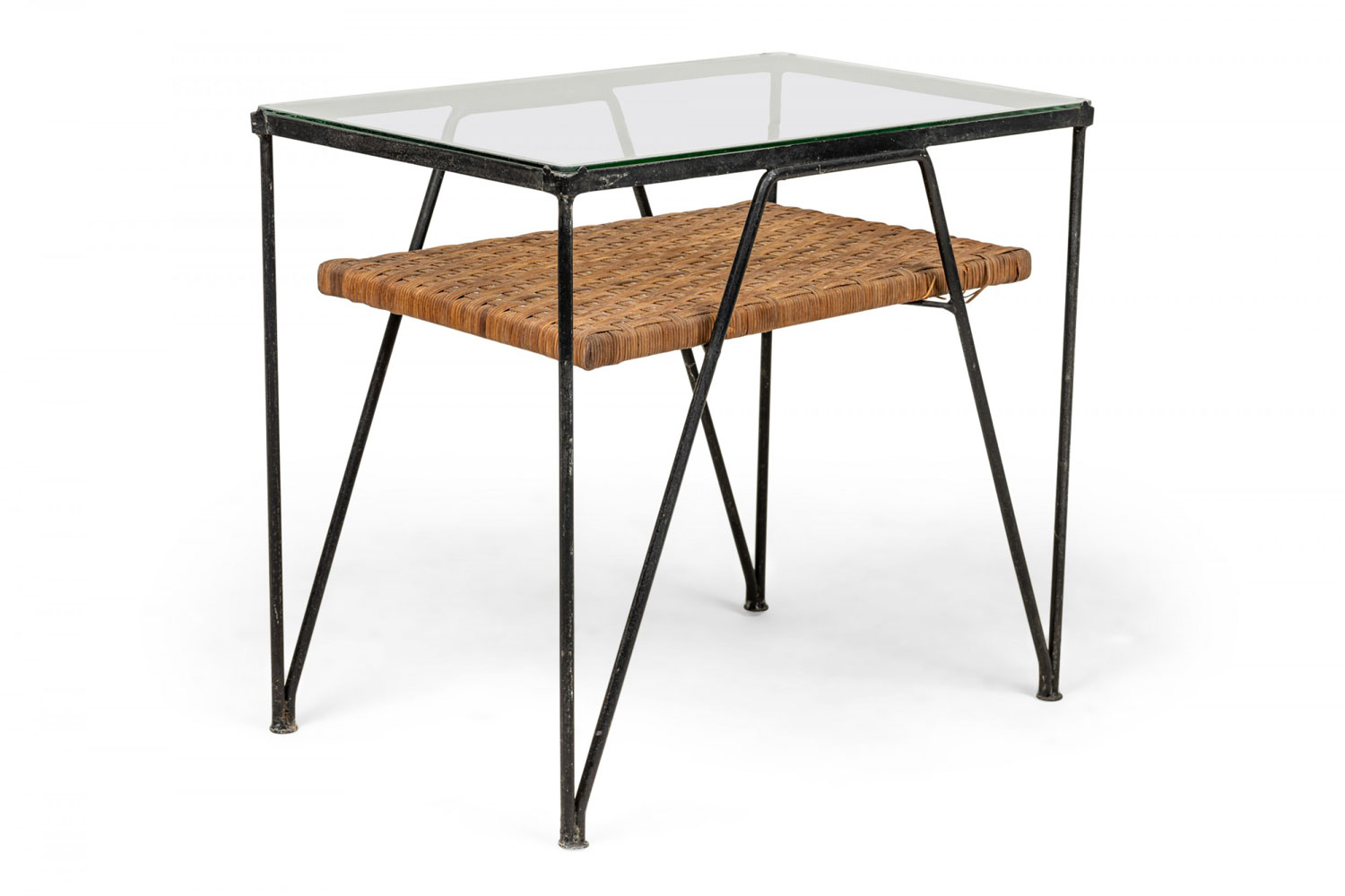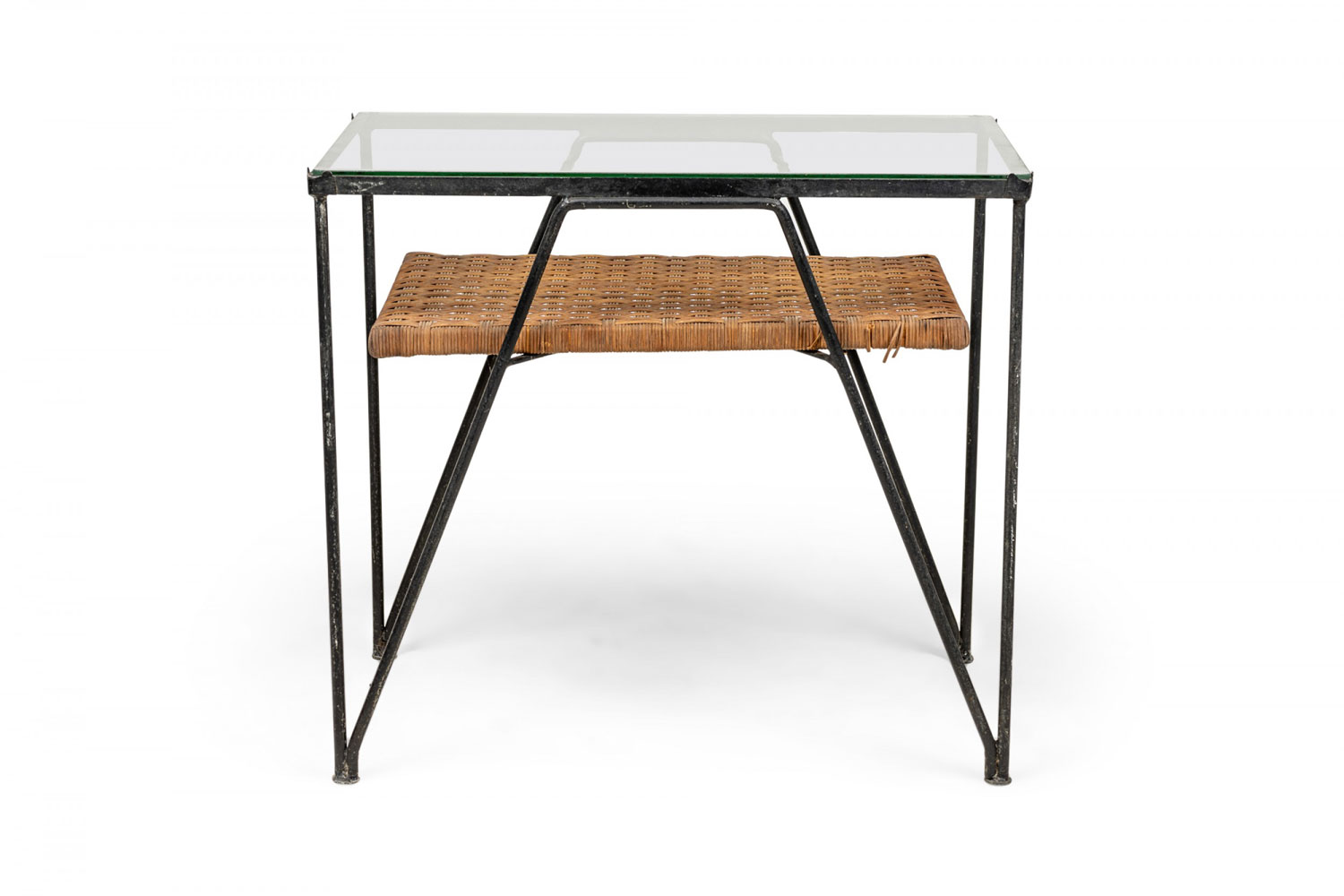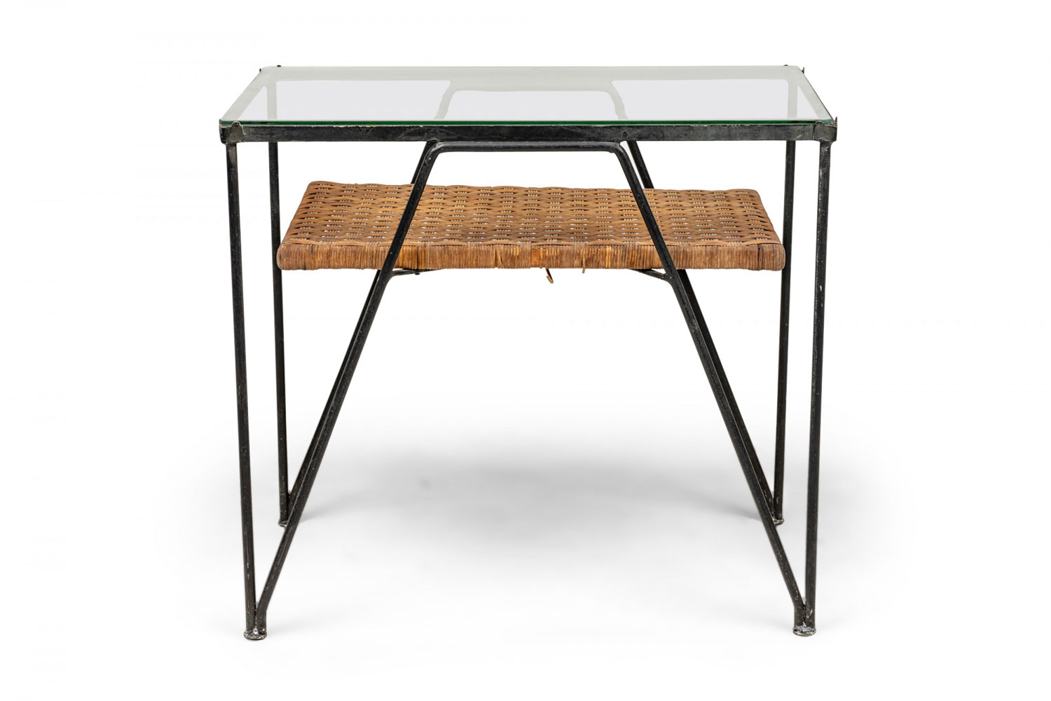 Mid-Century two-tiered, metal, rectangular end table in a minimalist design with glass top and basket woven rattan lower shelf, standing on four triangular supports. (MAURIZIO TEMPESTINI FOR JOHN SALTERINI)