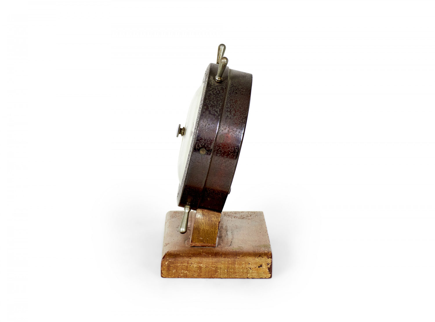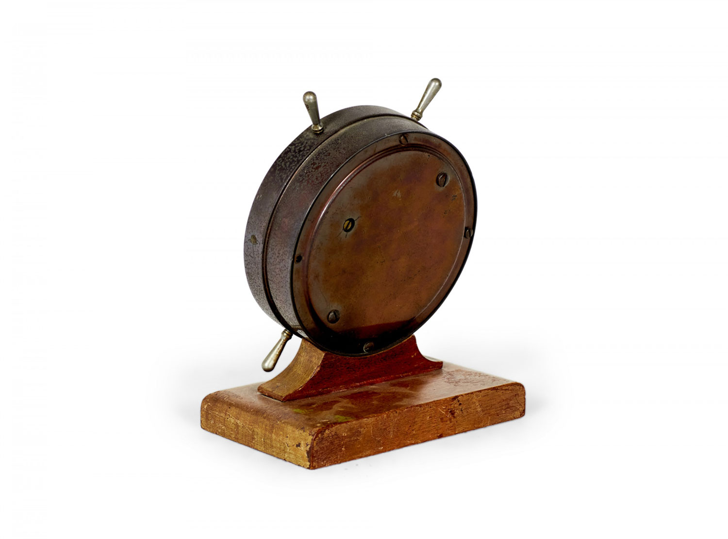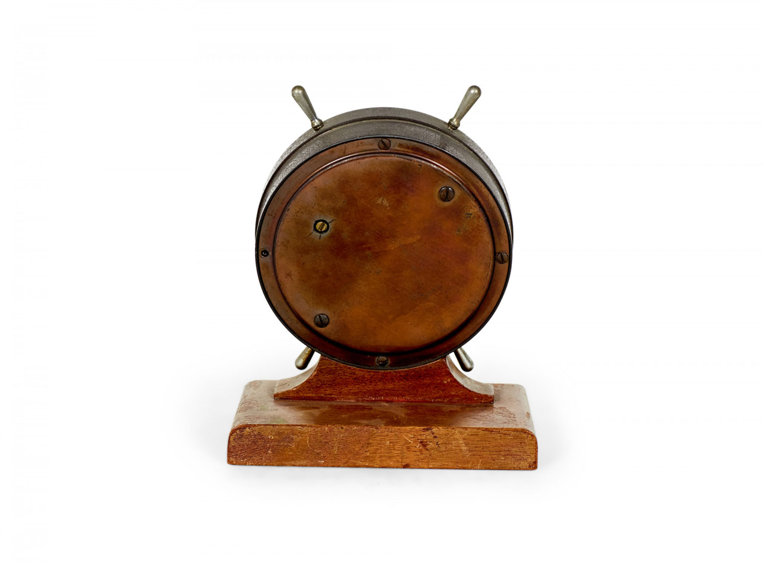 Small metal ship-wheel shaped barometer on rectangular wood base..