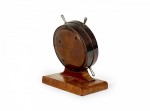 Small metal ship-wheel shaped barometer on rectangular wood base.