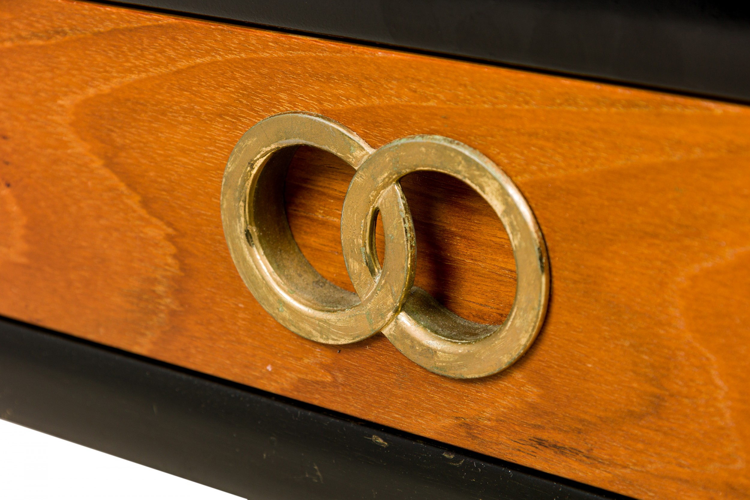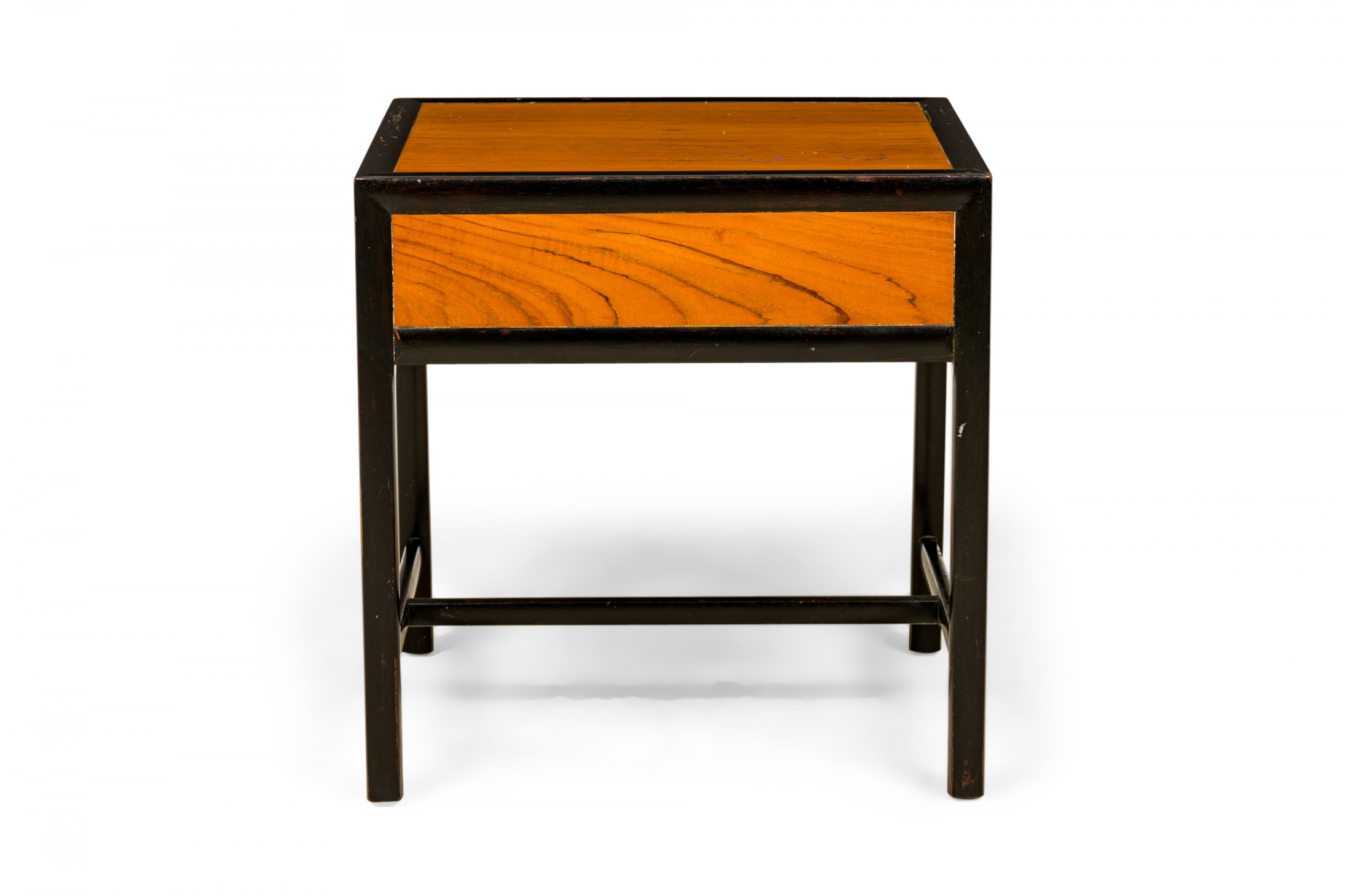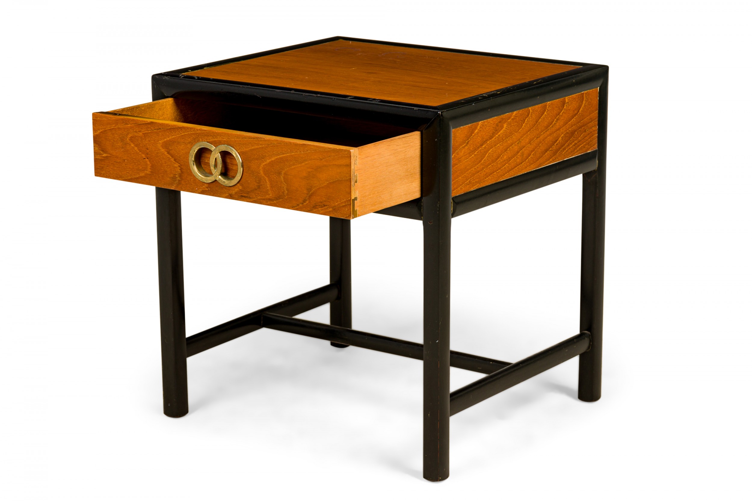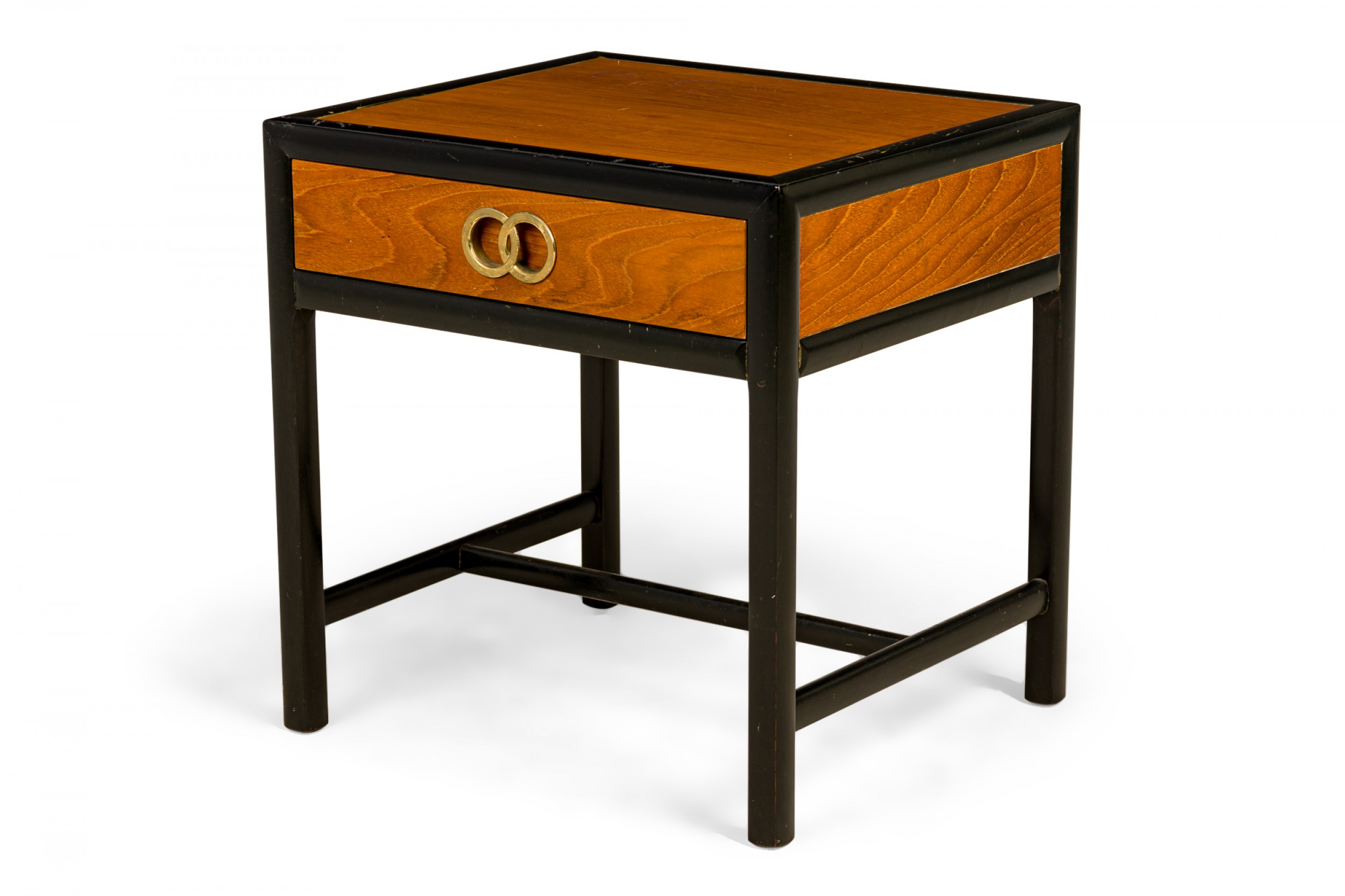 American Mid-Century rectangular nightstand / bedside table with a wooden top and drawer front with and interlocking ring design polished brass drawer pull in a black painted and lacquered frame with a stretcher base. (MICHAEL TAYLOR FOR BAKER FURNITURE COMPANY, NEW WORLD COLLECTION).
