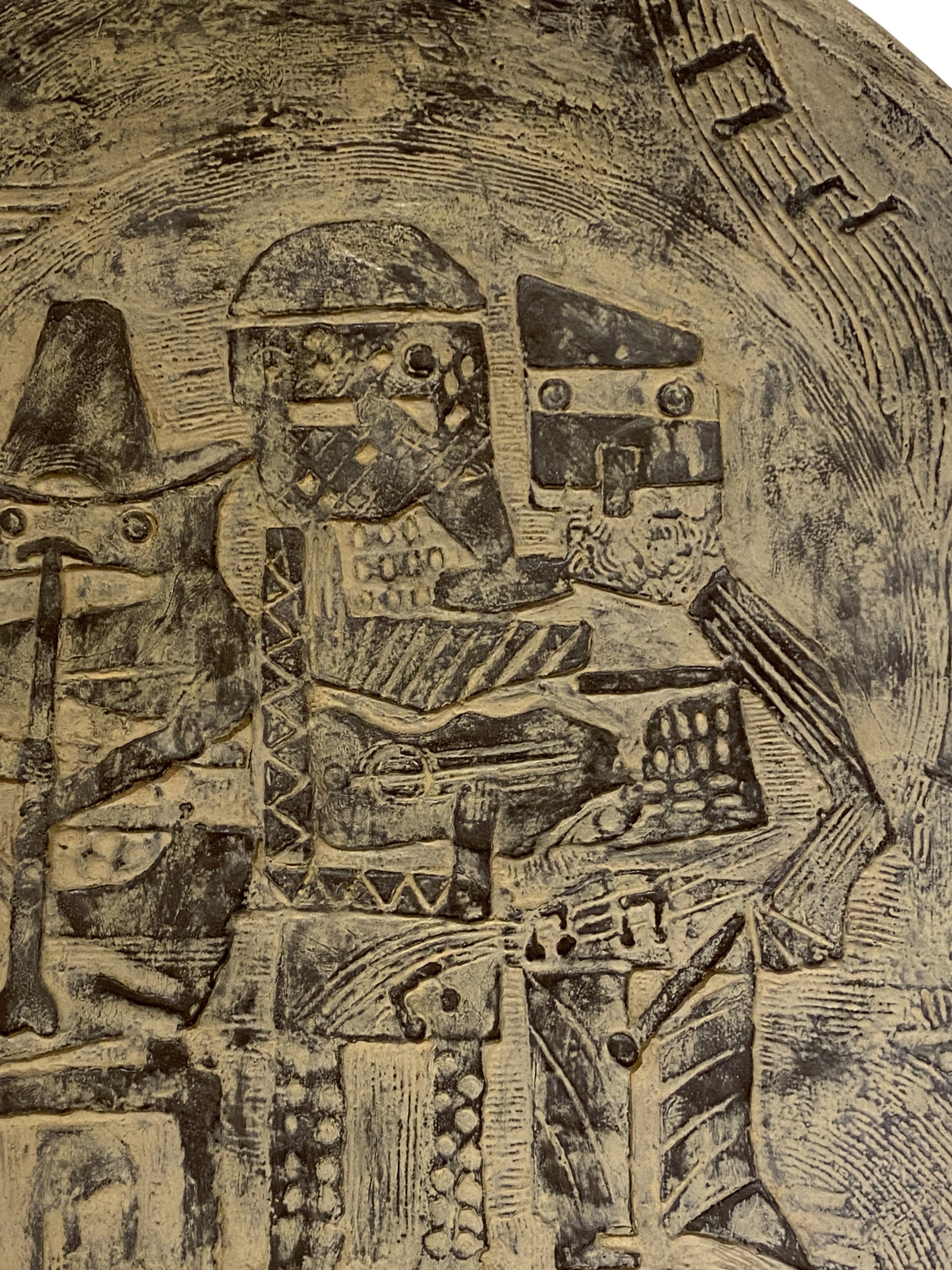 Brutalist Mid-century fiberglass wall hanging / plate with cerused coloring in a concave fiberglass form, modeled after Picasso's "The 3 Musicians" (Signature Unidentified).