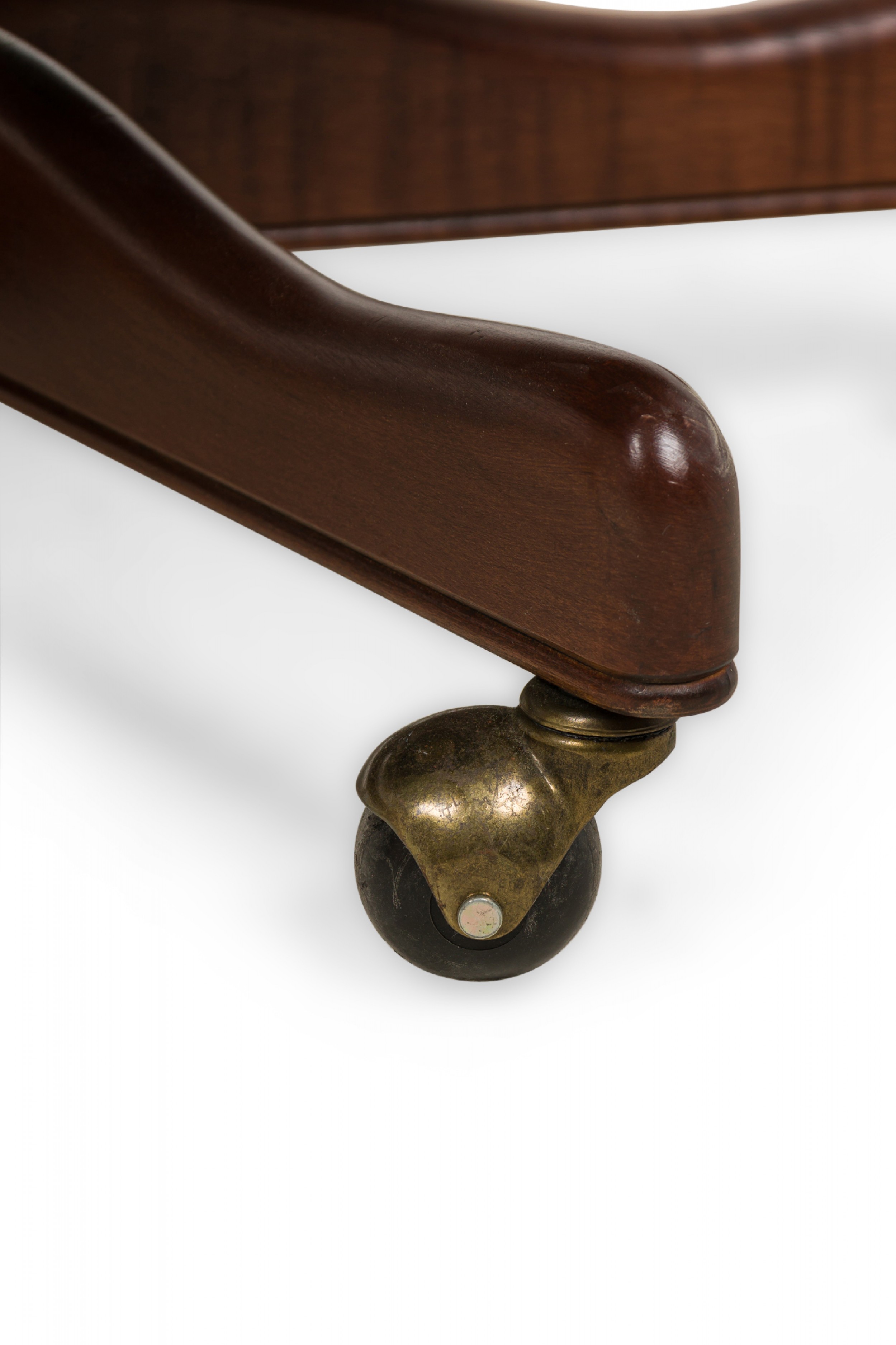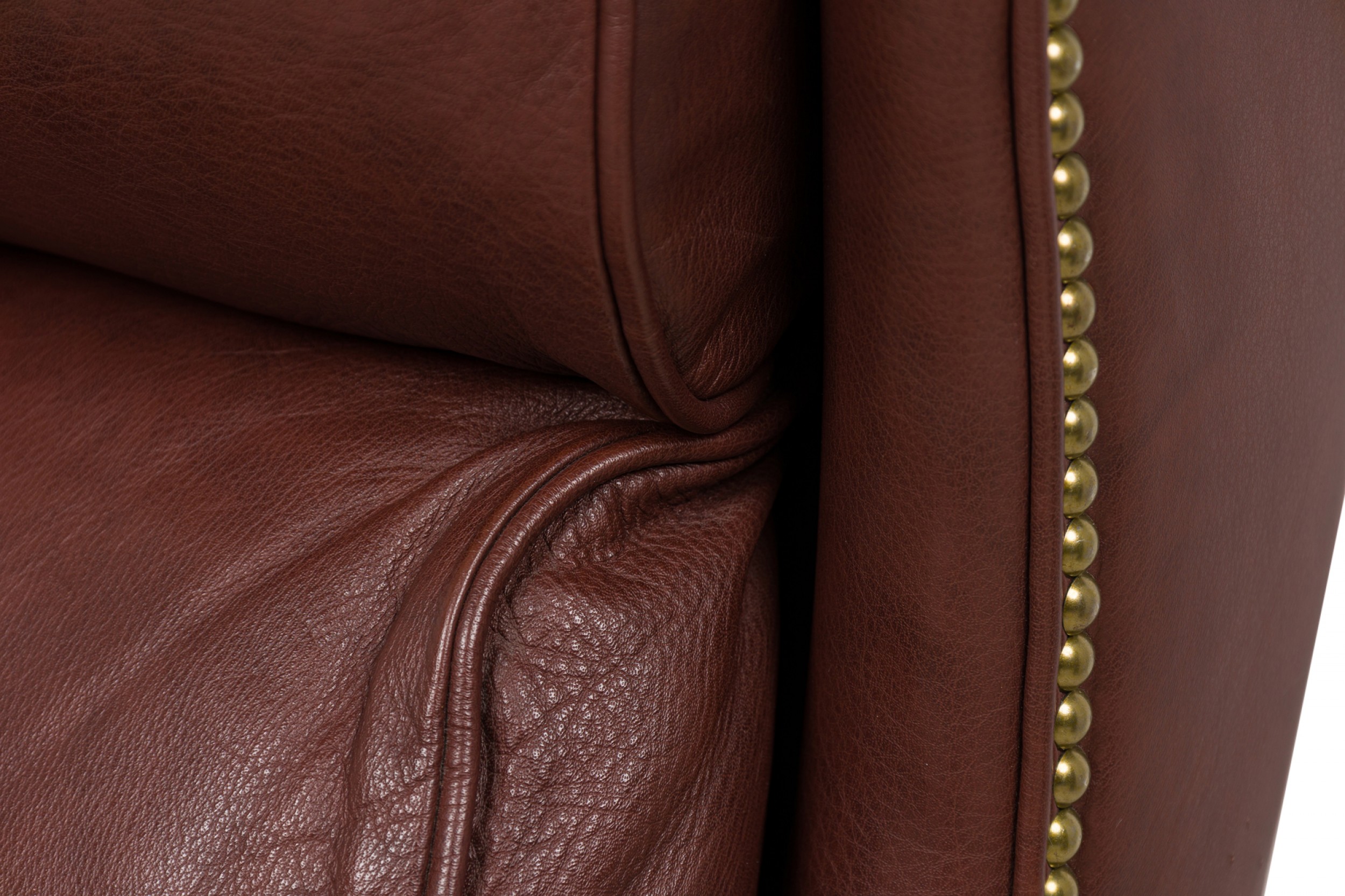 Mid-Century American wingback executive office chair upholstered in brown leather with rolled arms, brass nailhead trim and five leg swivel base with brass-cupped ball casters..