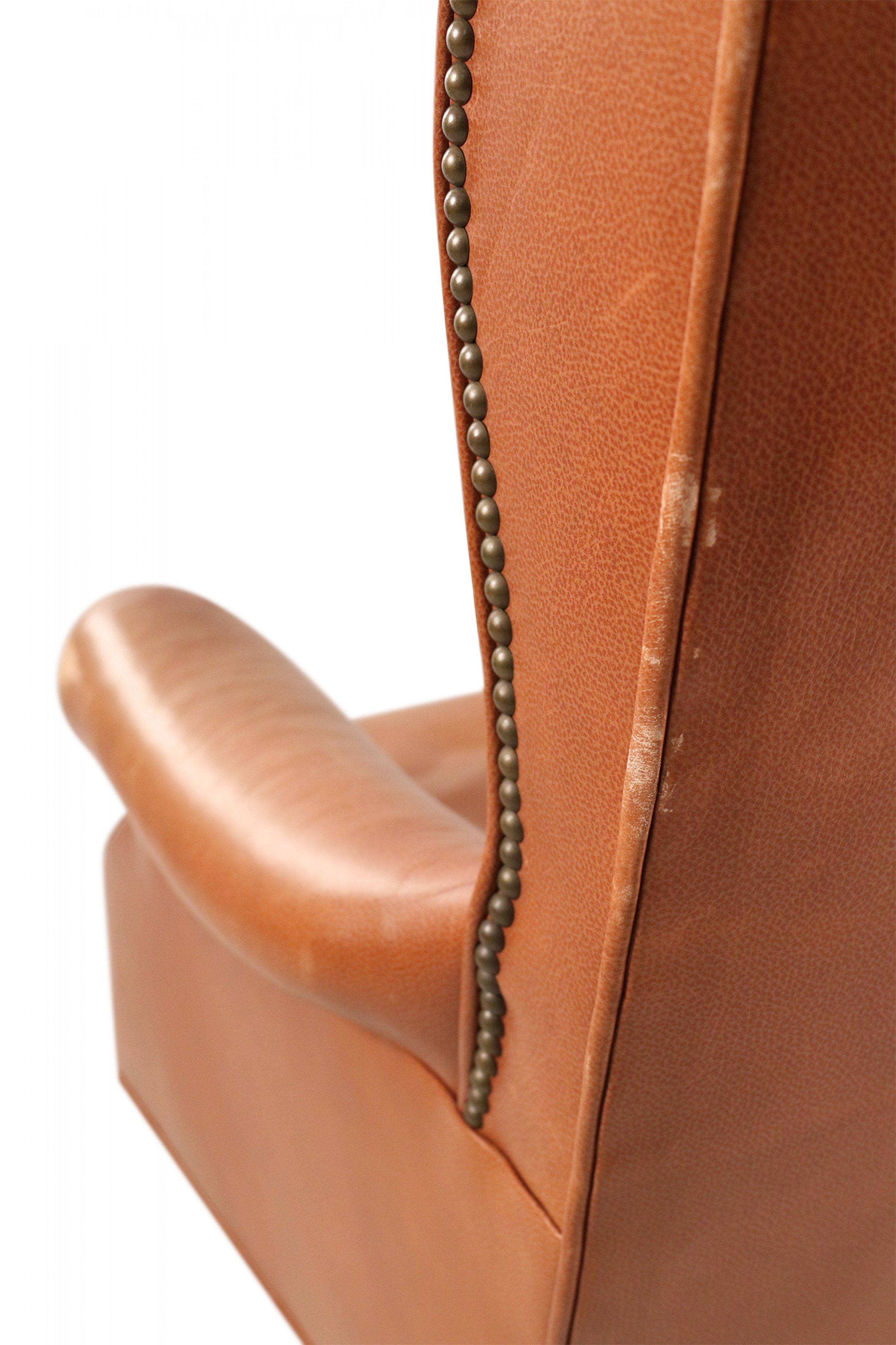 Mid-Century American brown tufted leather swivel office / wing armchair with brass upholstery nails and a wooden five leg rolling swivel base.