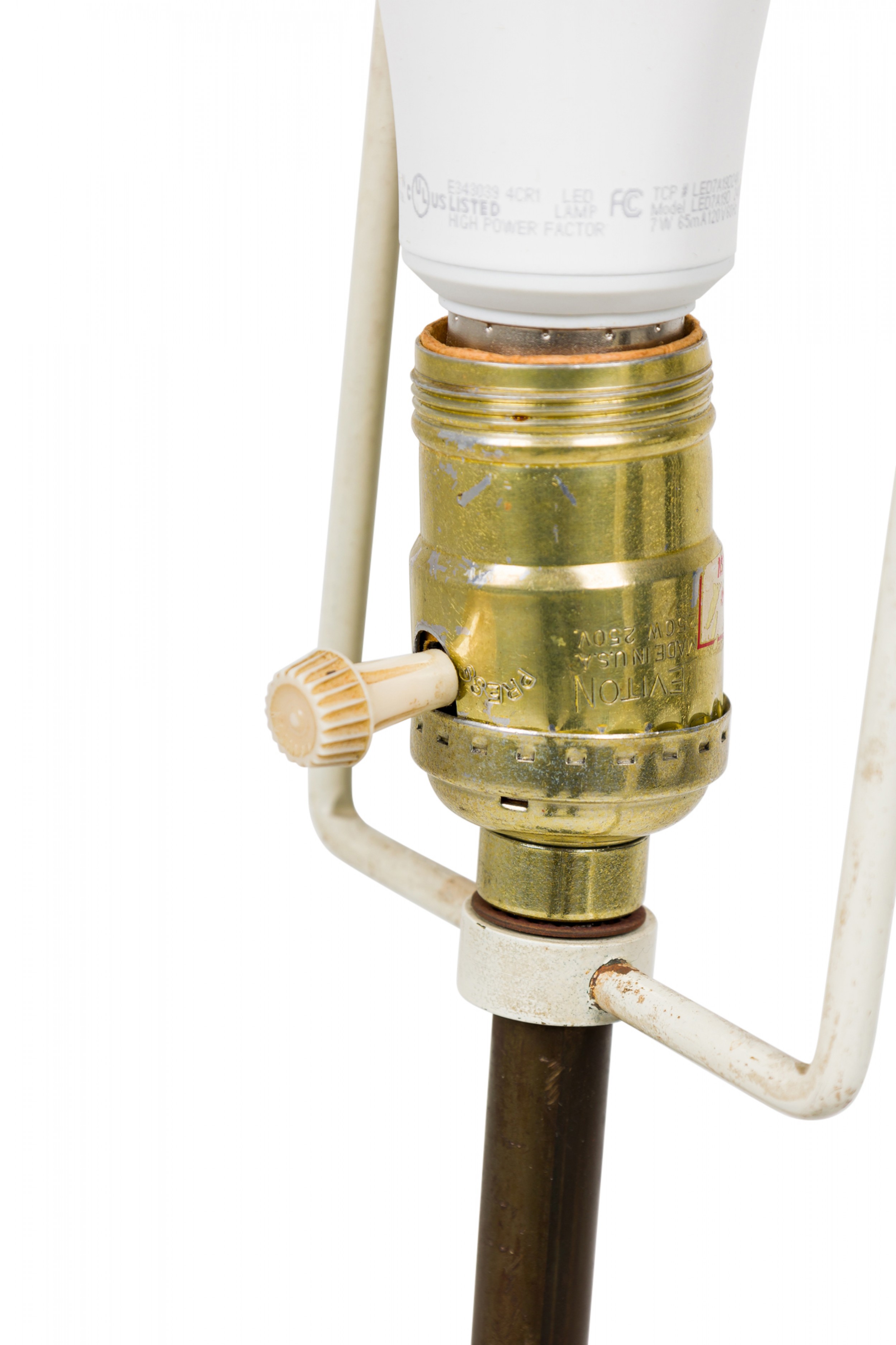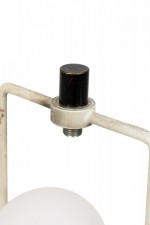 Style: Mid-Century Materials & Techniques: Fabric, iron, metal Category: Lighting Condition: Base 5" x 5", shade 14" W x 11" HT x 12"D Good; Wear consistent with age and use