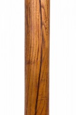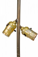 Style: Mid-Century Materials & Techniques: Brass, inlaid, metal, wood Category: Lighting Condition: Natural wood splits but body stable. Non-functioning, power cord deteriorating, needs rewiring. No finial. Ships without shade. Good; Wear consistent with age and use