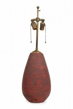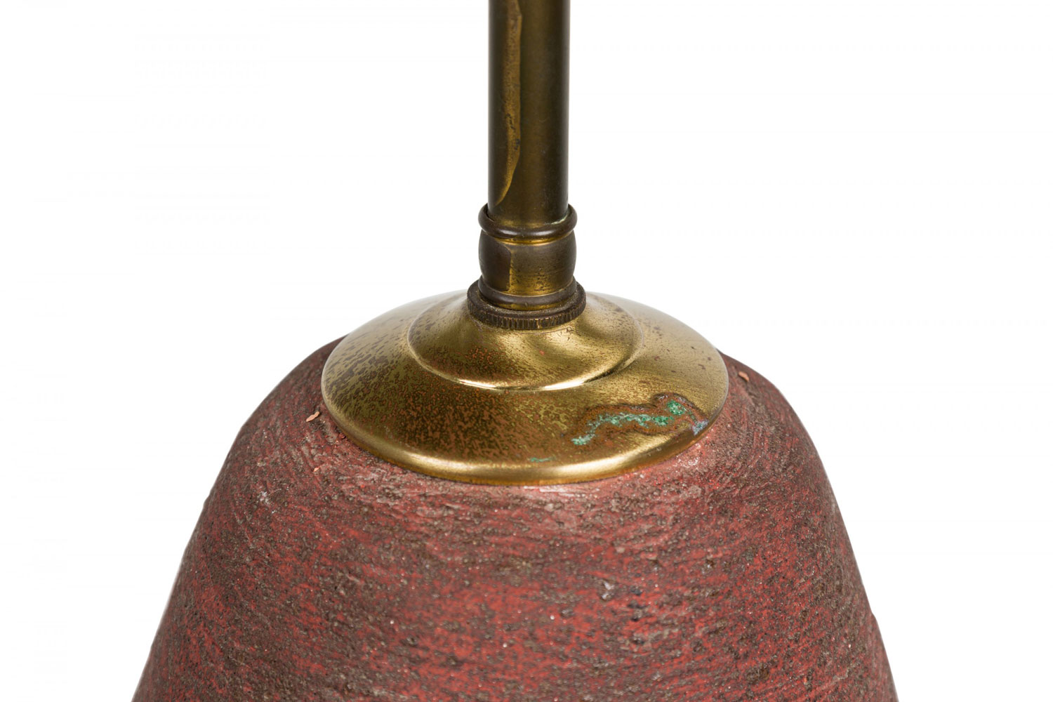 Mid-Century American ceramic table lamp horizontally textured and fired in a brick red glaze, in tapered organic ovoid form, topped by a brass stem and ball finial, two functioning light sockets with beaded pulls plus an on / off switch attached to the power cord.