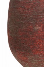 Mid-Century American ceramic table lamp horizontally textured and fired in a brick red glaze, in tapered organic ovoid form, topped by a brass stem and ball finial, two functioning light sockets with beaded pulls plus an on / off switch attached to the power cord..
