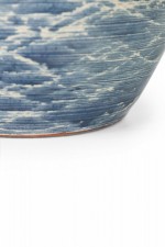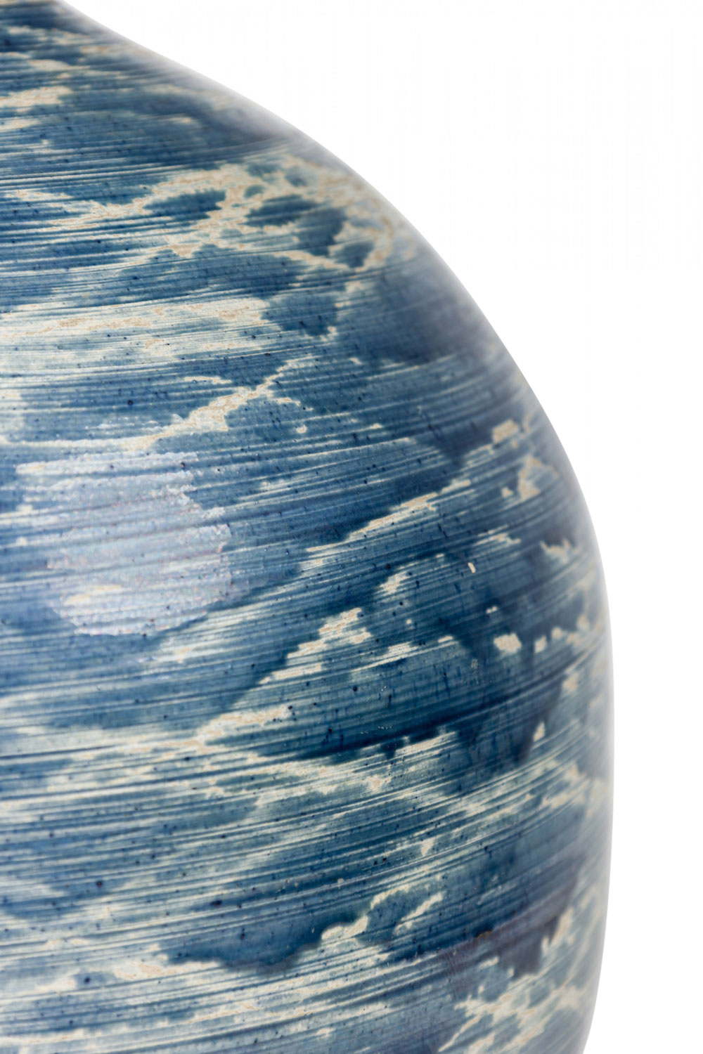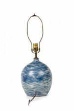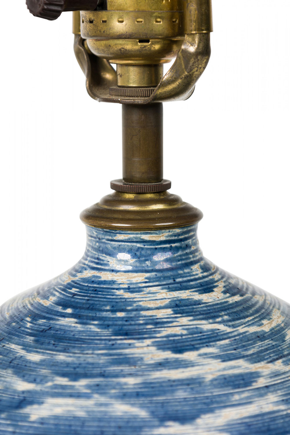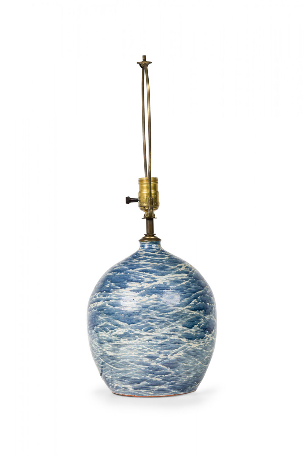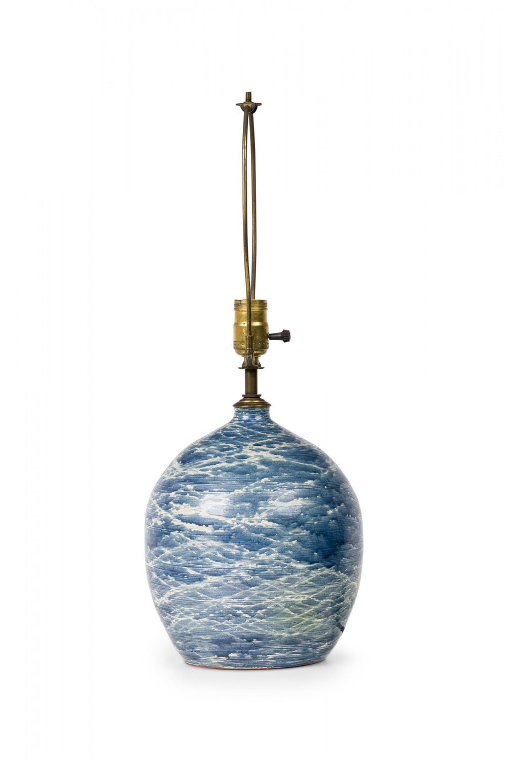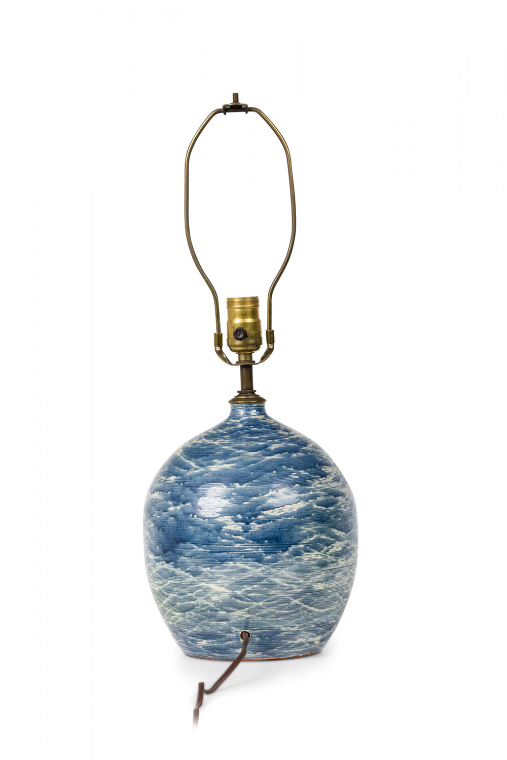 Mid-Century American ceramic table lamp in globular form with pinched neck, leading to a functioning brass light switch socket and harp, the body formed with a concentric finely ridged texture, hand painted and fired in a blue glaze, resembling the sky.