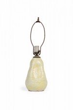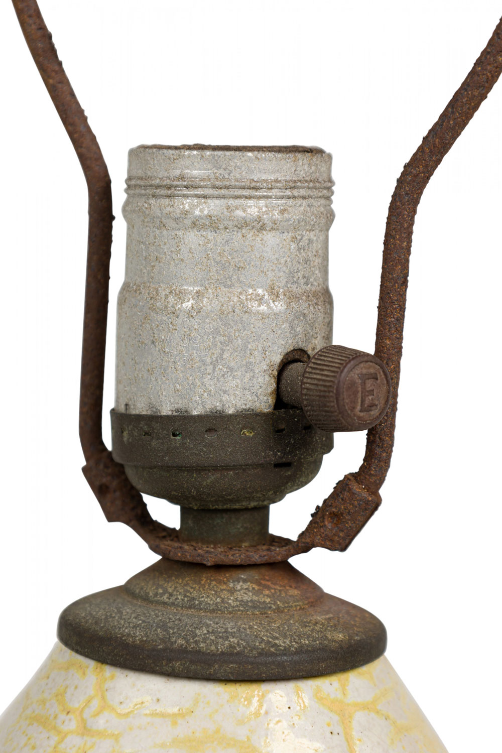 Style: Mid-Century Materials & Techniques: Ceramic, metal Category: Lighting Condition: 19.75" height with harp & finial. Metal corroded, needs rewiring & new felt bottom. Ships without shade. Good; Wear consistent with age and use