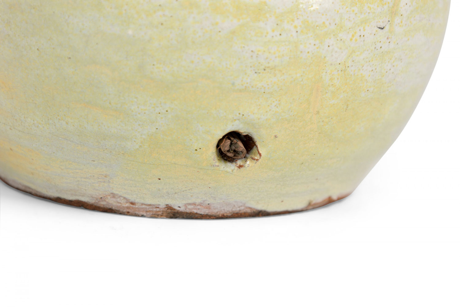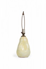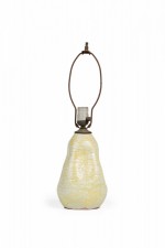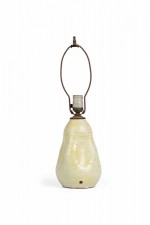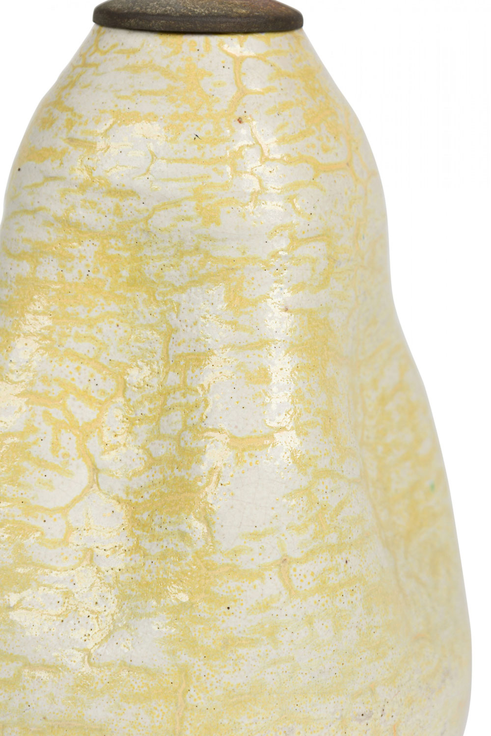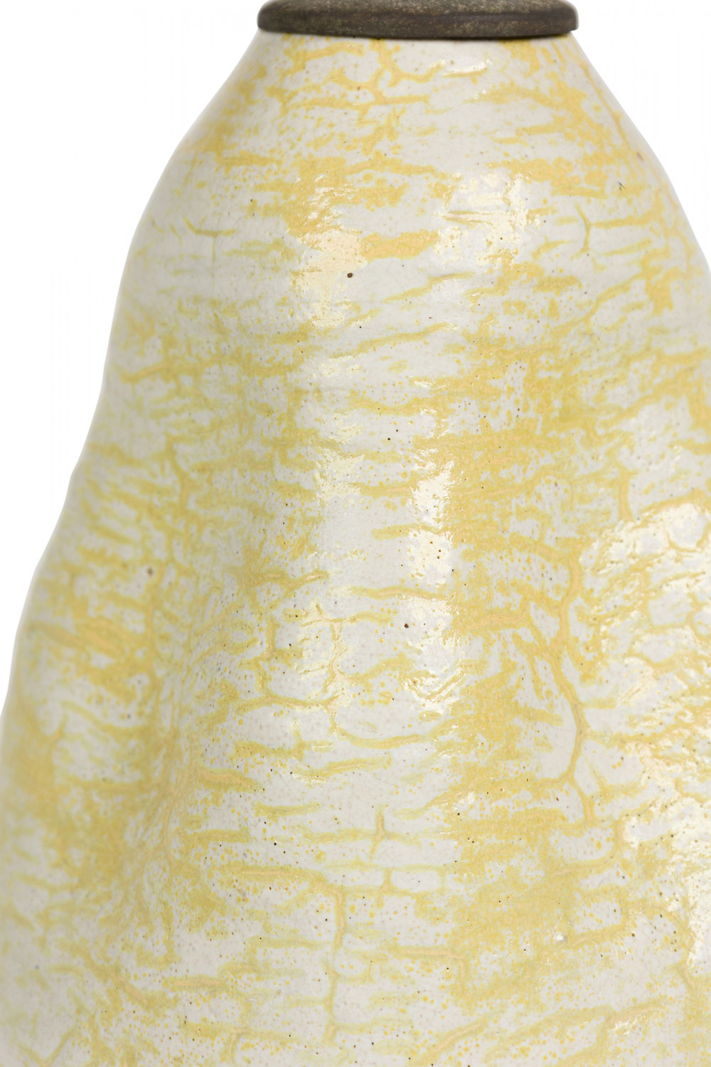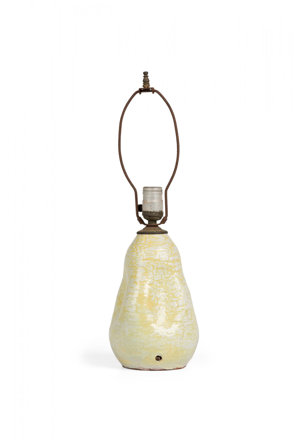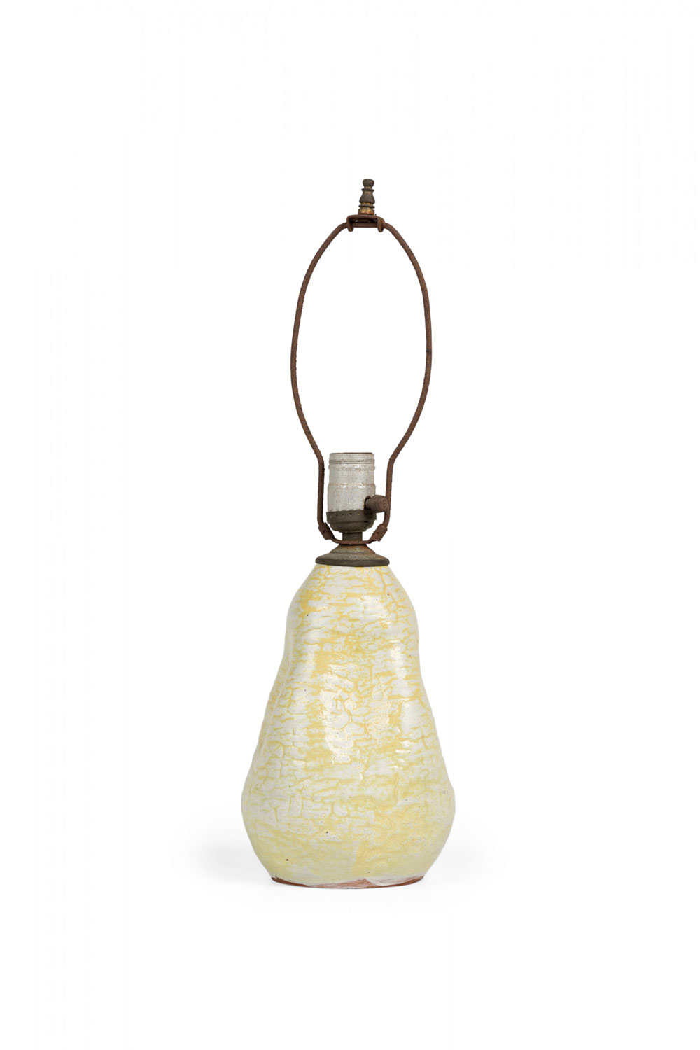 Mid-Century American ceramic table lamp in pinched organic form with a metal cap, harp, finial and nonfunctioning light switch socket, fired in a thin semi-gloss glaze of buttery popcorn-like white and canary yellow concentration settling in the crevices.