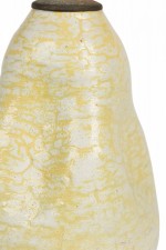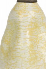 Mid-Century American ceramic table lamp in pinched organic form with a metal cap, harp, finial and nonfunctioning light switch socket, fired in a thin semi-gloss glaze of buttery popcorn-like white and canary yellow concentration settling in the crevices..