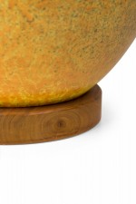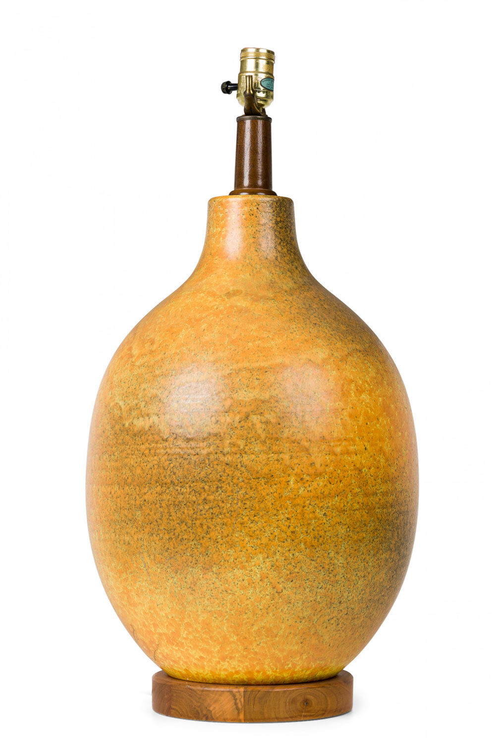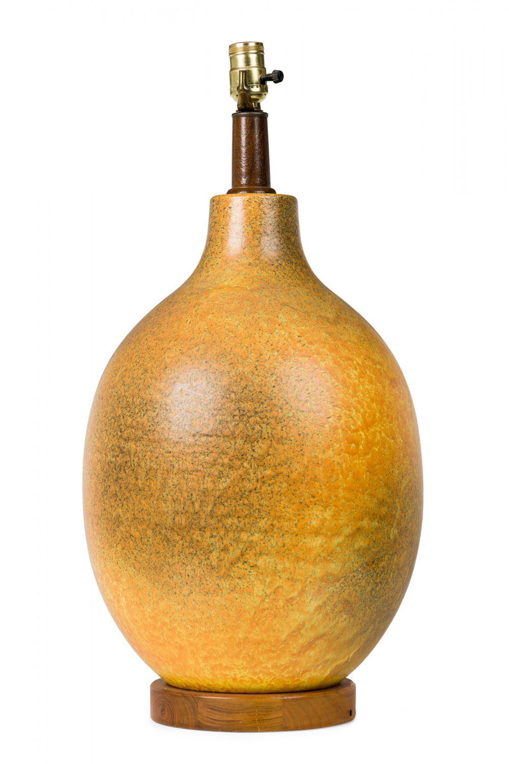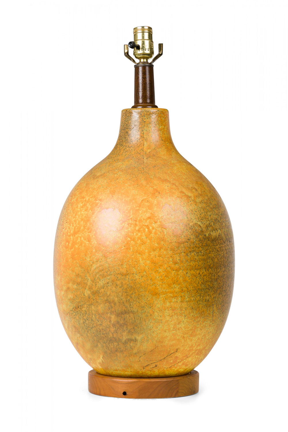 Mid-Century American egg-shaped ovoid ceramic table lamp with a flared tapered neck and embedded wood stem connected to a functioning brass light switch socket, the body fired in a stippled yellow / orange glaze with contrasting speckles, mounted on a flattened wood circular stand in a light veneer.