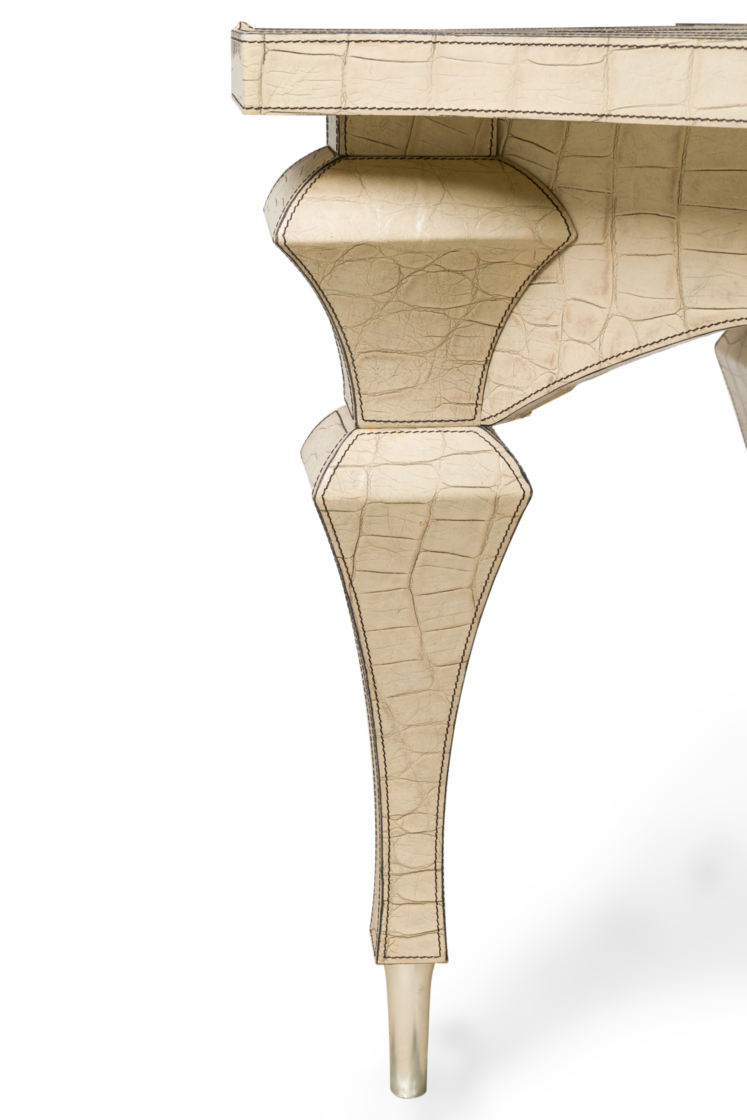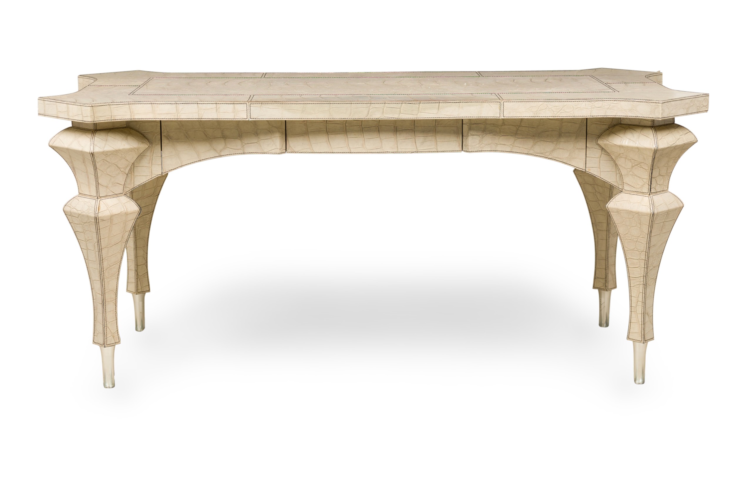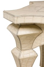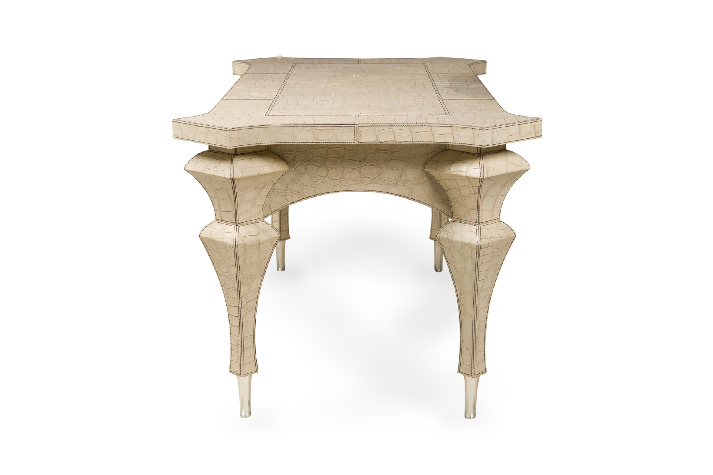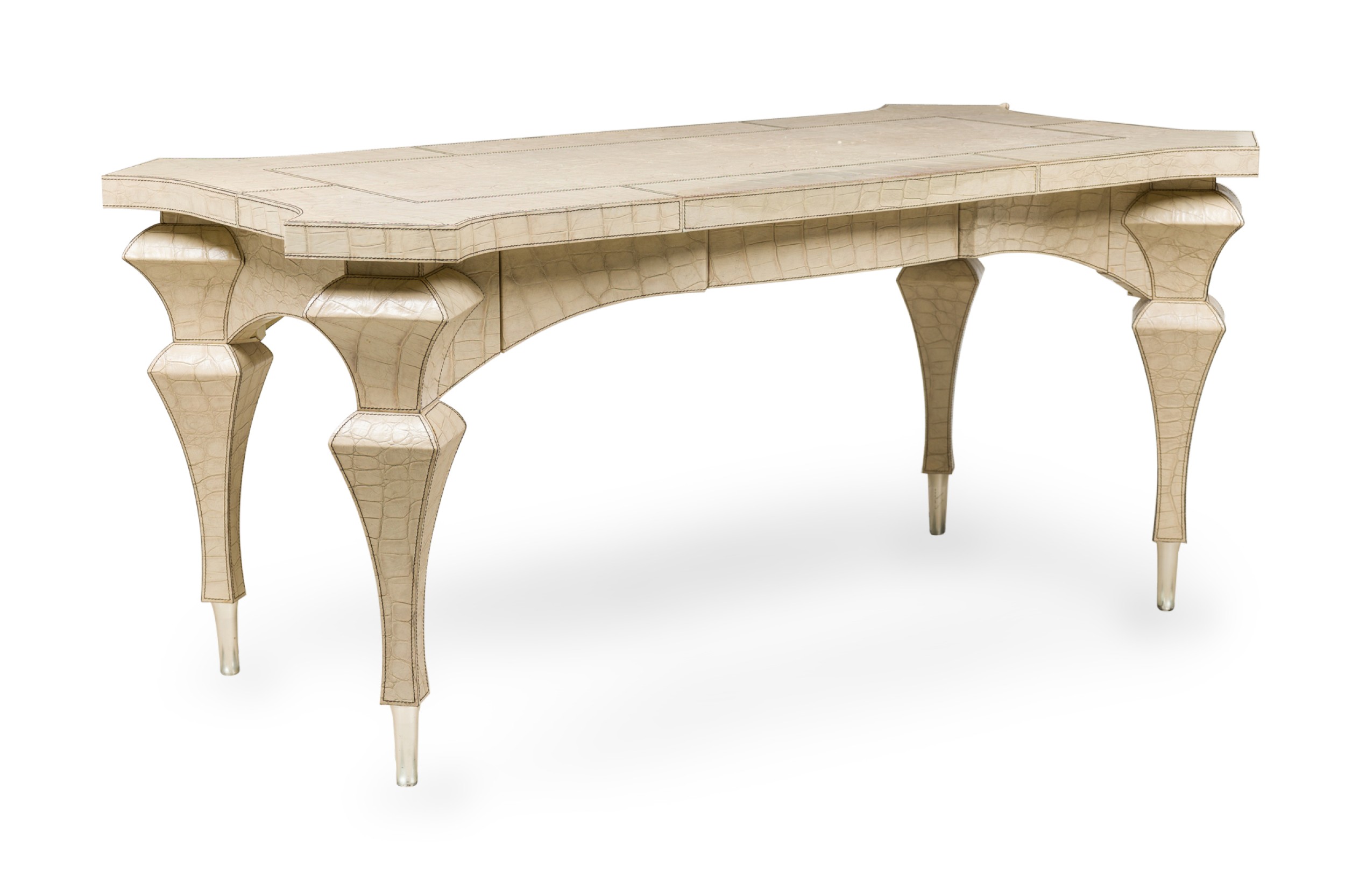 Mid-Century American table desk having an embossed off-white faux reptile leather veneer featuring a shaped top with canted corners and matching sculptural legs resting on 4 exposed silver metal tapered legs. (KARL SPRINGER) (Companion pieces: REG4872, REG5081, REG4872)