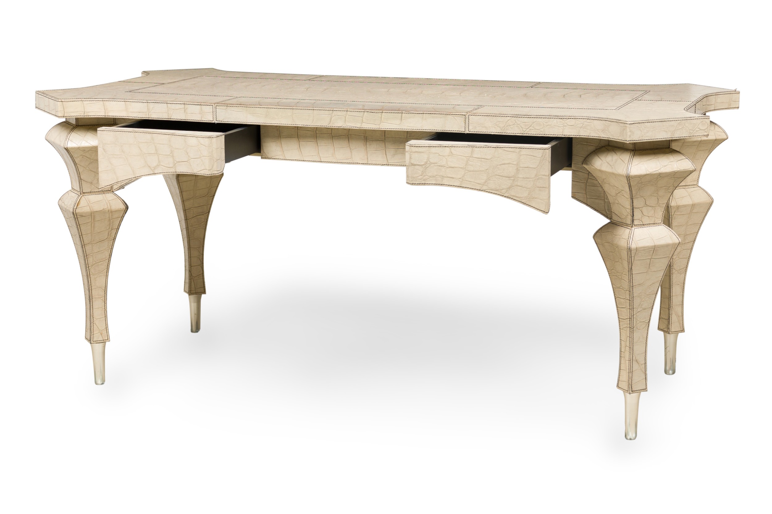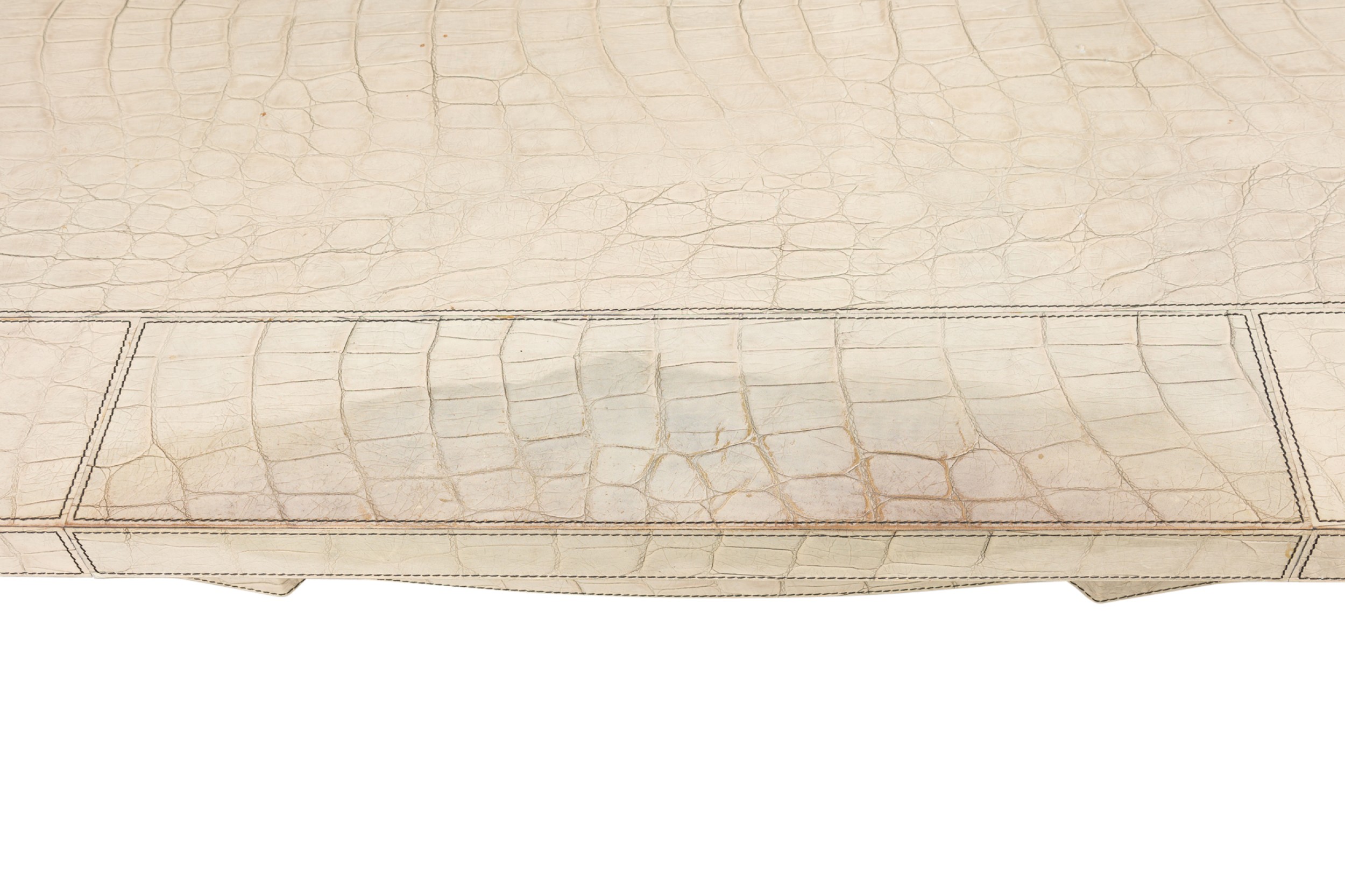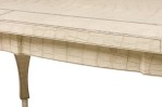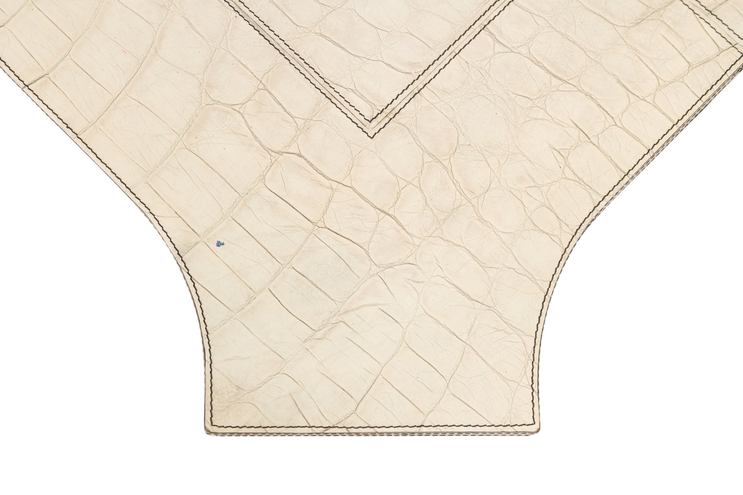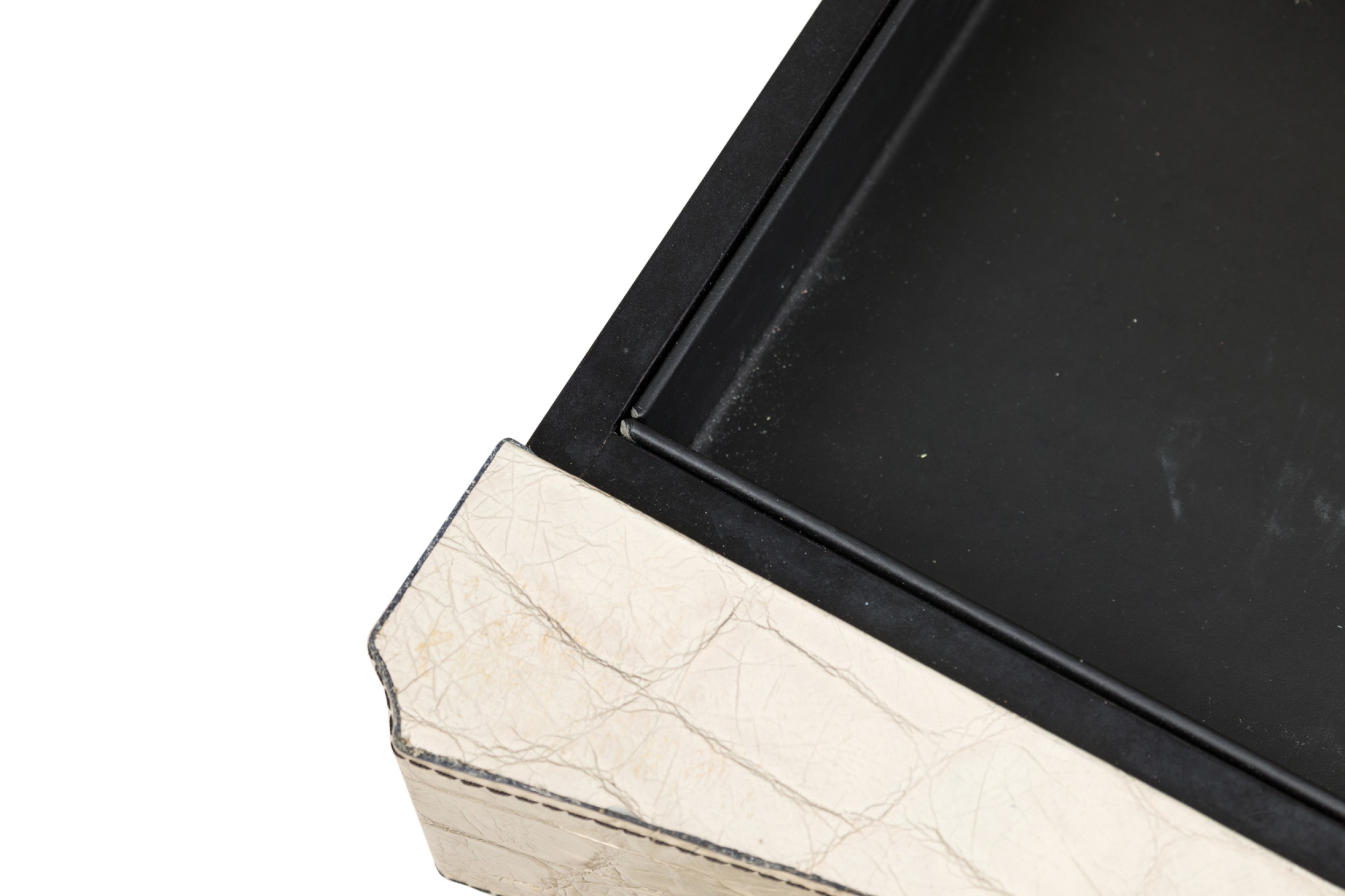 Mid-Century American table desk having an embossed off-white faux reptile leather veneer featuring a shaped top with canted corners and matching sculptural legs resting on 4 exposed silver metal tapered legs. (KARL SPRINGER) (Companion pieces: REG4872, REG5081, REG4872)