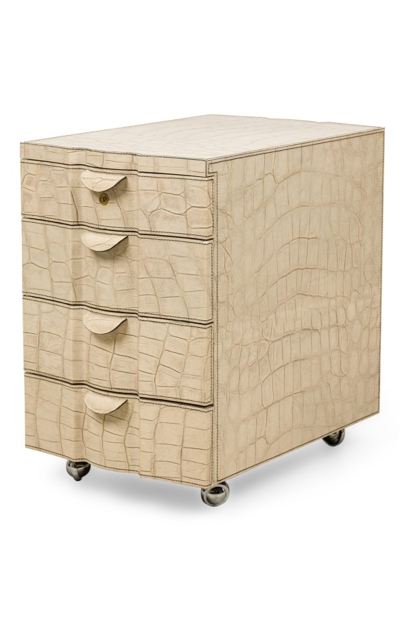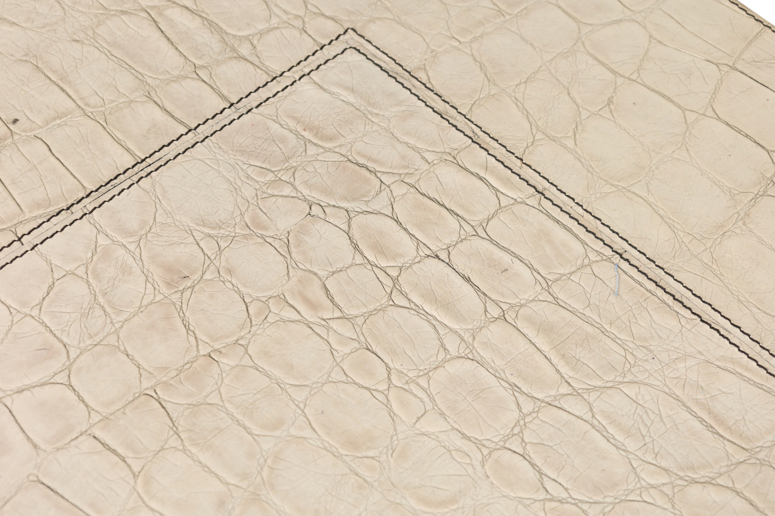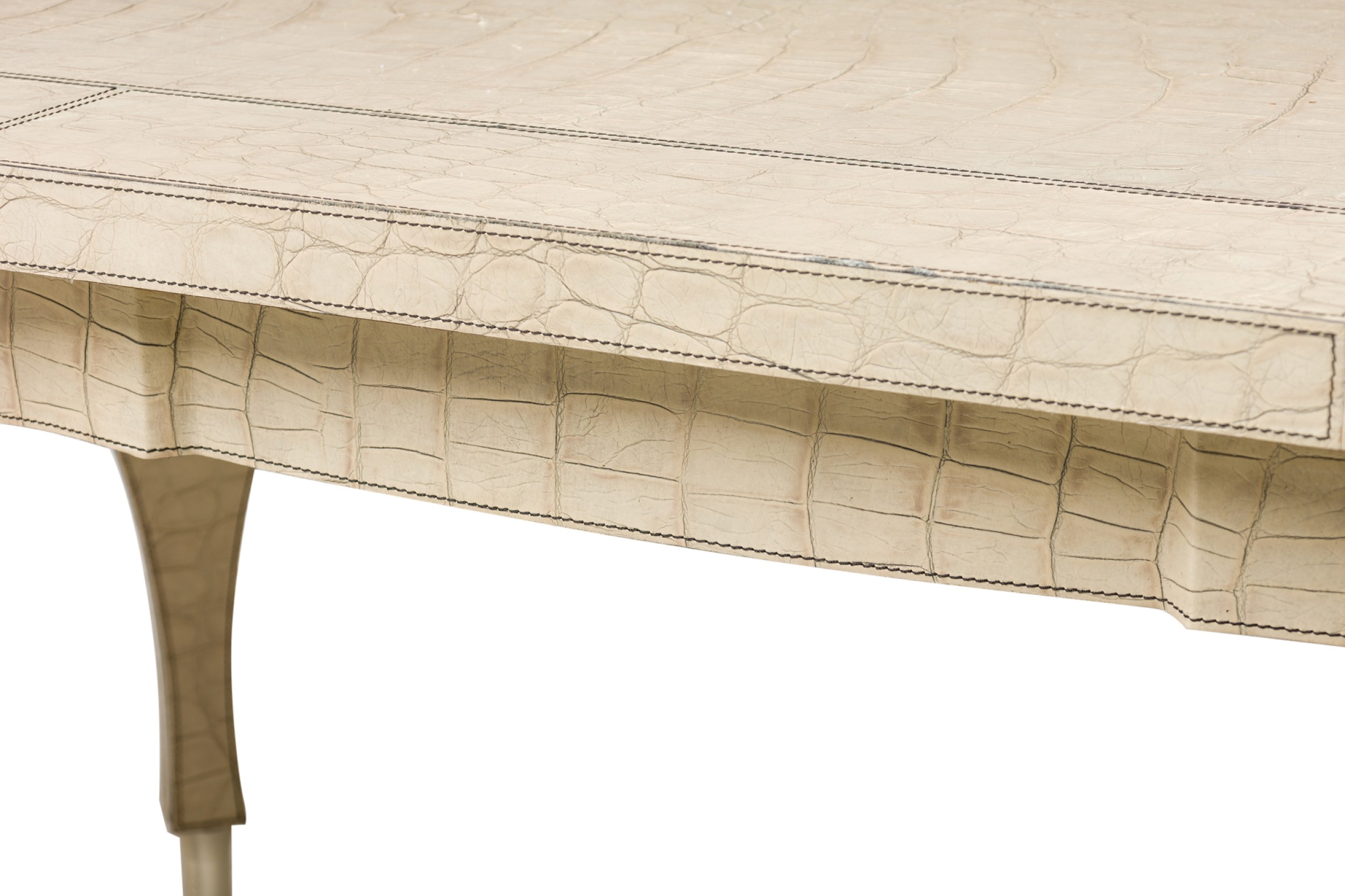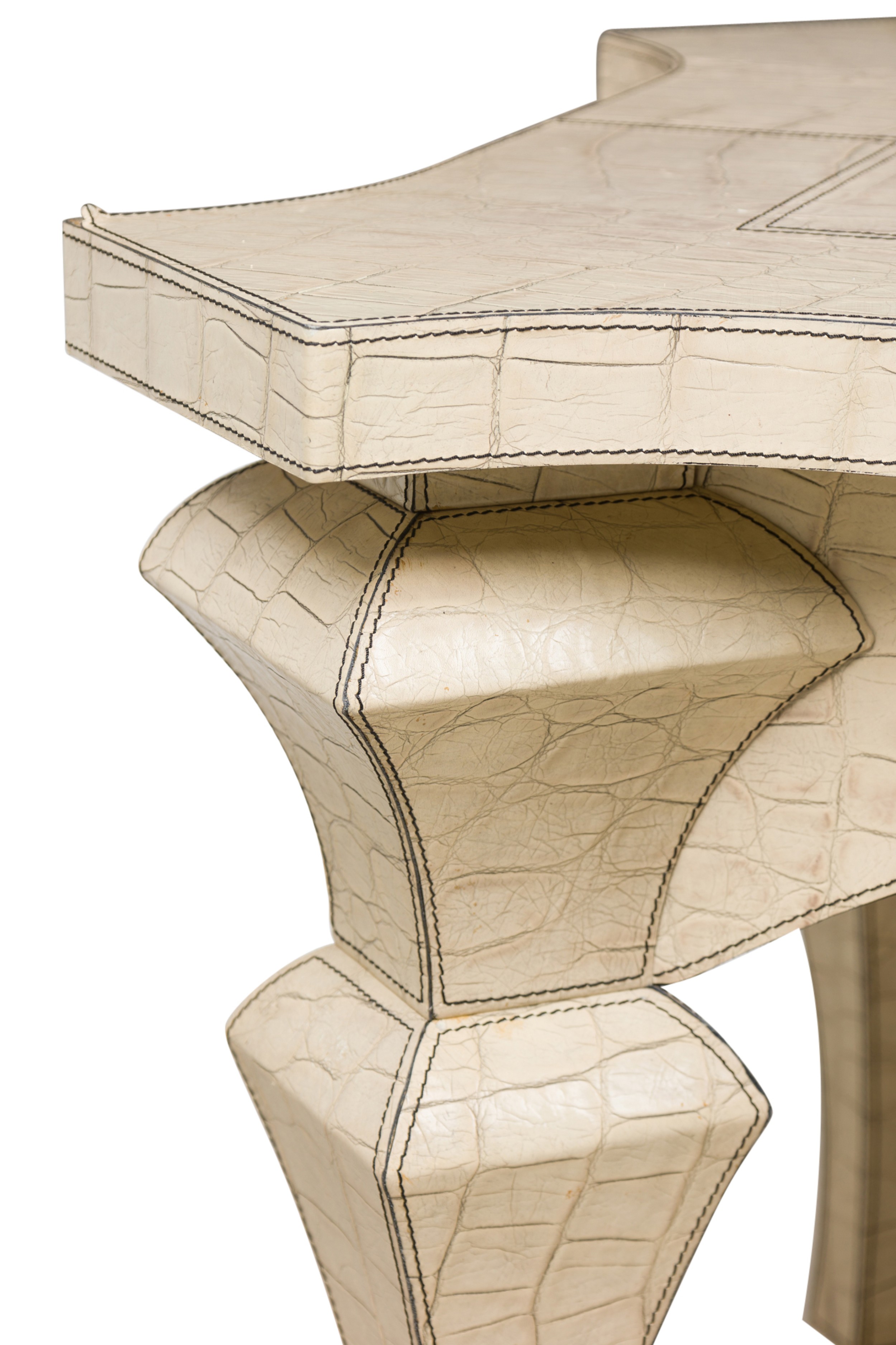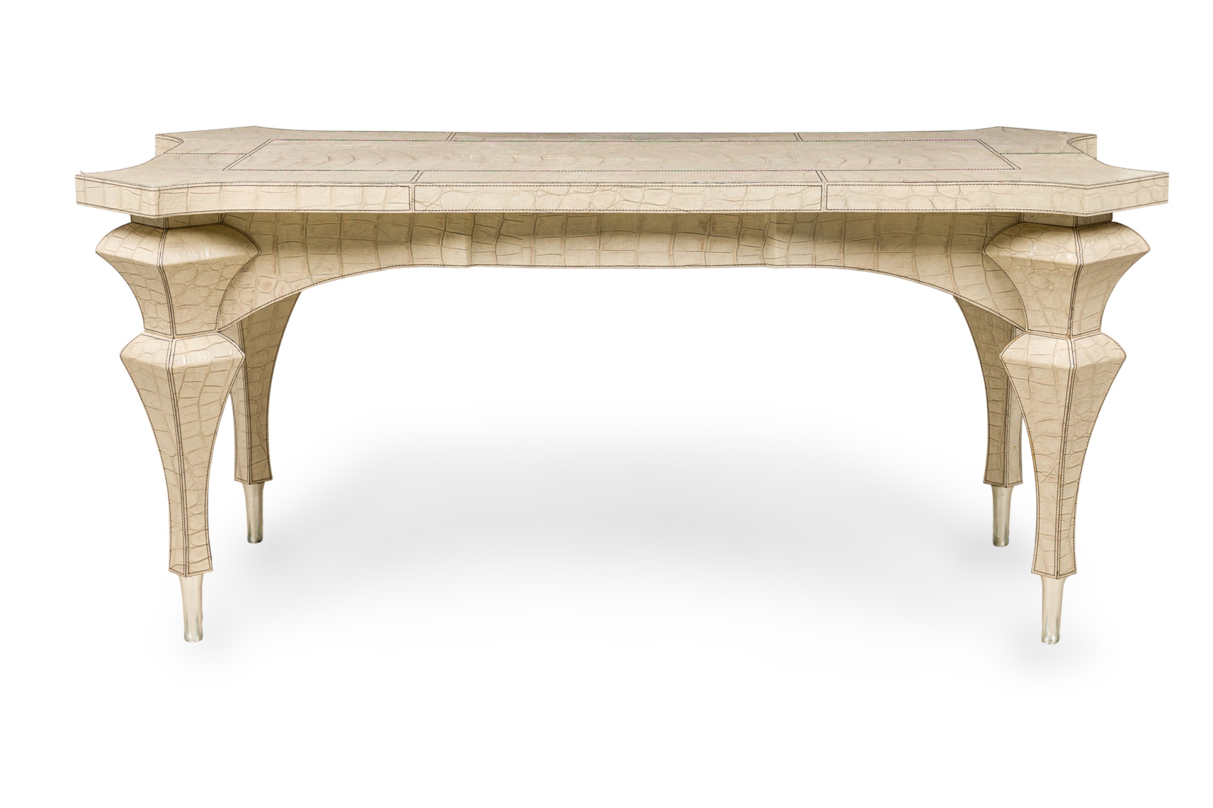 Mid-Century American table desk having an embossed off-white faux reptile leather veneer featuring a shaped top with canted corners and matching sculptural legs resting on 4 exposed silver metal tapered legs. (KARL SPRINGER) (Companion pieces: REG4872, REG5081, REG4872)