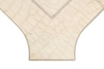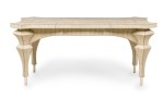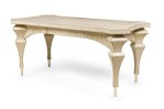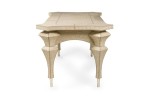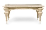 Mid-Century American table desk having an embossed off-white faux reptile leather veneer featuring a shaped top with canted corners and matching sculptural legs resting on 4 exposed silver metal tapered legs. (KARL SPRINGER) (Companion pieces: REG4872, REG5081, REG4872).