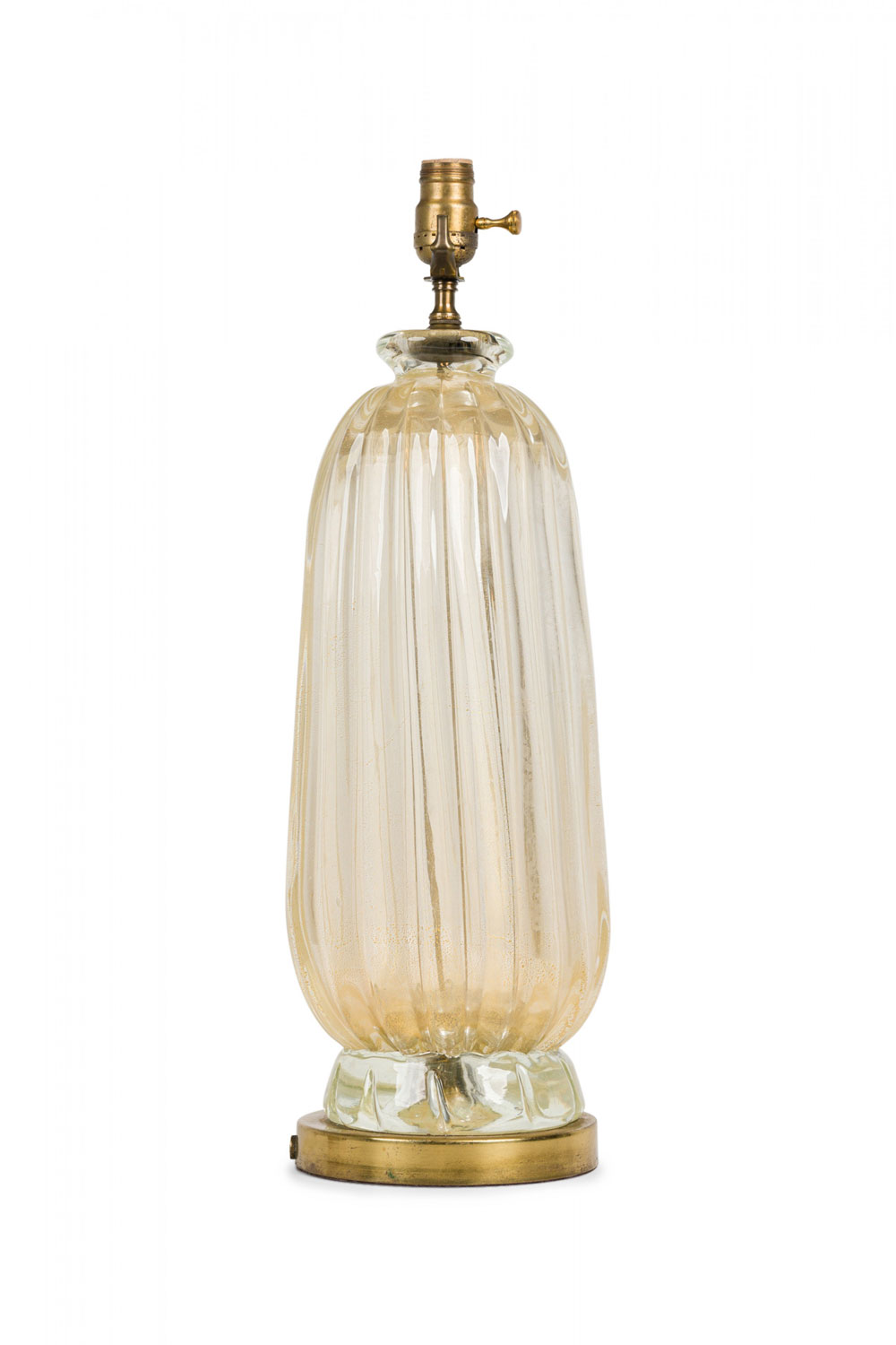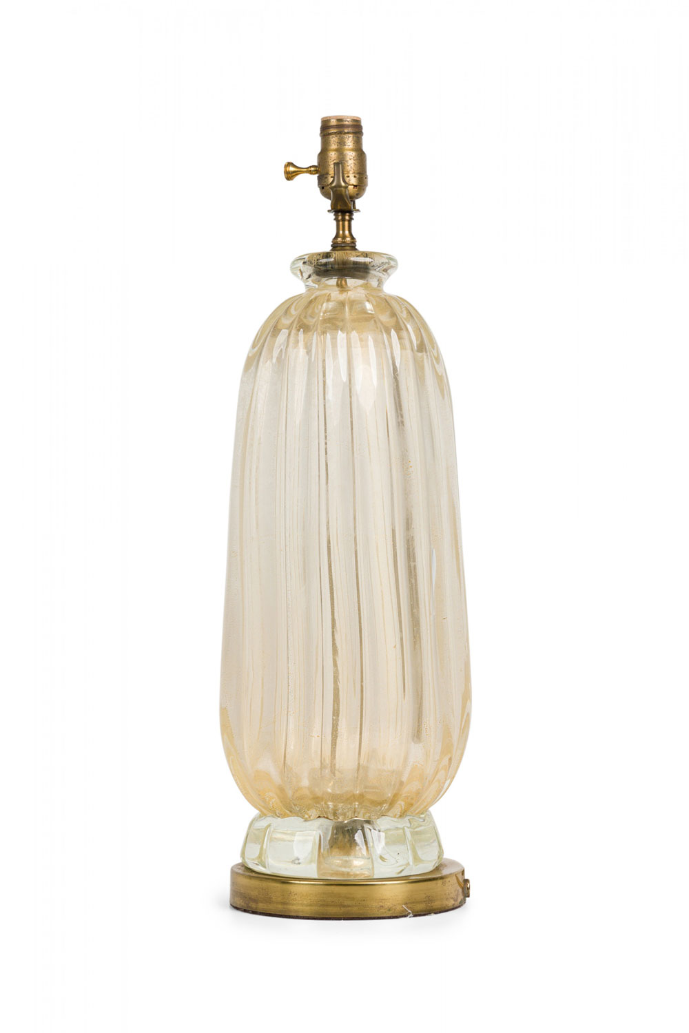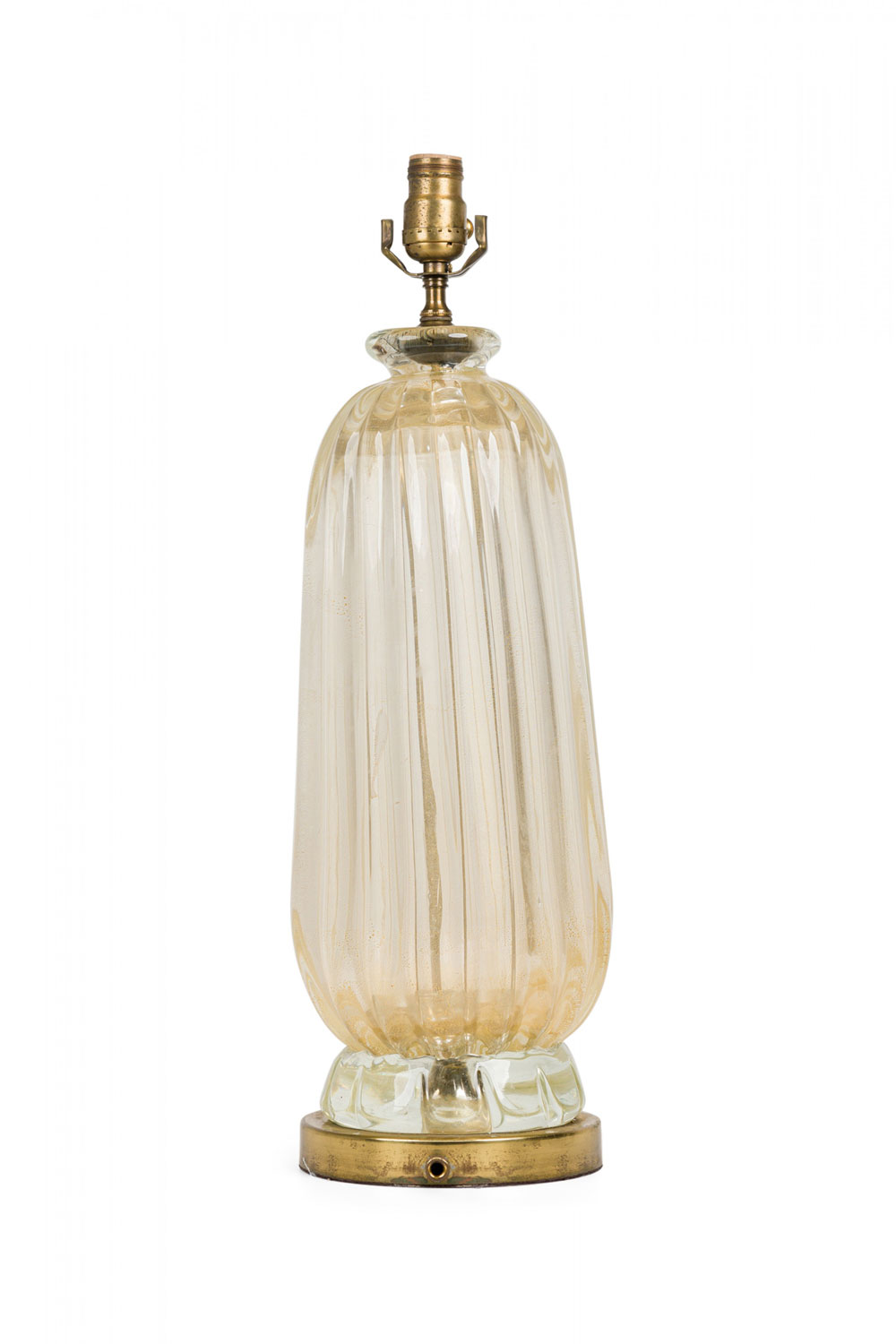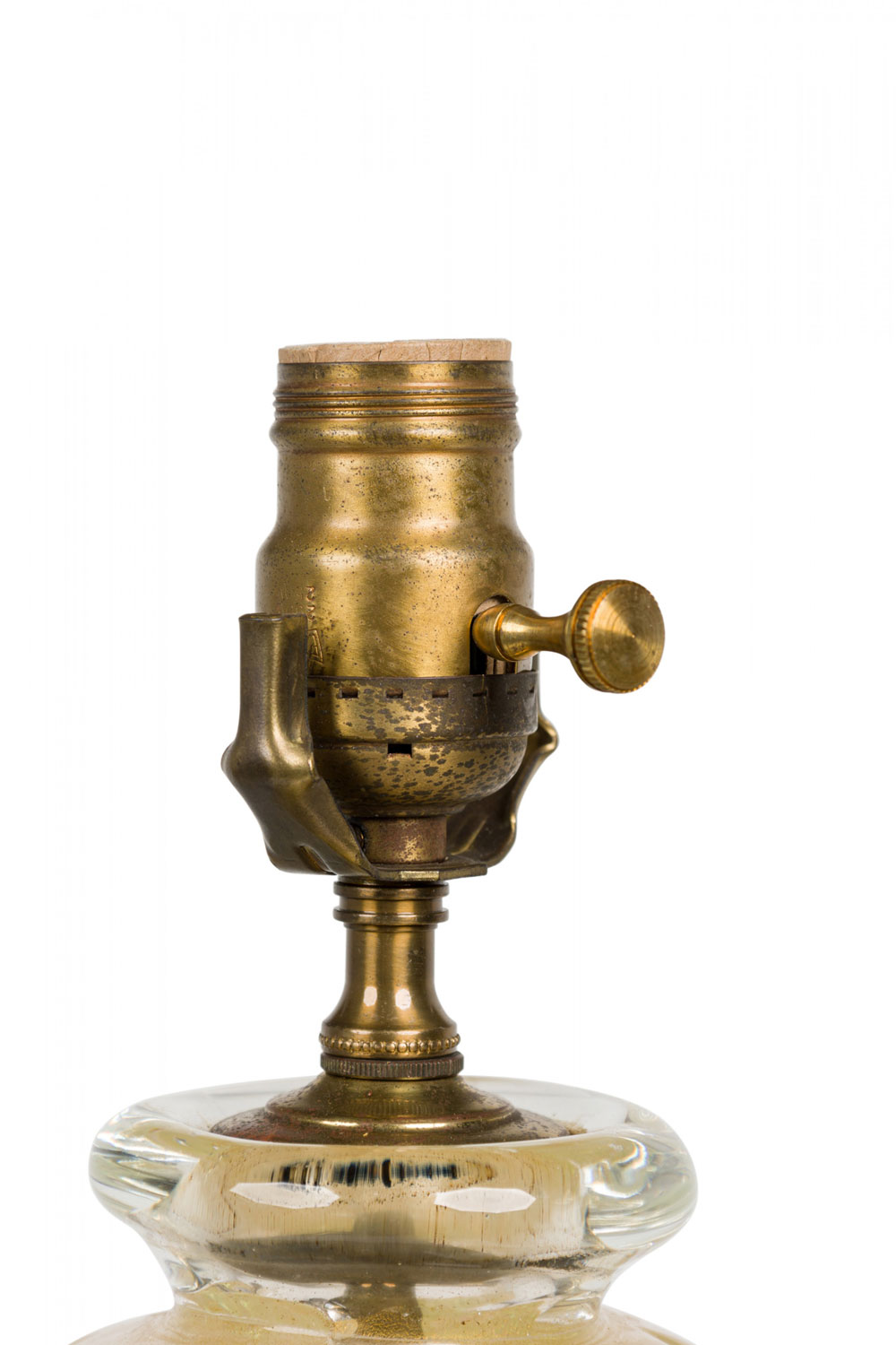 Mid-Century American glass table lamp in lobed tapered ovoid form with a waisted pinched neck and extended functioning brass light switch socket, resting on a tapered bottom foot, mounted on a gilt metal flattened circular base.