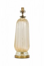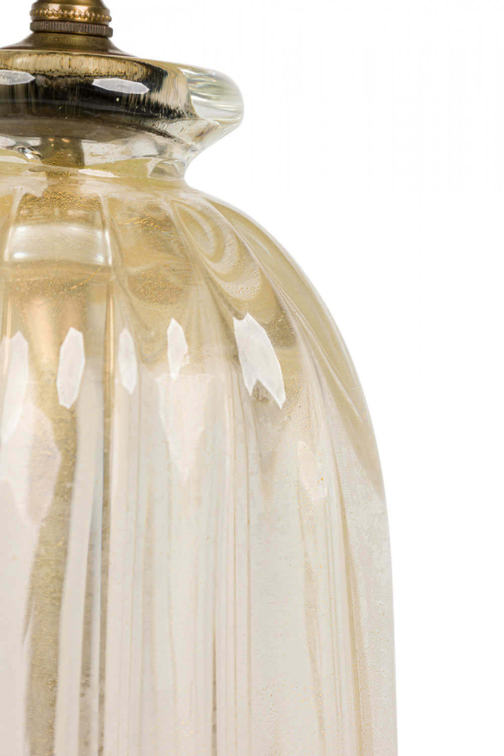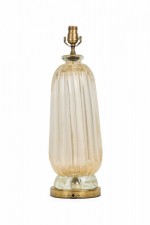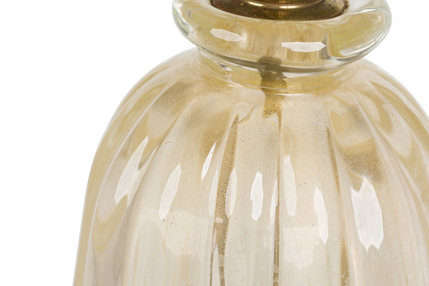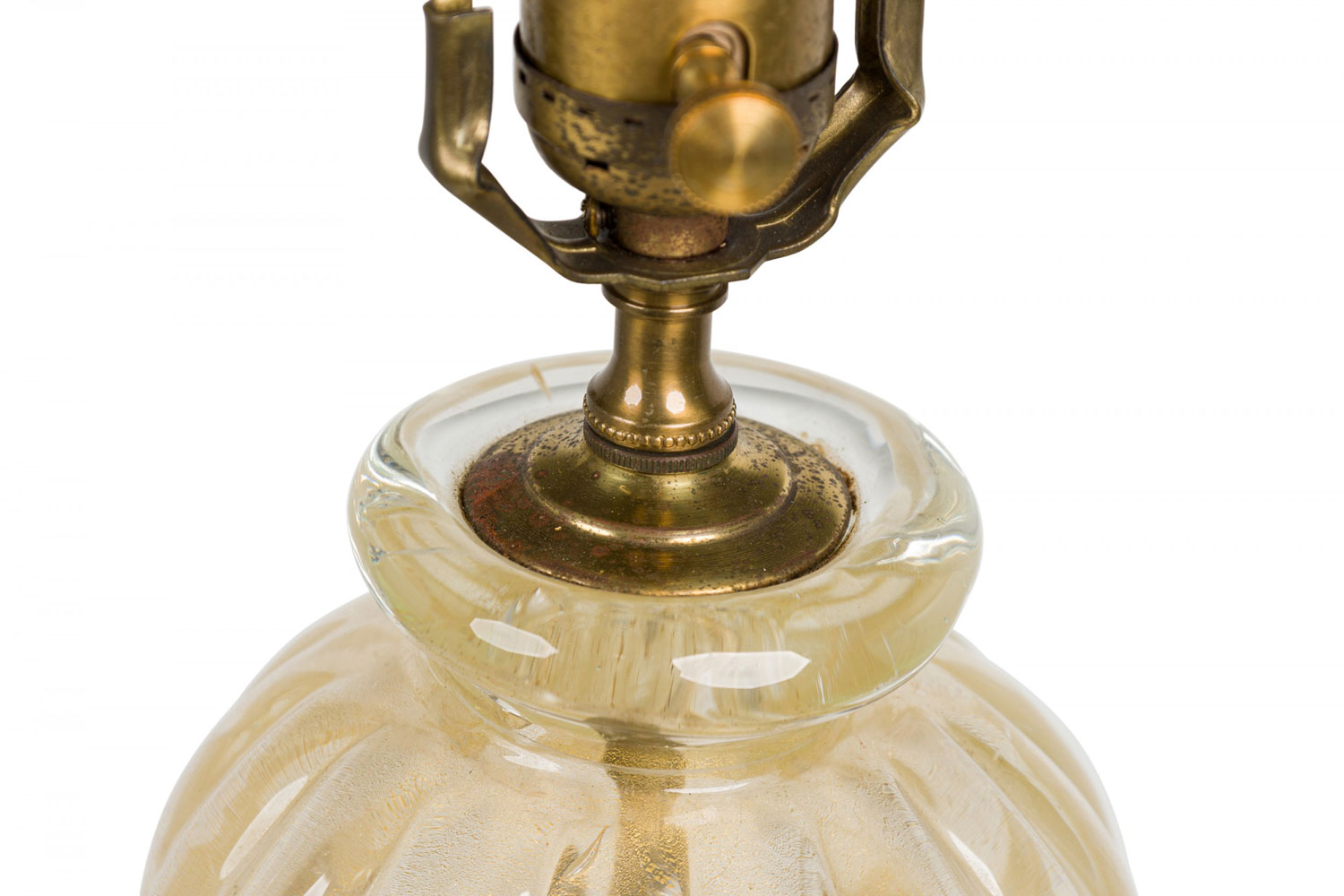 Mid-Century American glass table lamp in lobed tapered ovoid form with a waisted pinched neck and extended functioning brass light switch socket, resting on a tapered bottom foot, mounted on a gilt metal flattened circular base.