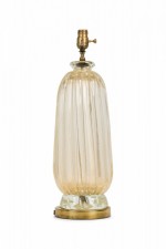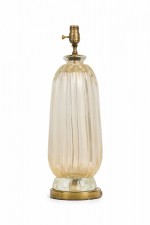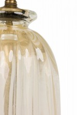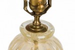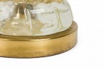 Mid-Century American glass table lamp in lobed tapered ovoid form with a waisted pinched neck and extended functioning brass light switch socket, resting on a tapered bottom foot, mounted on a gilt metal flattened circular base..