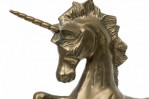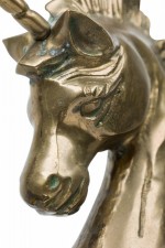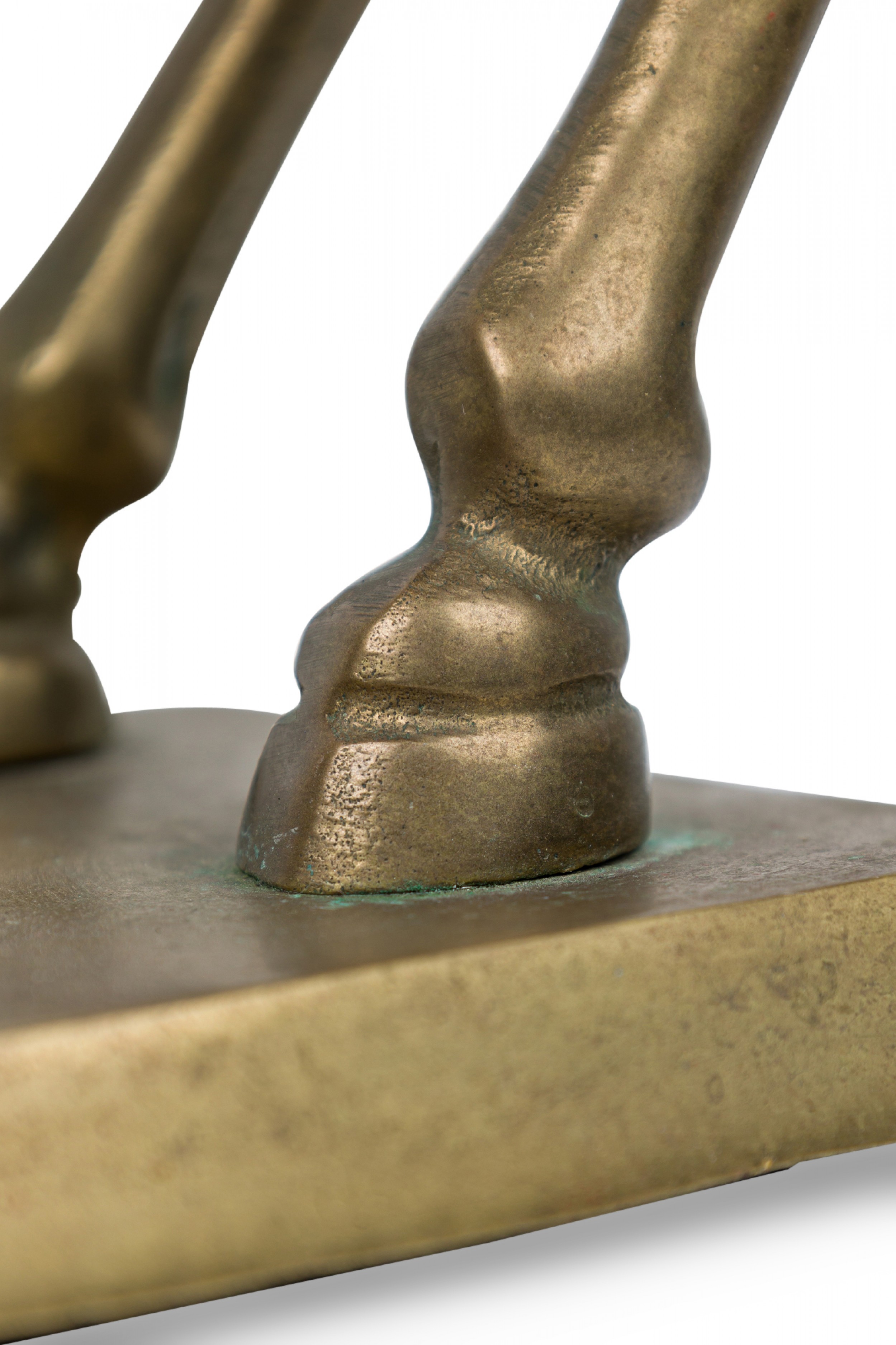 Mid-Century American Modern brass sculpture depicting a unicorn in realistic style standing on its hind legs, supported on a rectangual base.