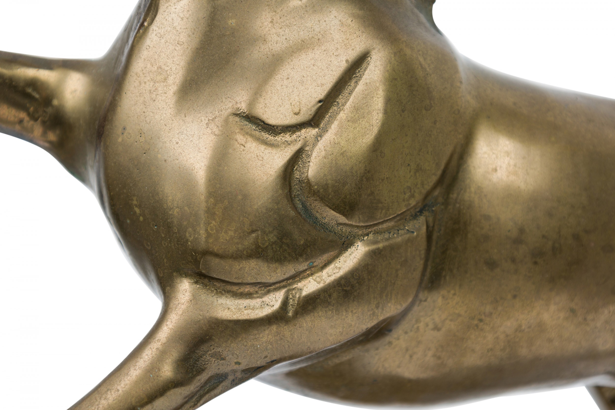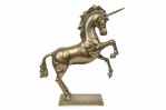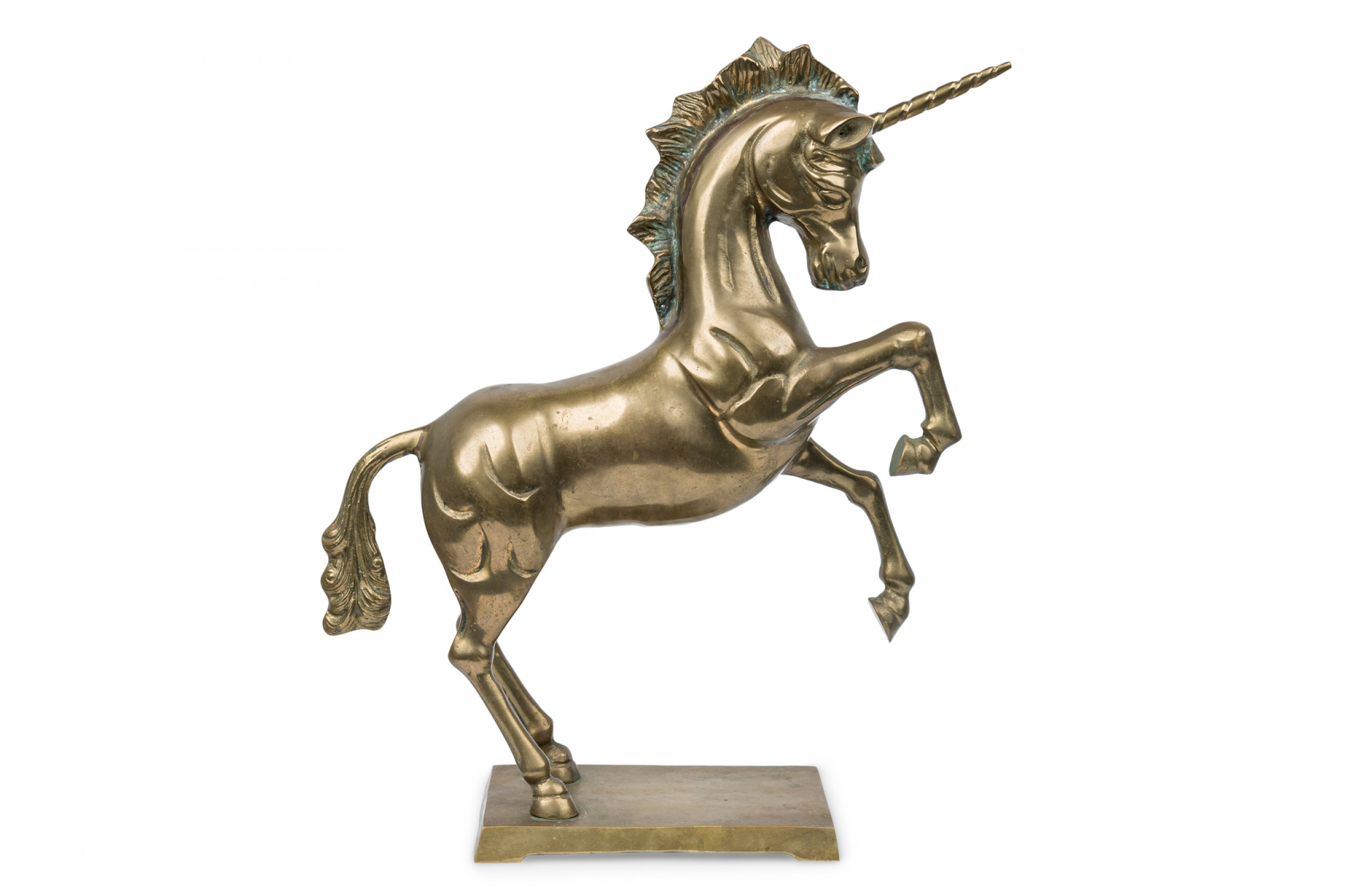 Mid-Century American Modern brass sculpture depicting a unicorn in realistic style standing on its hind legs, supported on a rectangual base..