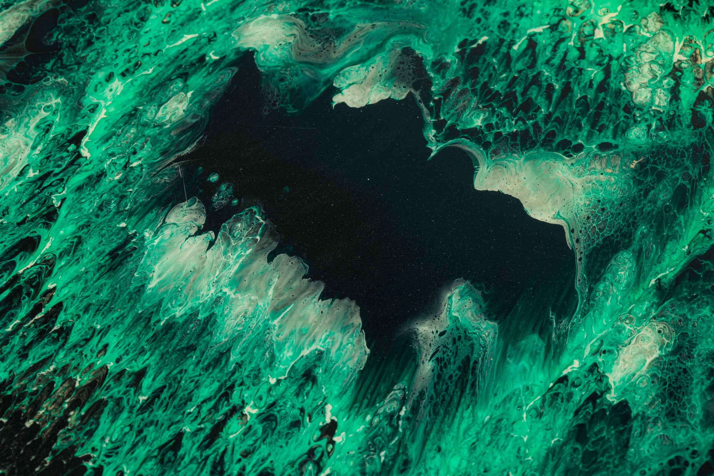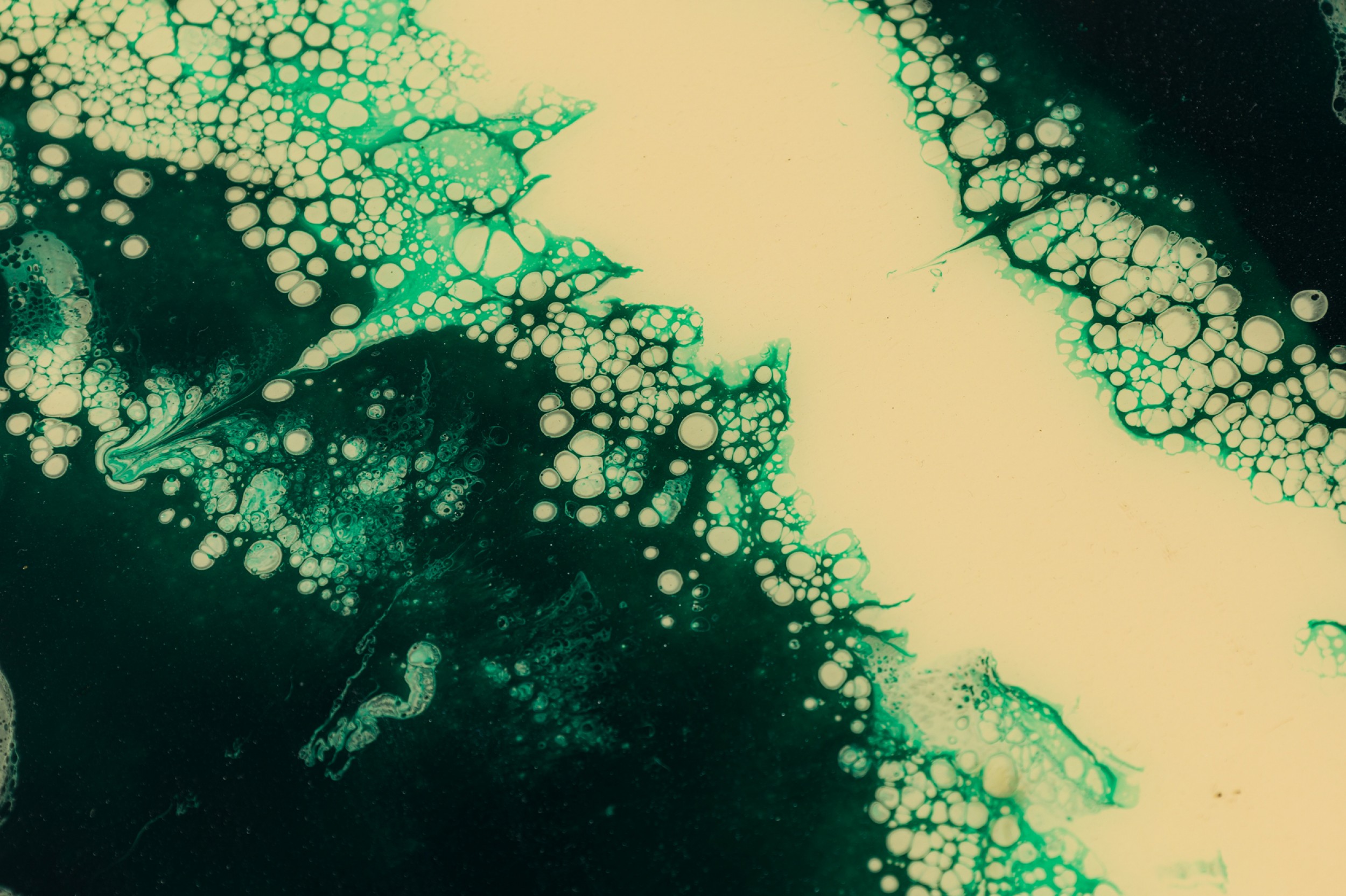 Mid-Century American Modern low / coffee table with an oval top resting on four green corner legs, the top finished in a marbled yellow, beige, and green resin..