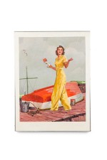 Mid-Century American oil painting portrait depicts a woman in a yellow jumpsuit pausing for raindrops while painting the underside of a boat on a dock, mounted in a silver metal frame. (signed, JAN H. HOGENBYL)