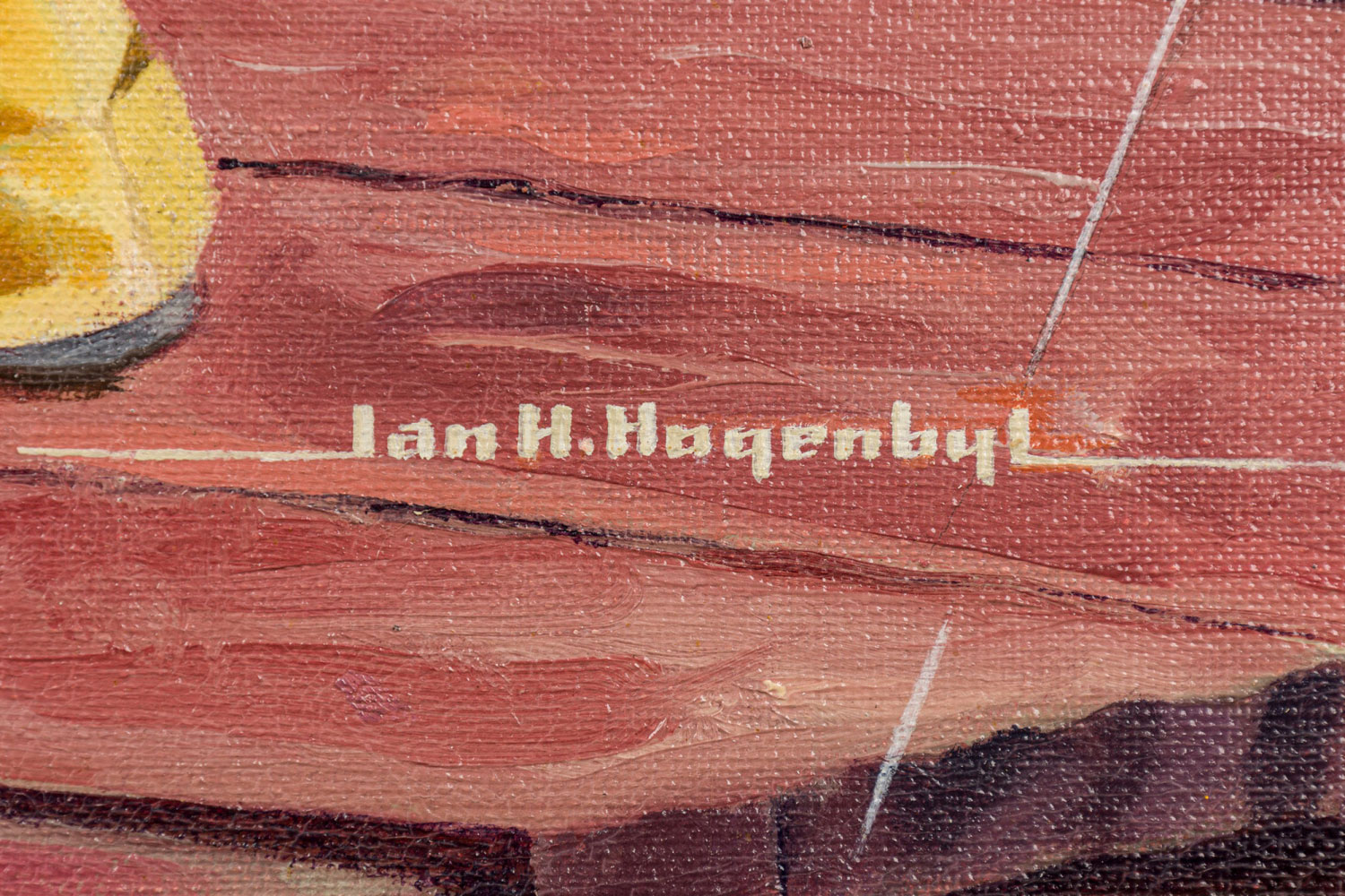Mid-Century American oil painting portrait depicts a woman in a yellow jumpsuit pausing for raindrops while painting the underside of a boat on a dock, mounted in a silver metal frame. (signed, JAN H. HOGENBYL).