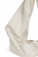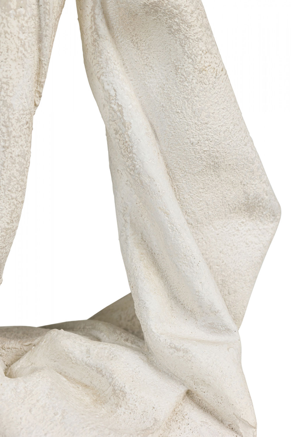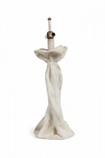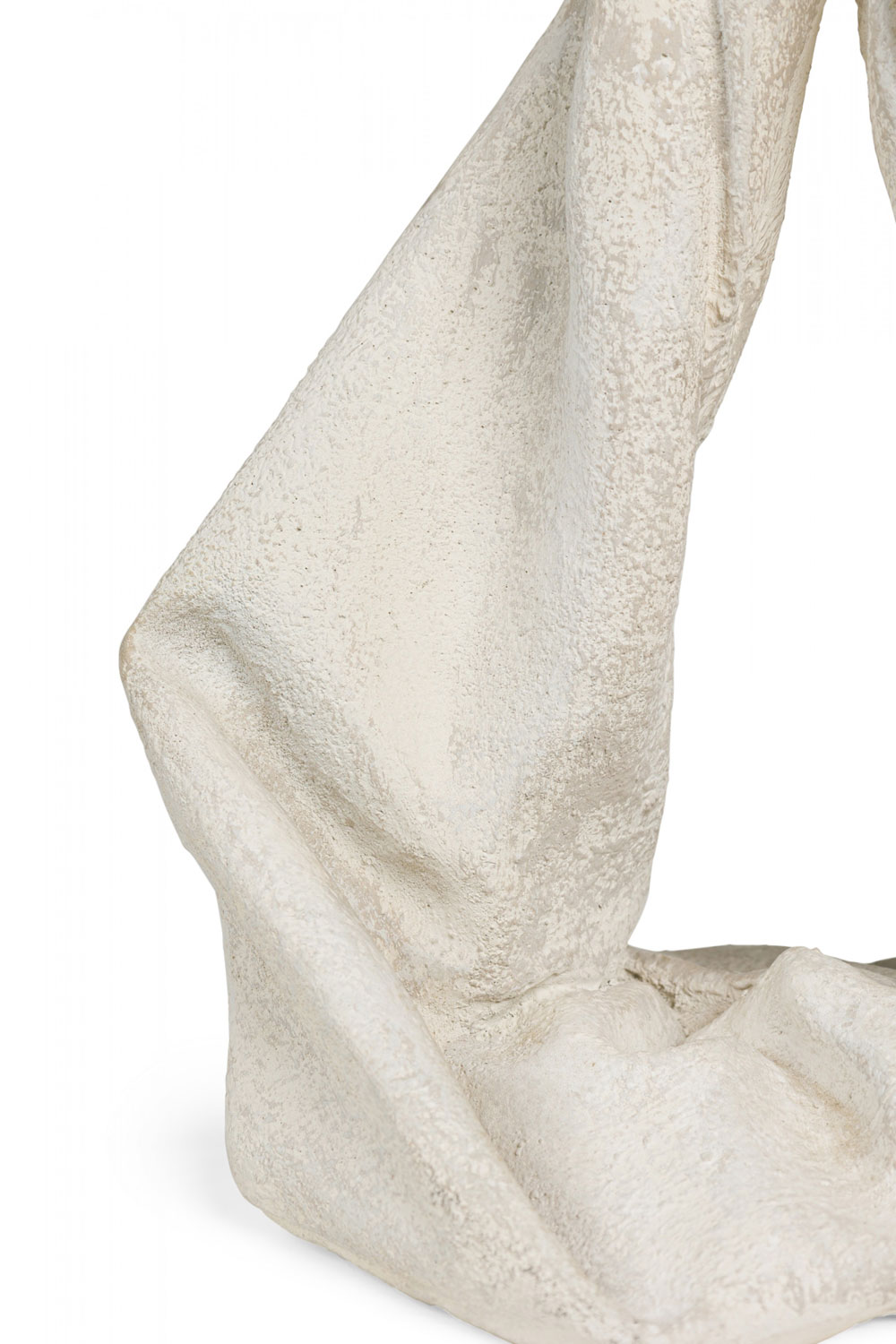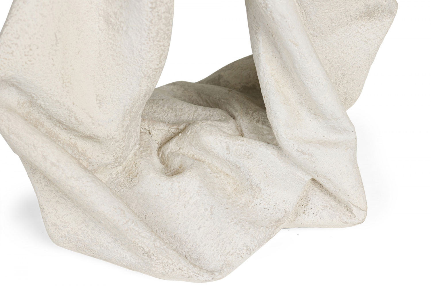 Mid-Century American plaster table lamp in drapery form with a painted wood cylindrical stem, domed metal finial and two cross stems for light sockets (nonfunctioning), the body finished in a stippled matte beige glaze. (Similar pieces: DUL0074, DUL0076).