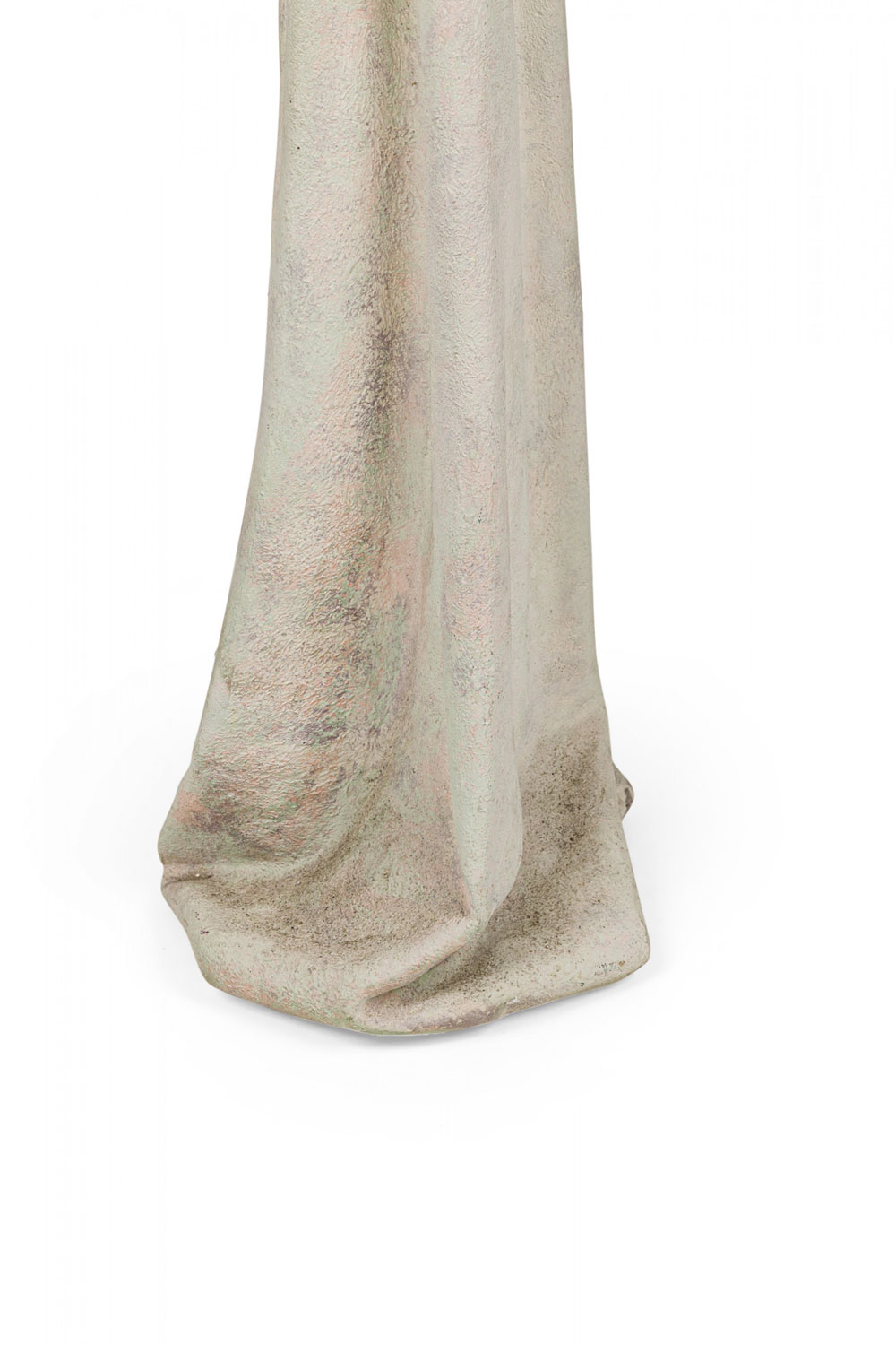 Mid-Century American drapery form plaster floor lamp with extended stem featuring a functional brass light switch socket, harp and ceramic orb finial, the body cast in a realistic form with generous folds, finished in a stippled matte beige glaze. (Similar pieces: DUL0074, DUL0076).