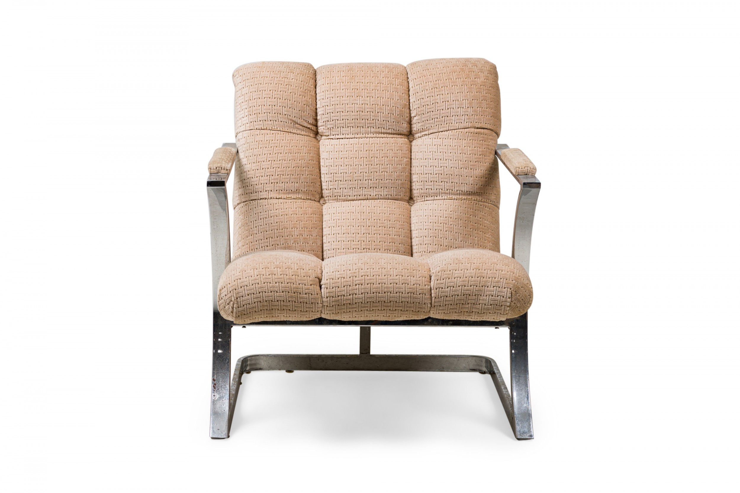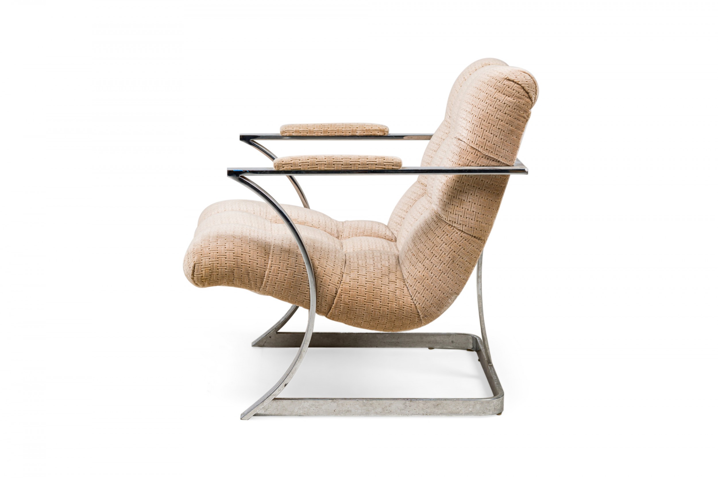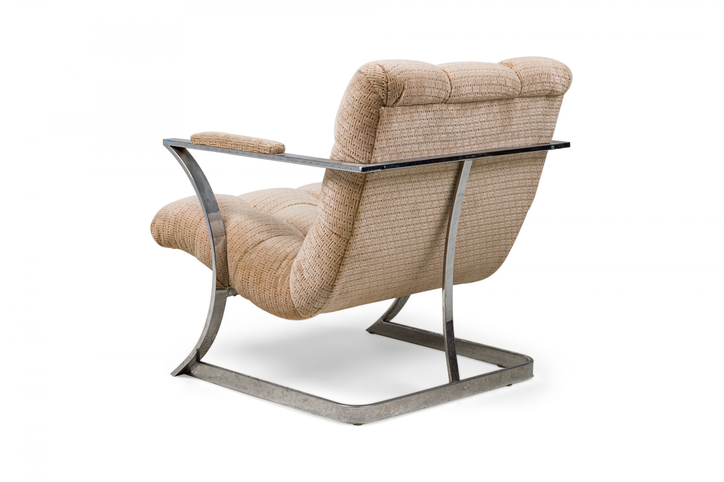 Mid-Century American polished silver metal flat bar armchair with a curved concave frame, the arms unified with the back as one piece, upholstered in a button tufted textured beige fabric. (manner of MILO BAUGHMAN)