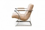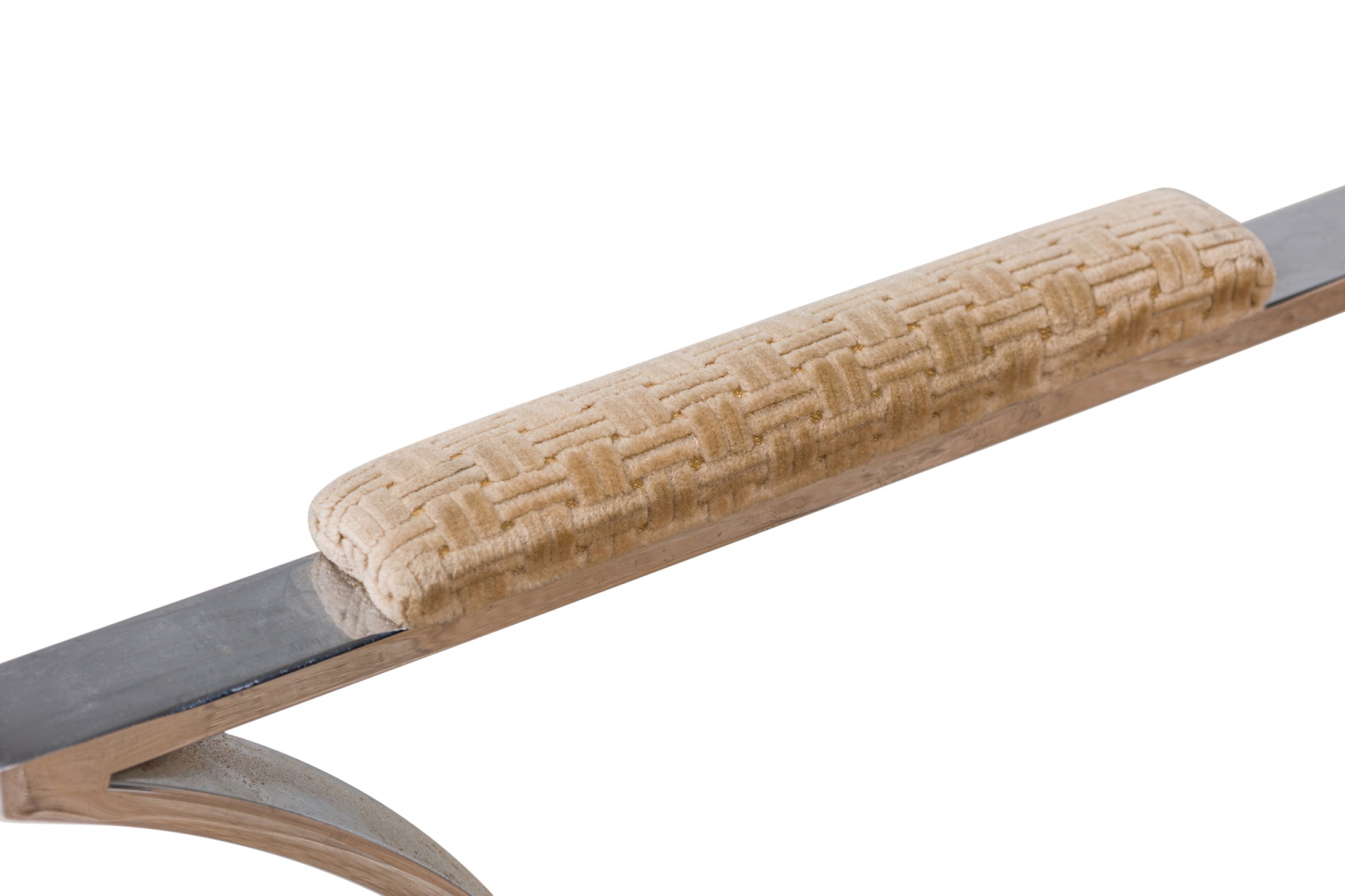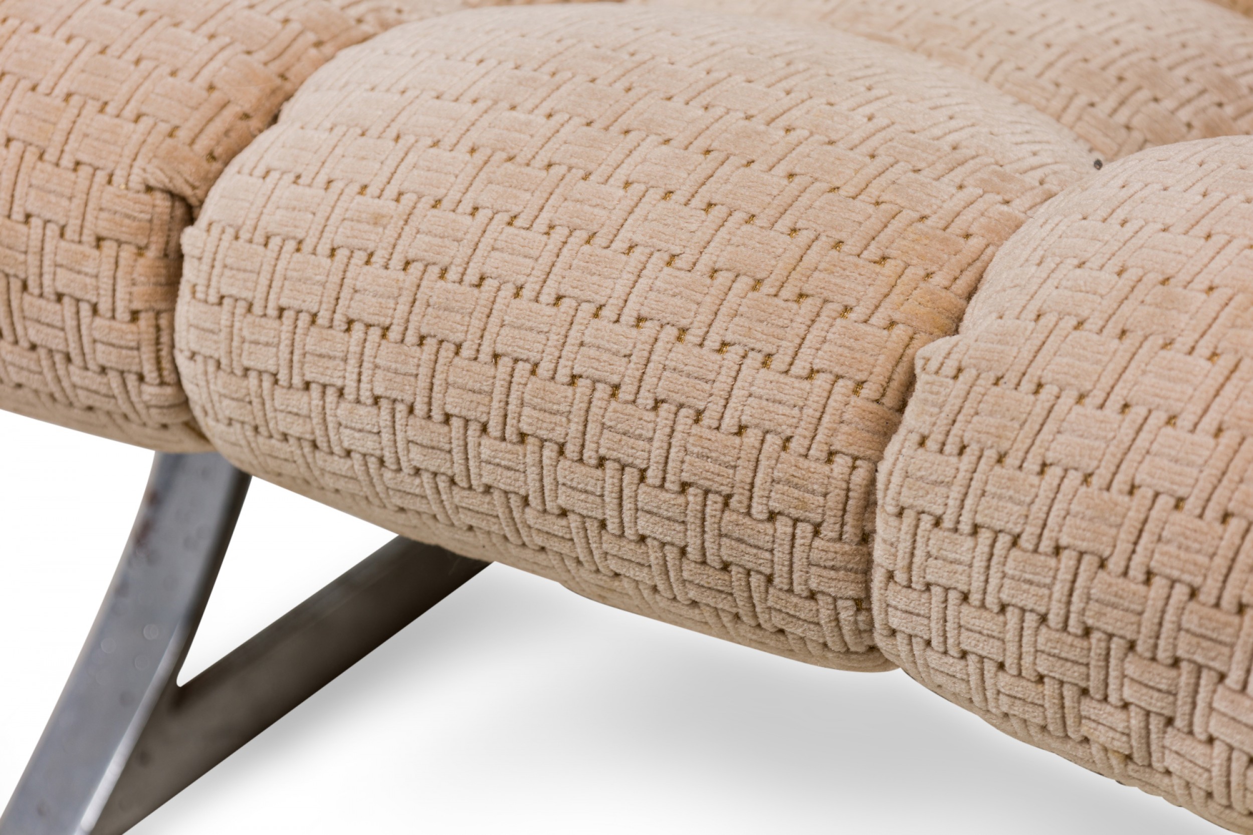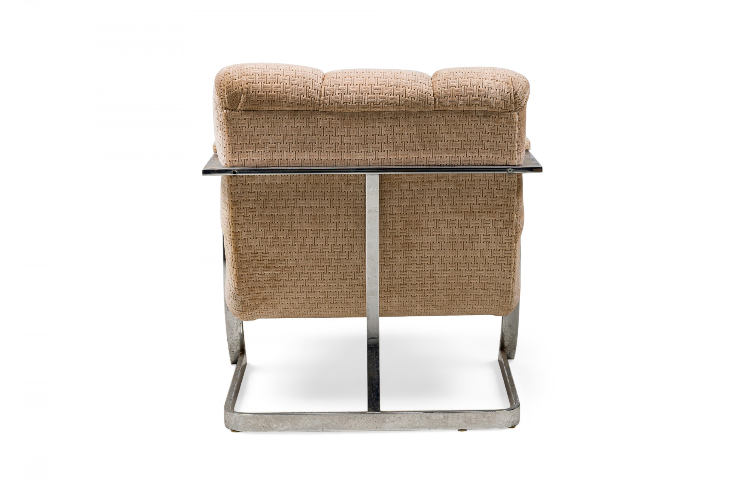 Mid-Century American polished silver metal flat bar armchair with a curved concave frame, the arms unified with the back as one piece, upholstered in a button tufted textured beige fabric. (manner of MILO BAUGHMAN)