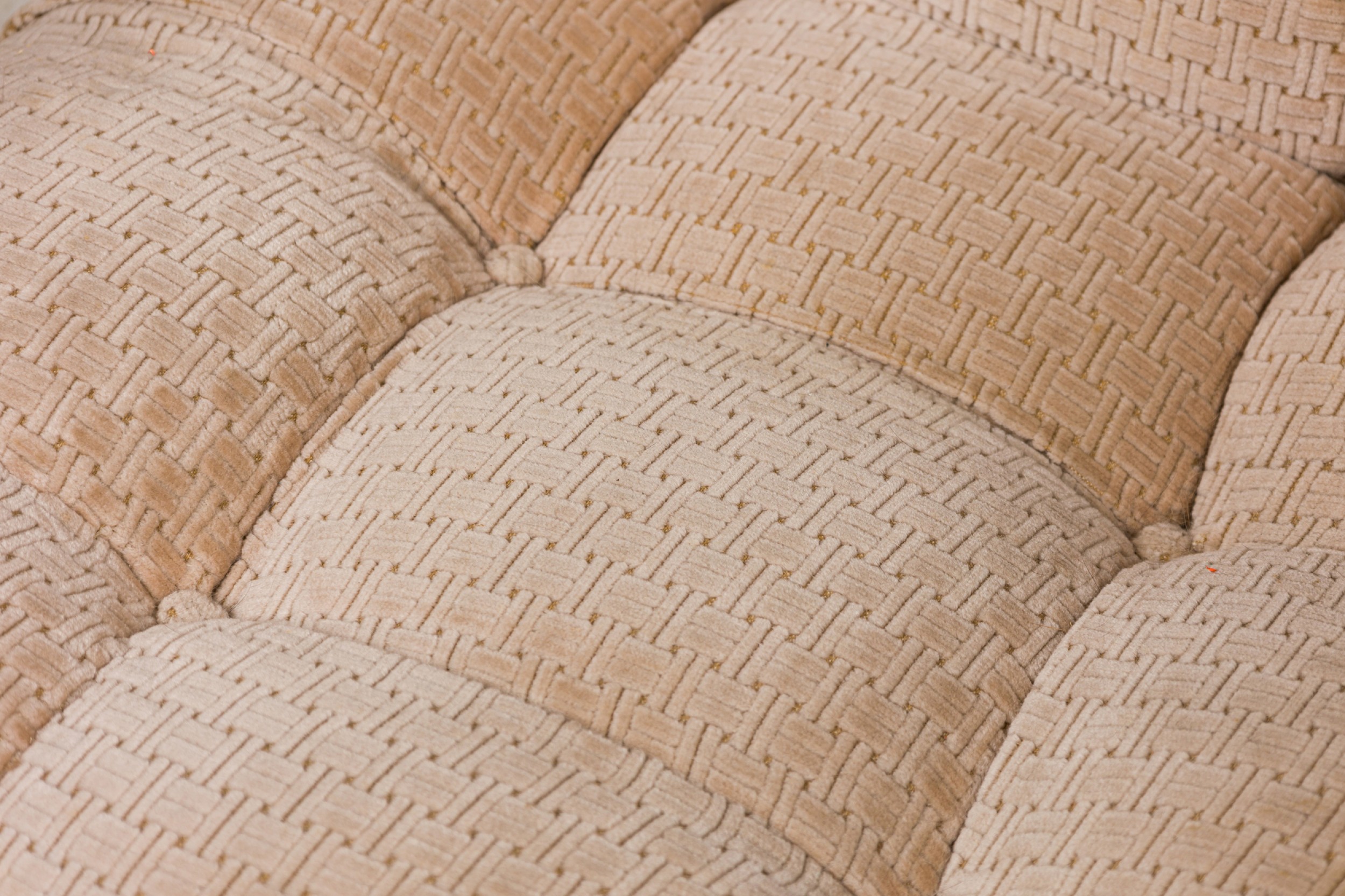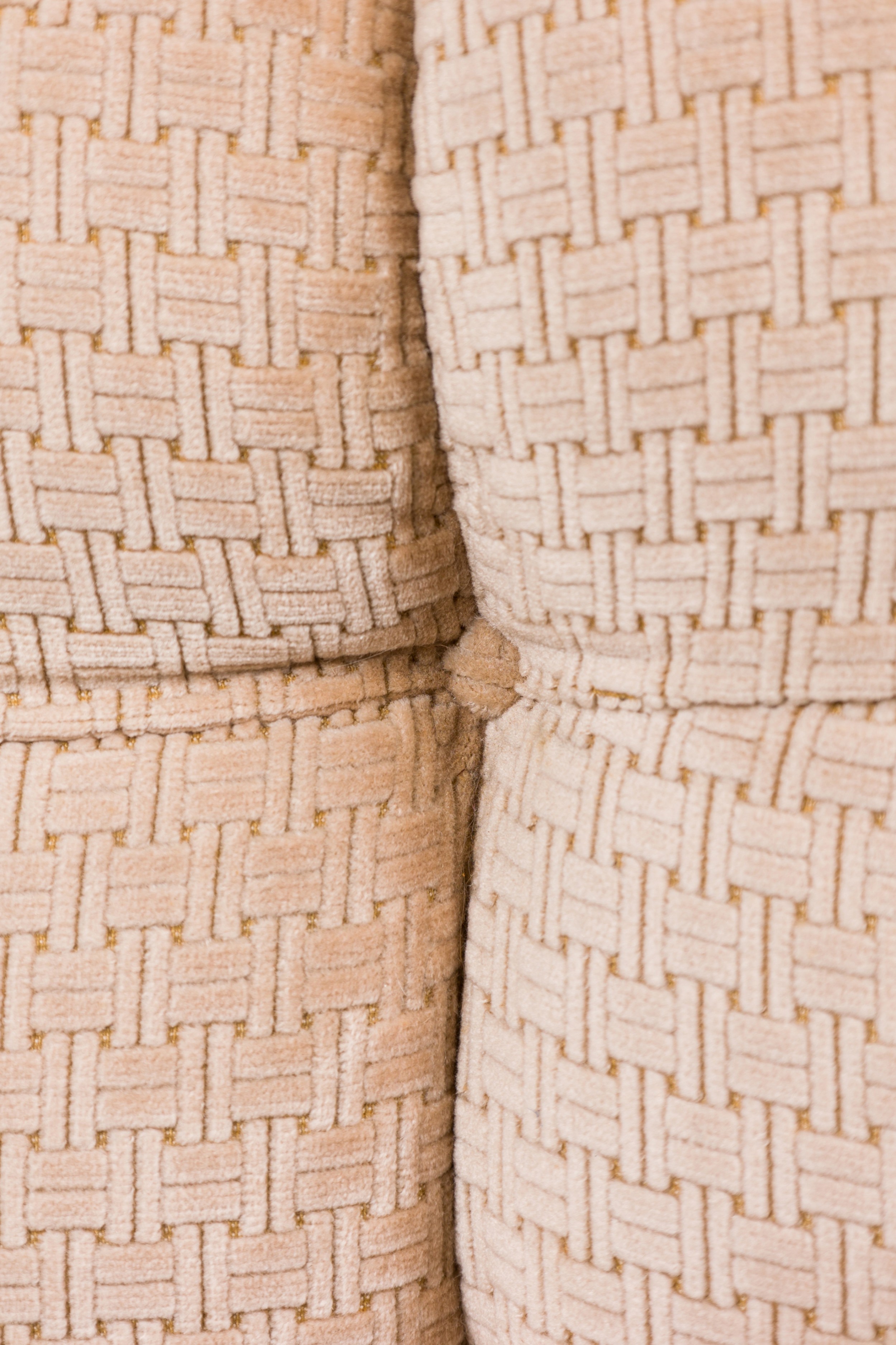 Style: Mid-Century Materials & Techniques: Fabric, metal, tufted, upholstered Category: Seating Condition: Wear to finish on metal, slight wear on upholstery. Good; Wear consistent with age and use