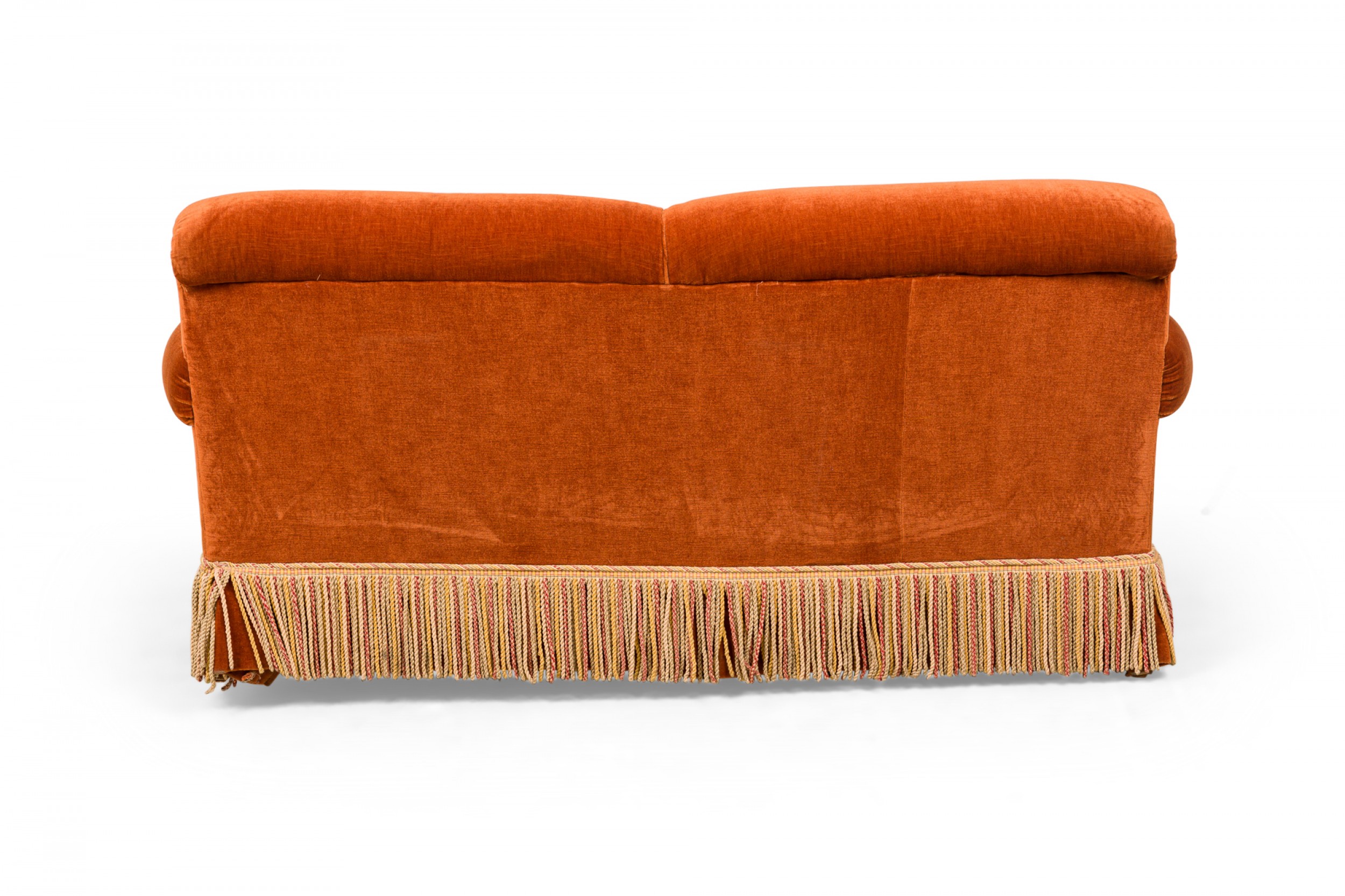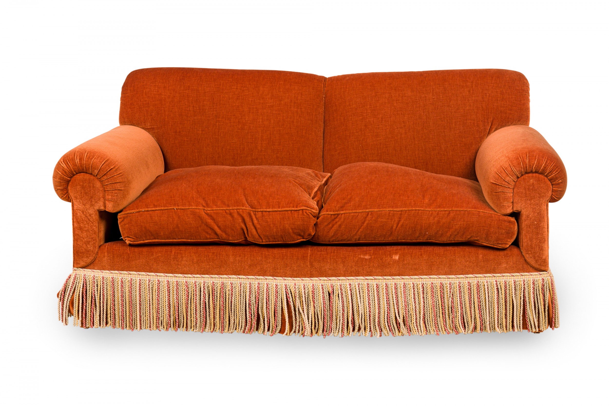 English Victorian style (Mid-20th Century) two-seat sofa upholstered in rust velvet having roll form arms with 2 seat cushions and a fringed apron in woven strands of beige, yellow and pale green.