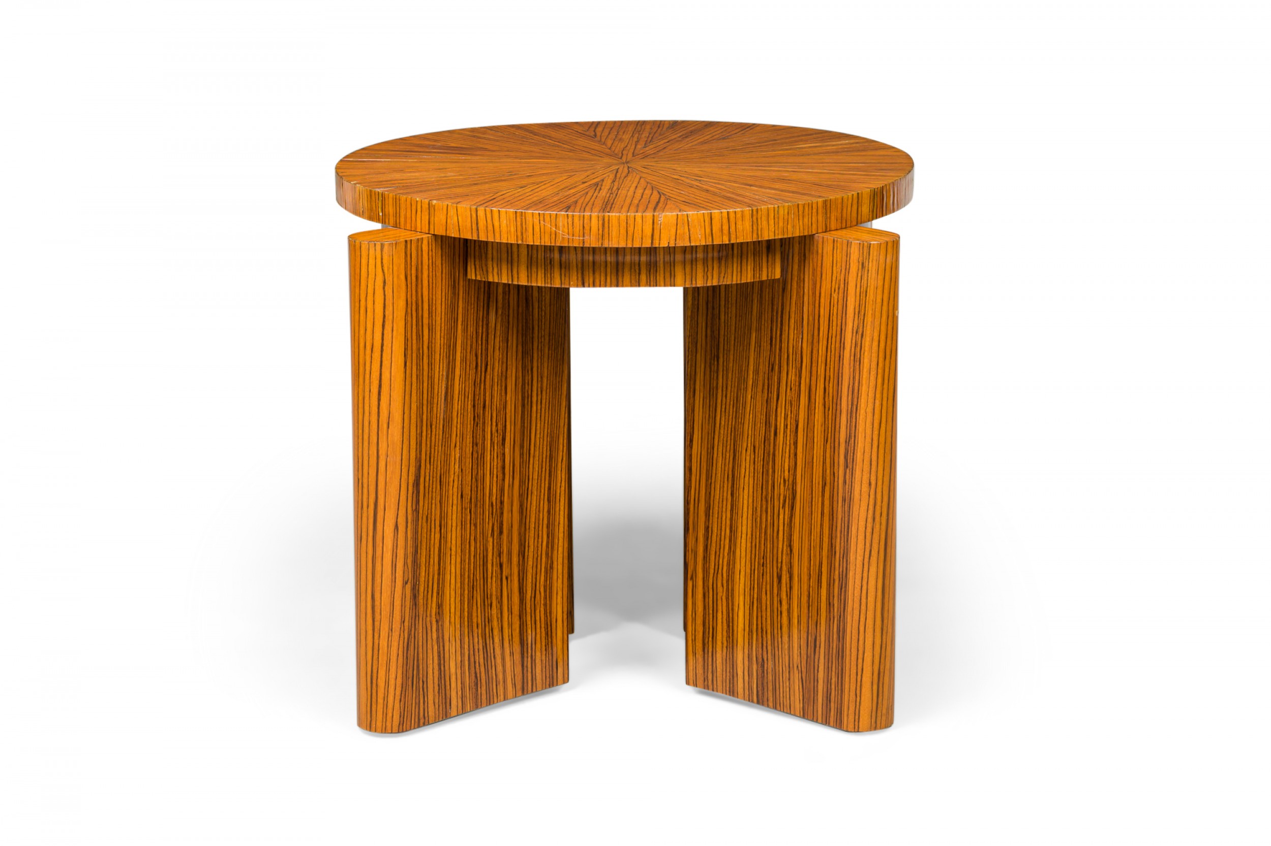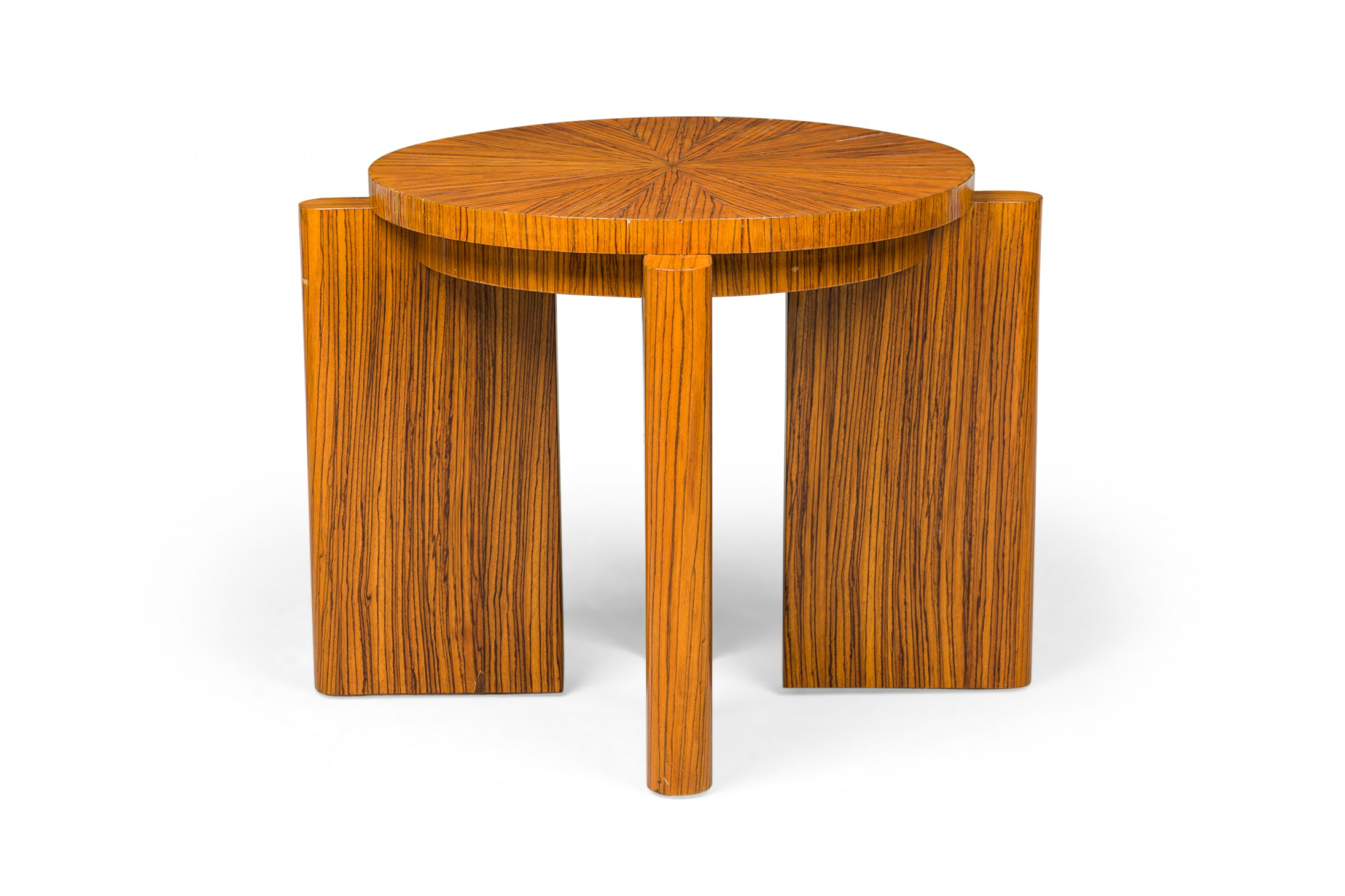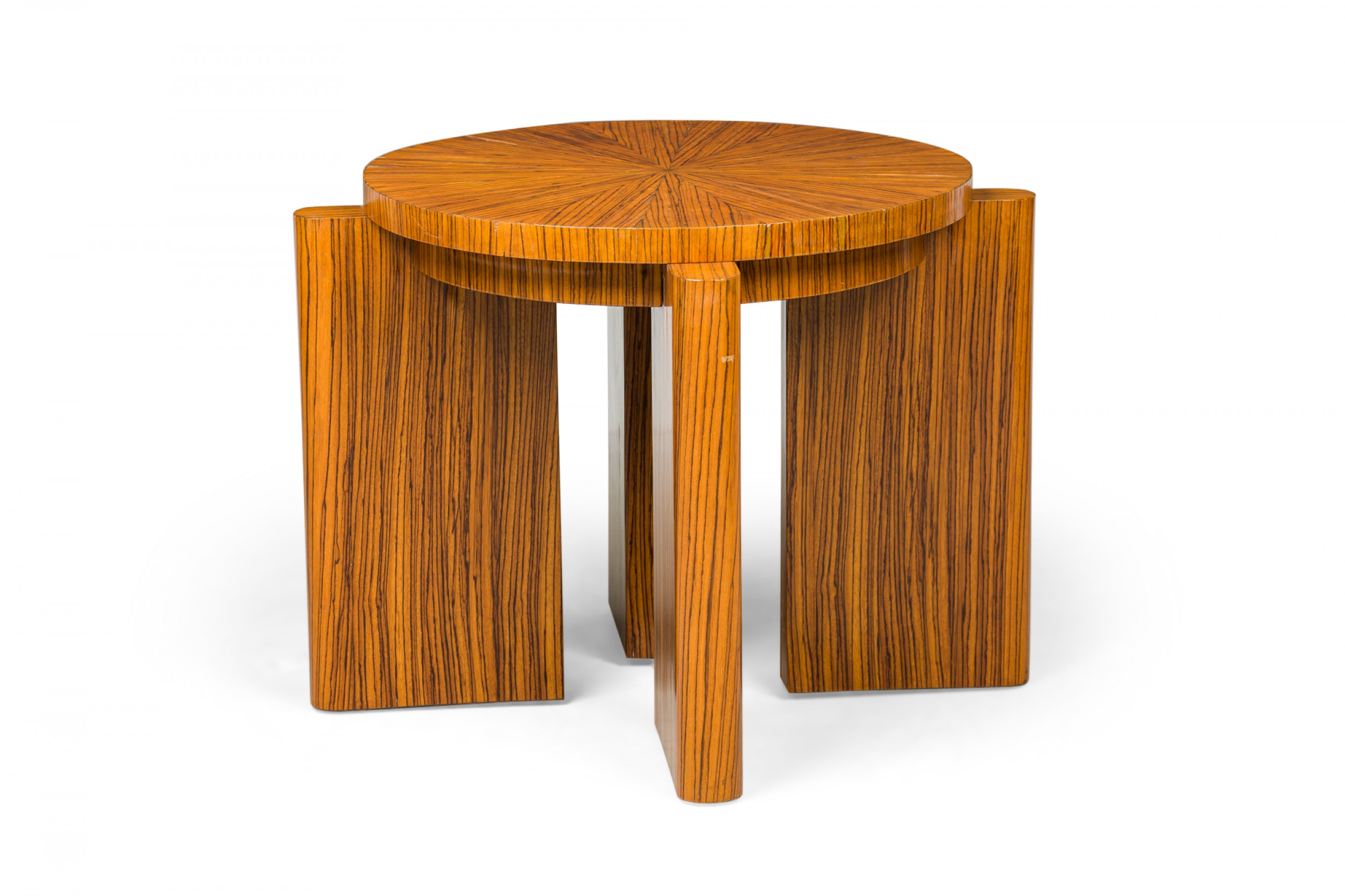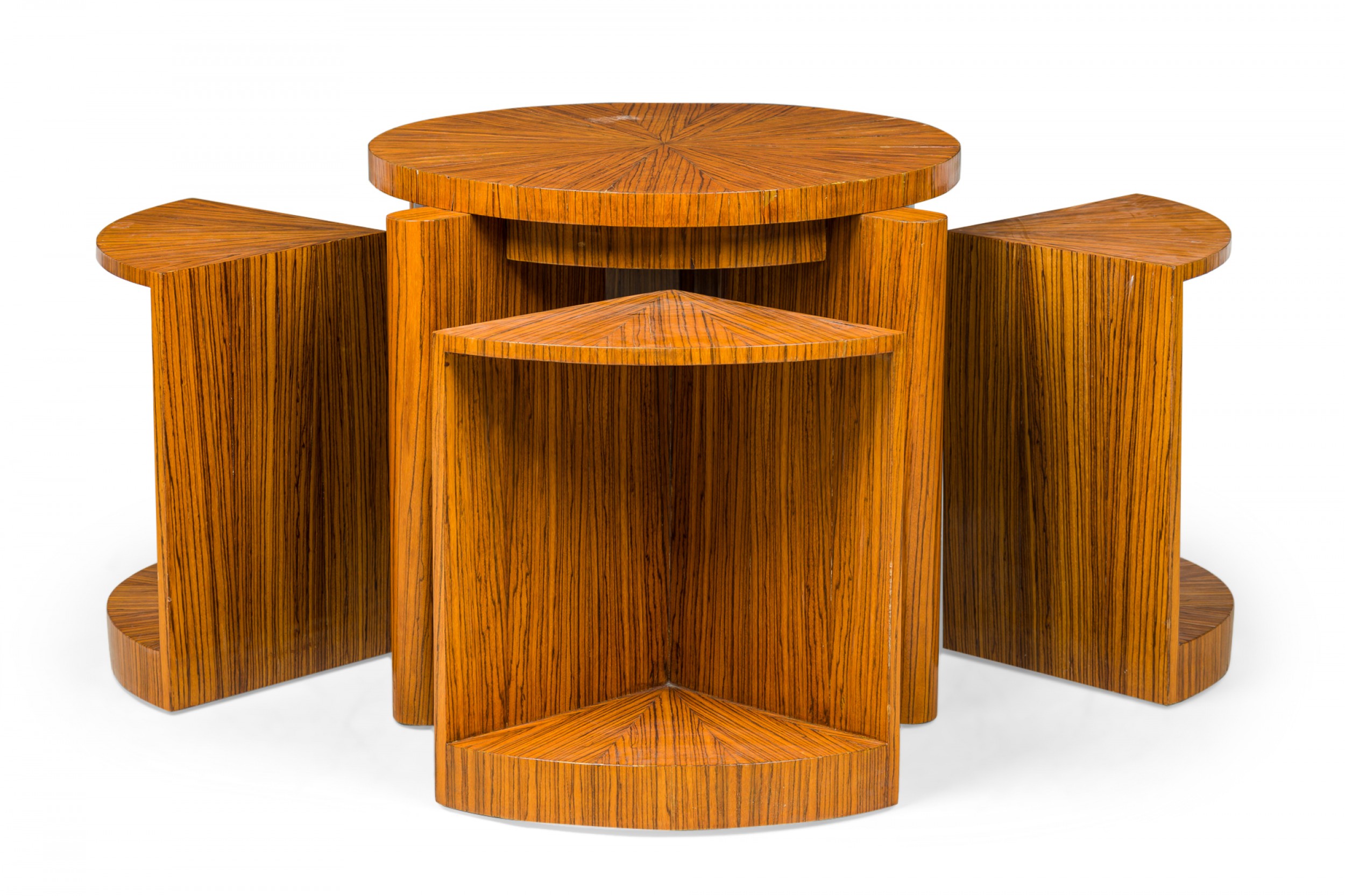 Mid-Century American (1970s) occasional end / side table finished in zebrawood veneer with a circular top resting on four wide angled legs with rounded edges, with 4 matching wedge stools that nest beneath the tabletop. (PRICED AS SET) (attributed to VLADIMIR KAGAN)