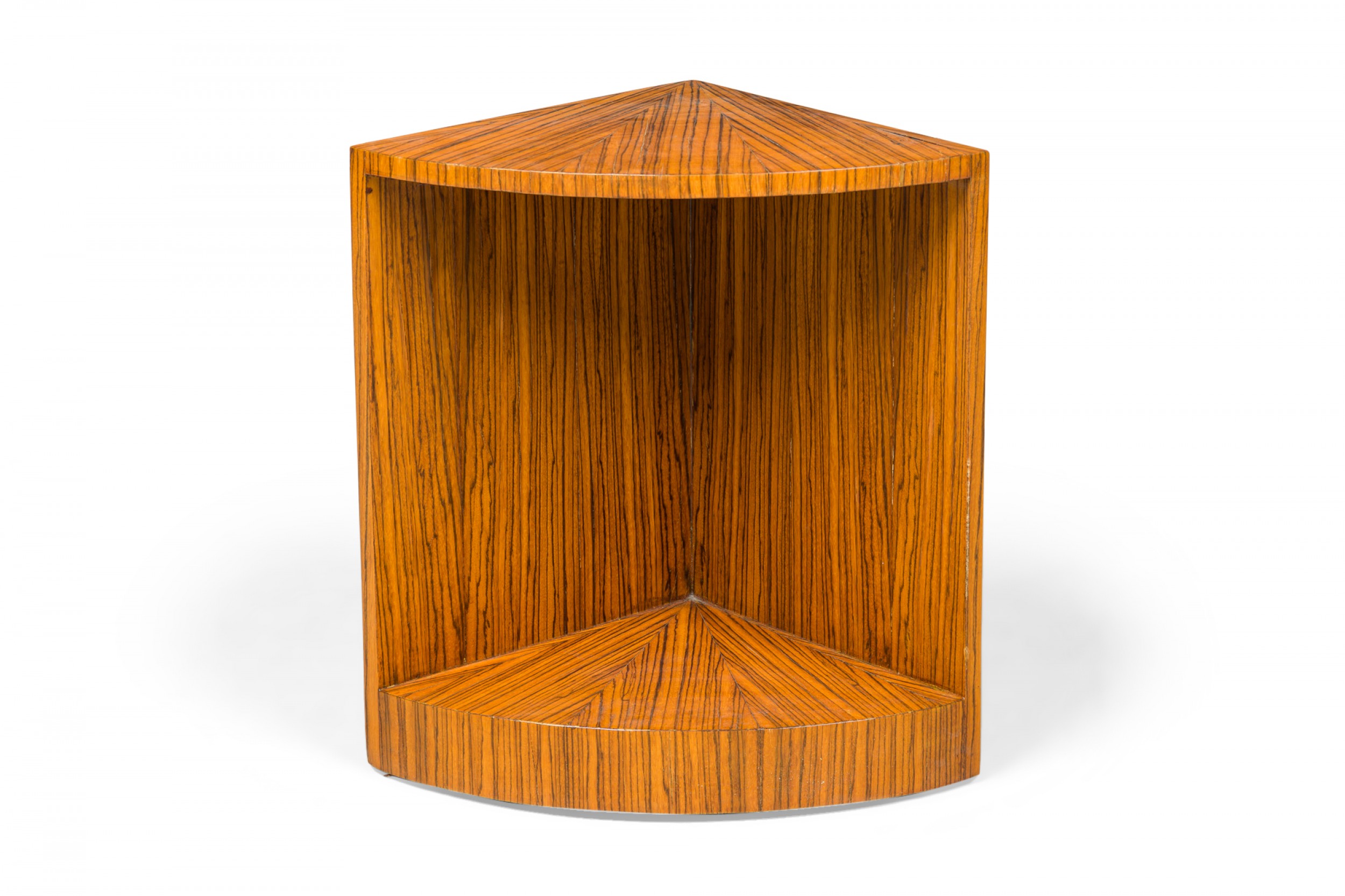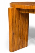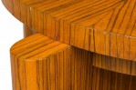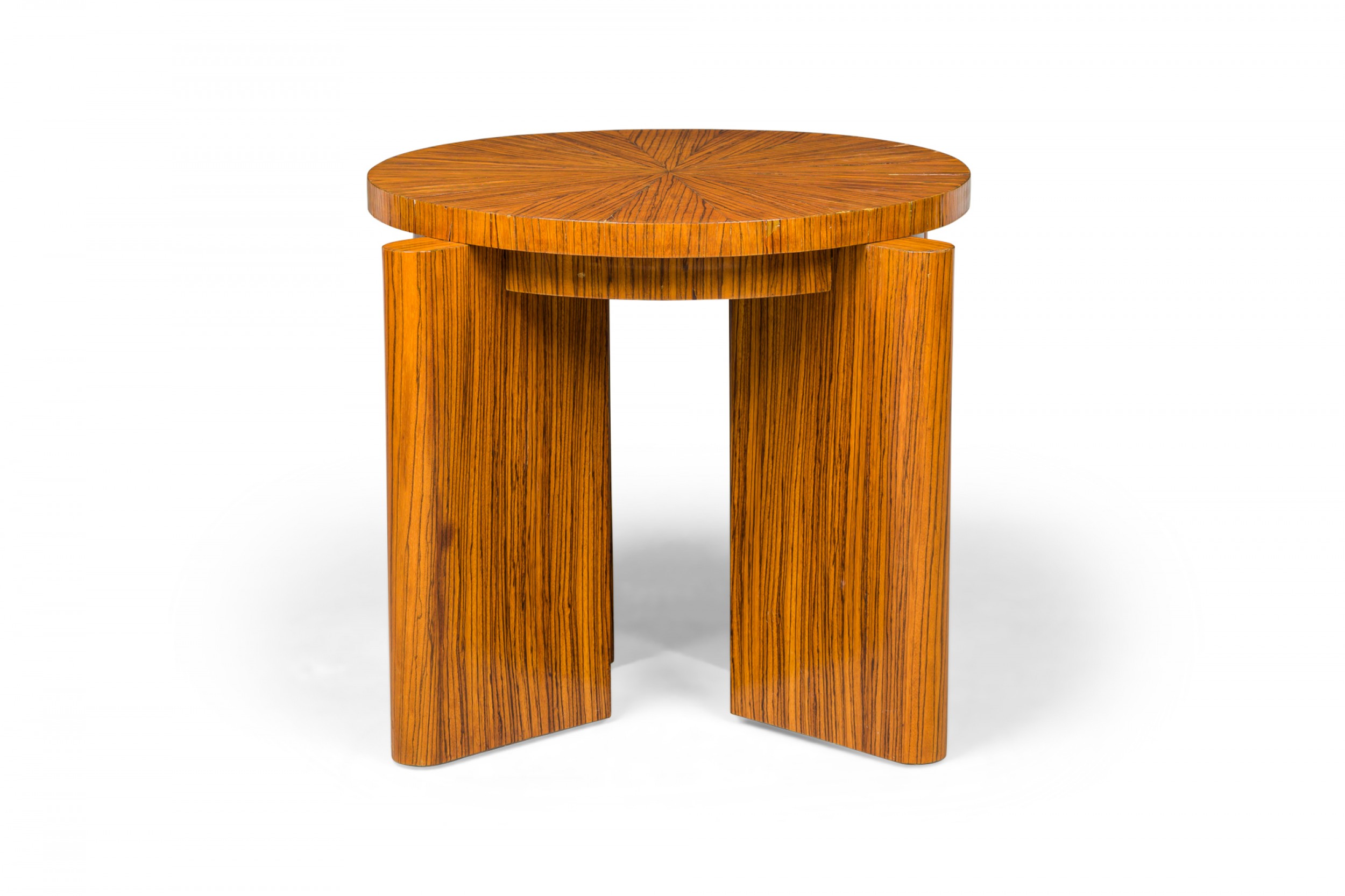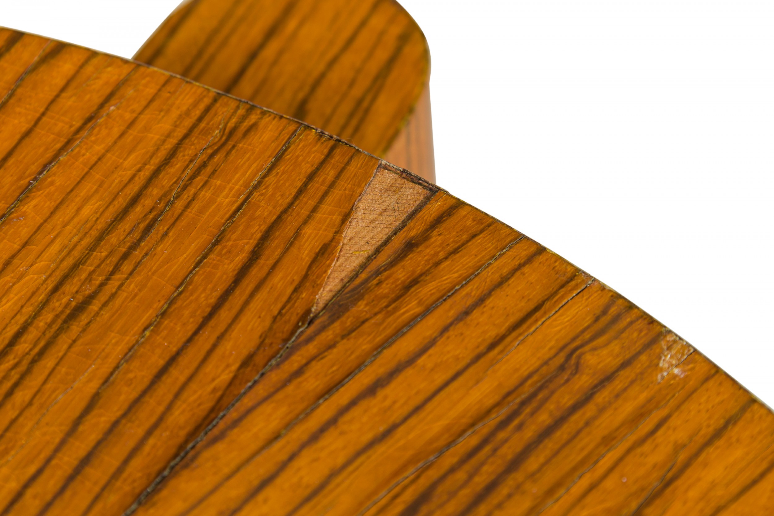 Mid-Century American (1970s) occasional end / side table finished in zebrawood veneer with a circular top resting on four wide angled legs with rounded edges, with 4 matching wedge stools that nest beneath the tabletop. (PRICED AS SET) (attributed to VLADIMIR KAGAN)