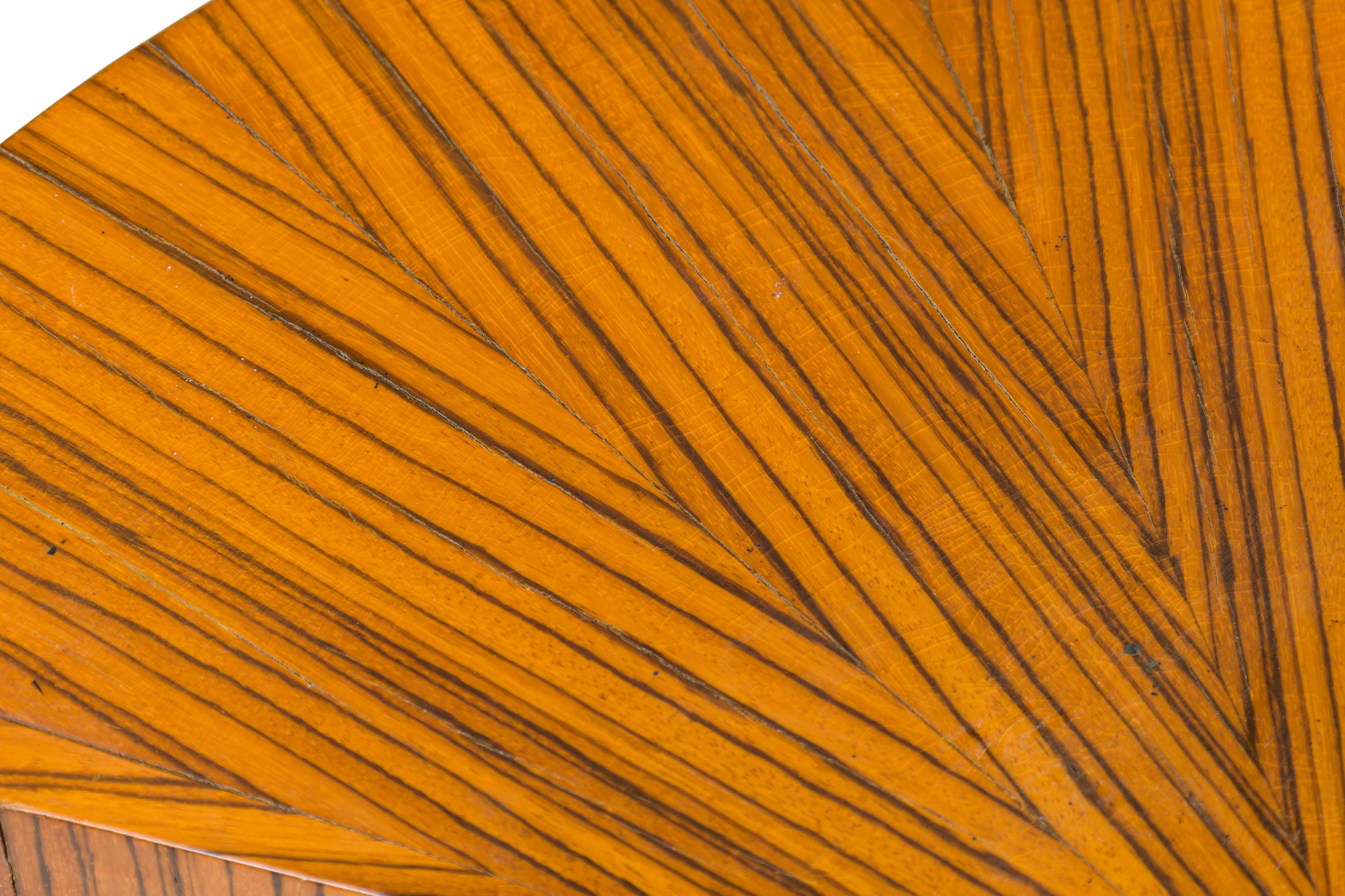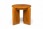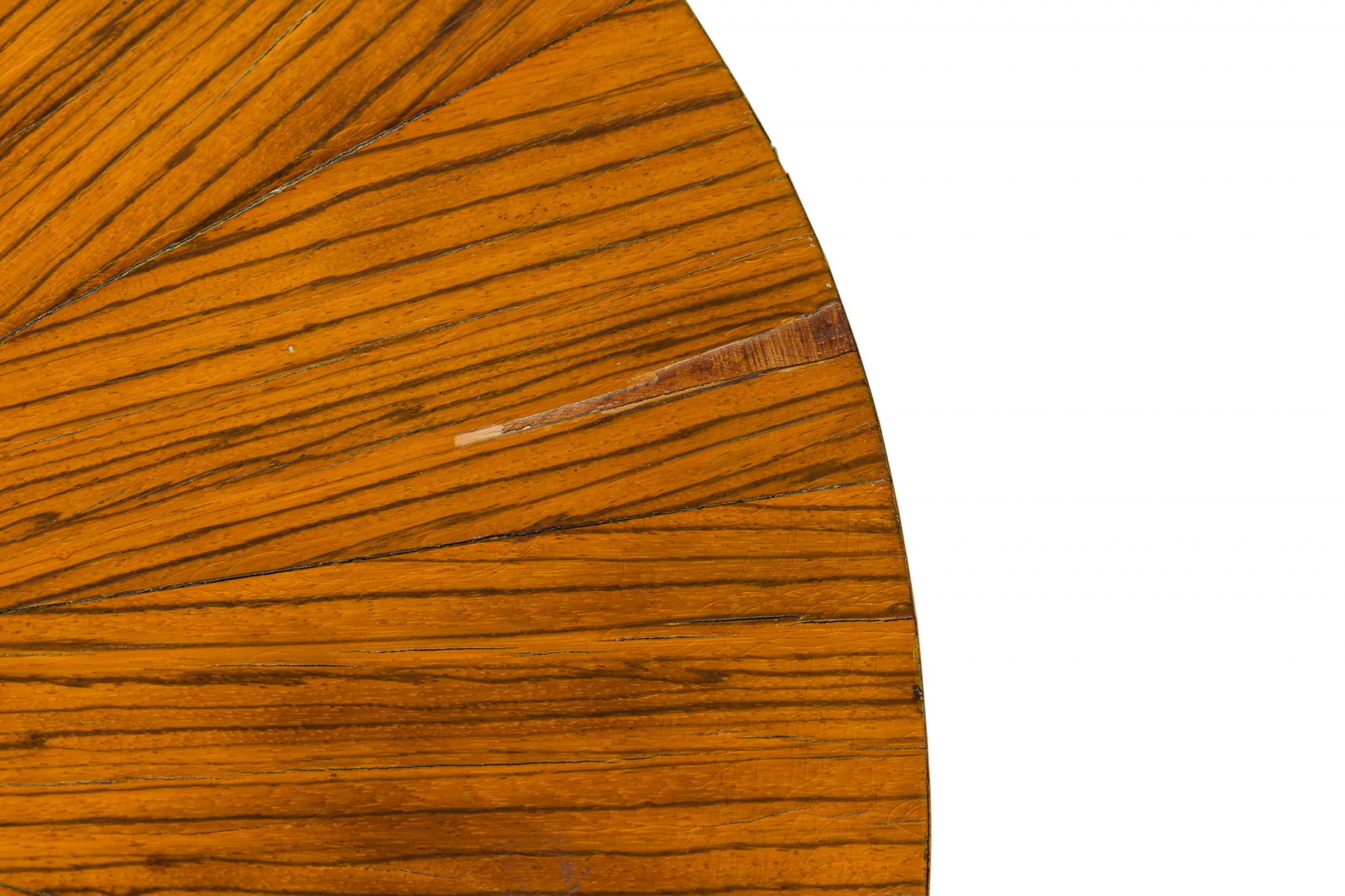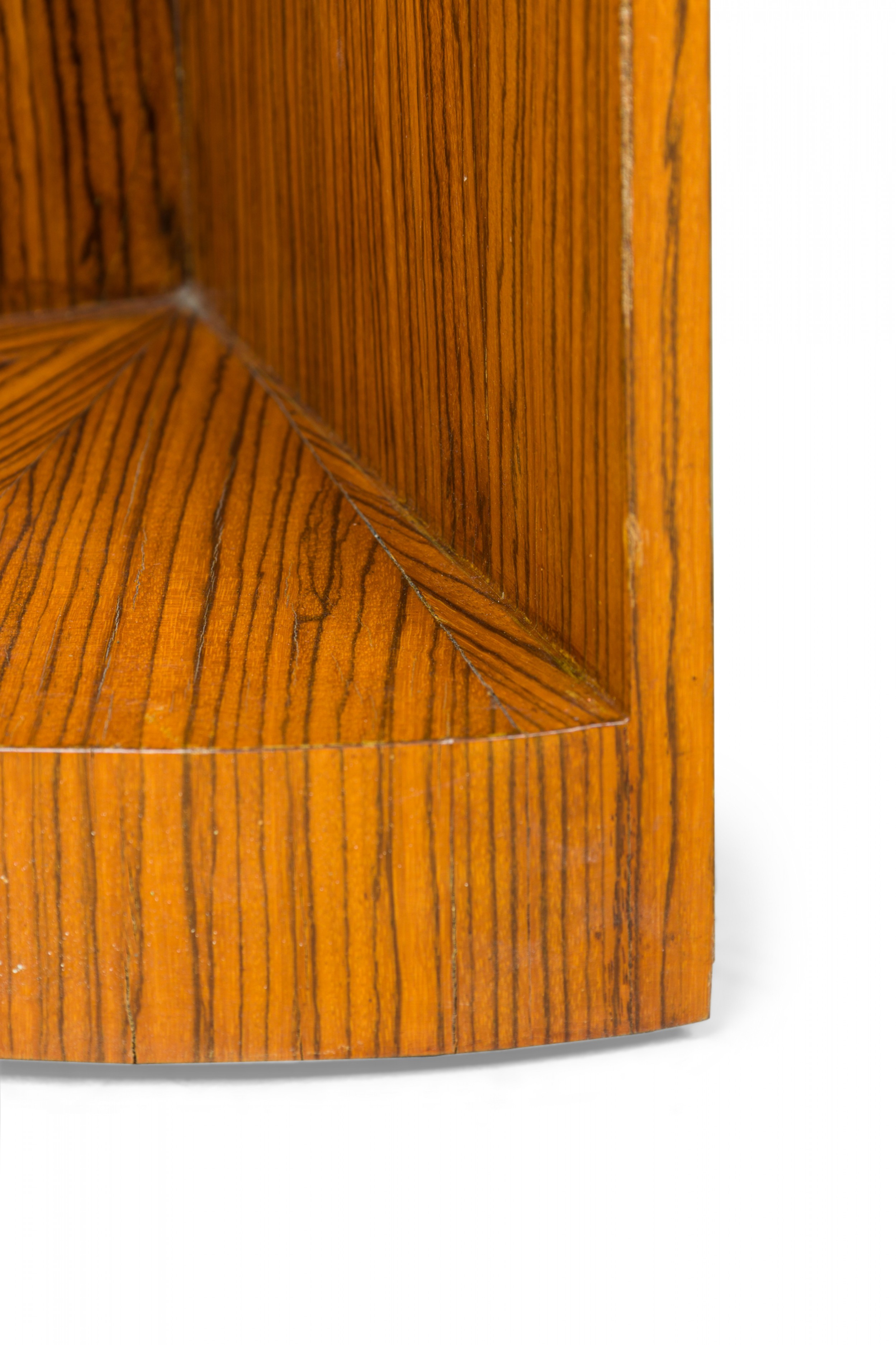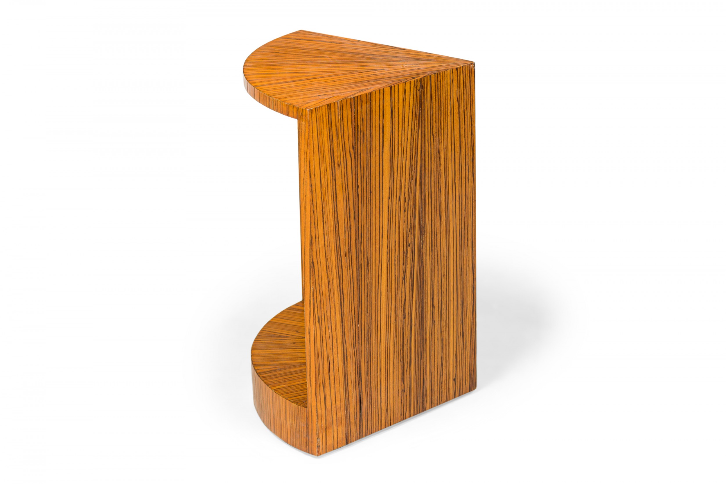 Mid-Century American (1970s) occasional end / side table finished in zebrawood veneer with a circular top resting on four wide angled legs with rounded edges, with 4 matching wedge stools that nest beneath the tabletop. (PRICED AS SET) (attributed to VLADIMIR KAGAN)