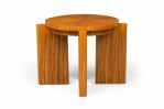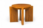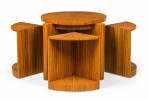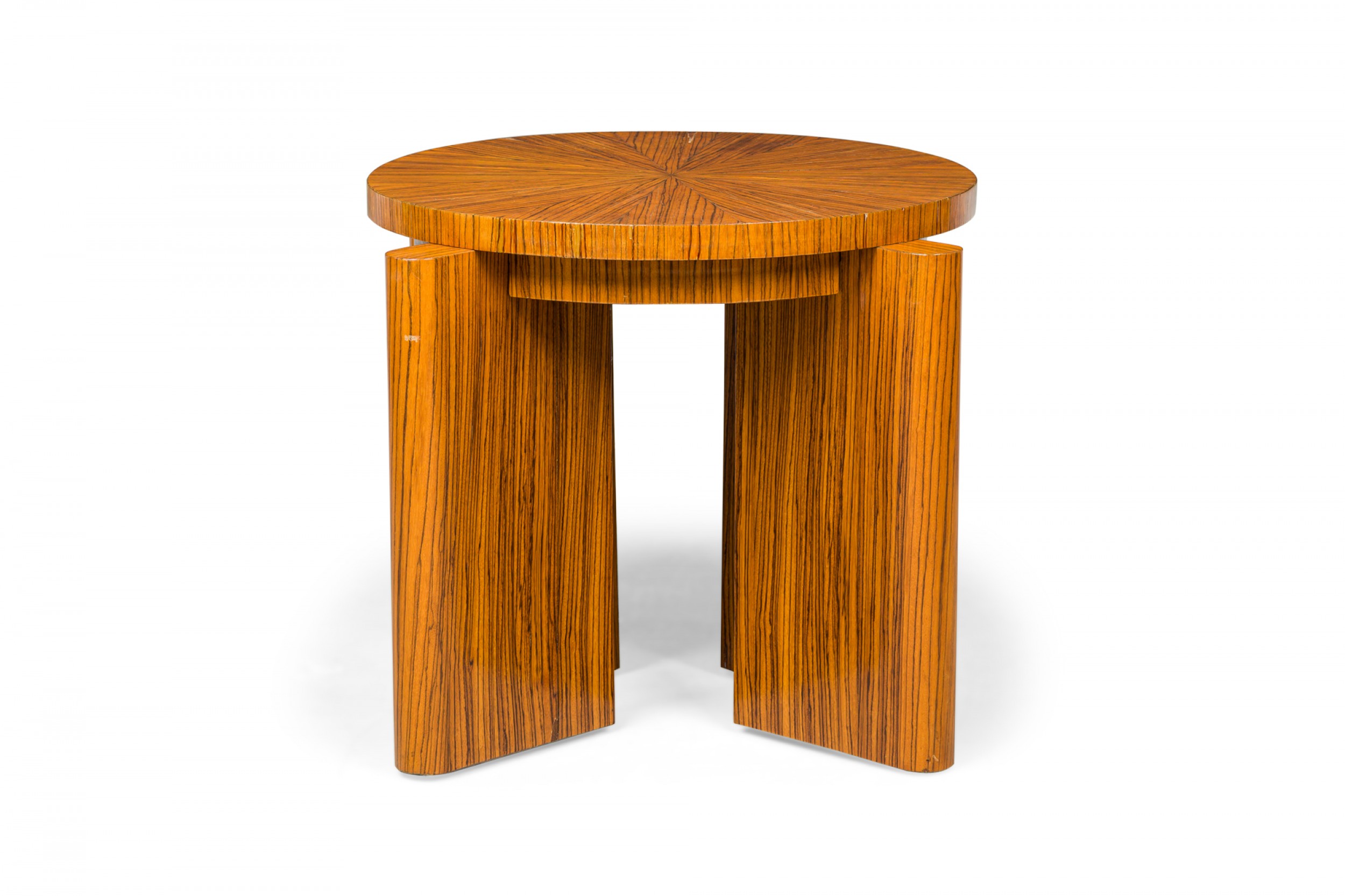 Mid-Century American (1970s) occasional end / side table finished in zebrawood veneer with a circular top resting on four wide angled legs with rounded edges, with 4 matching wedge stools that nest beneath the tabletop. (PRICED AS SET) (attributed to VLADIMIR KAGAN).