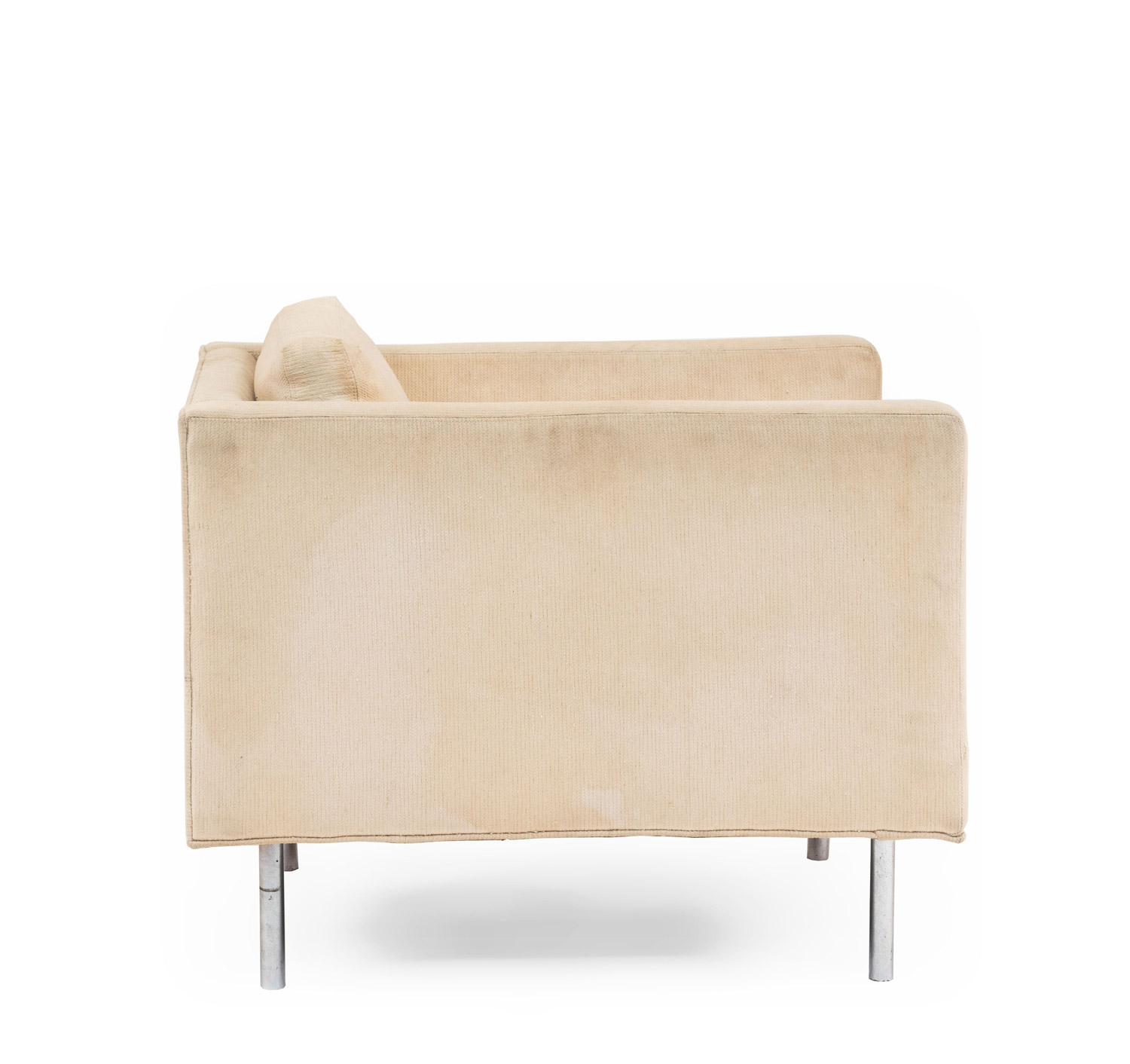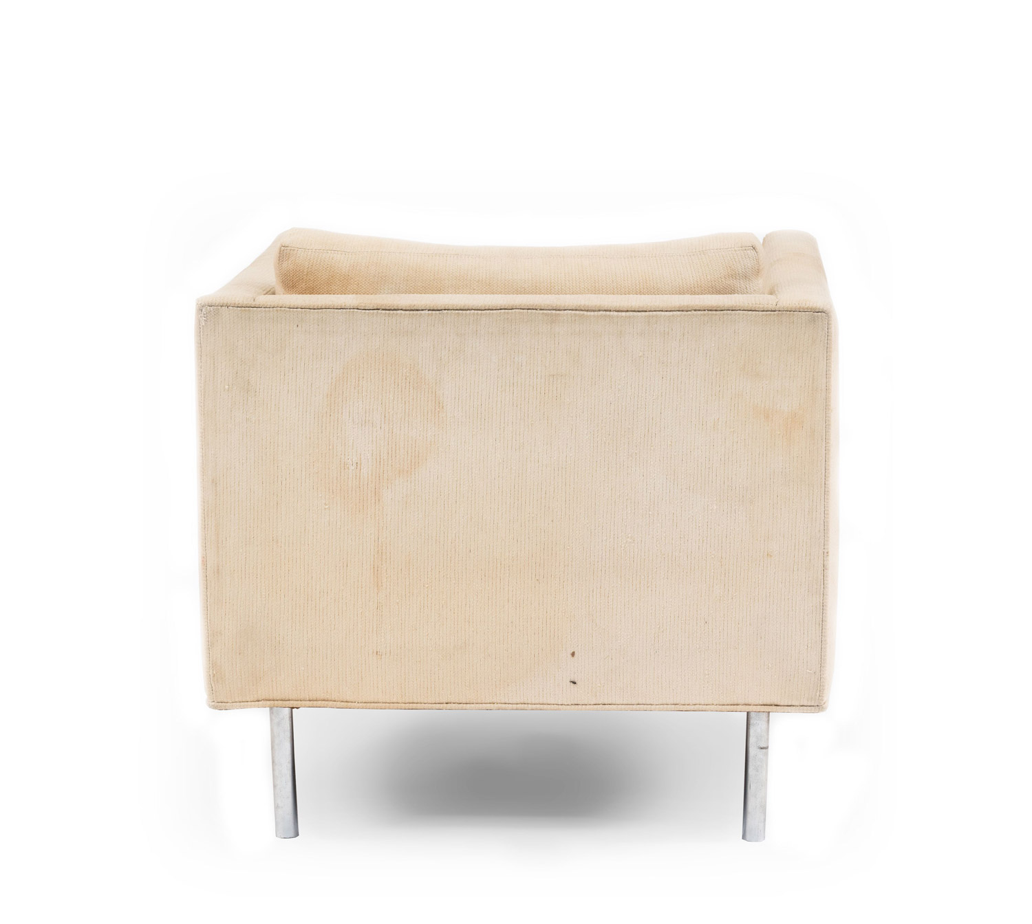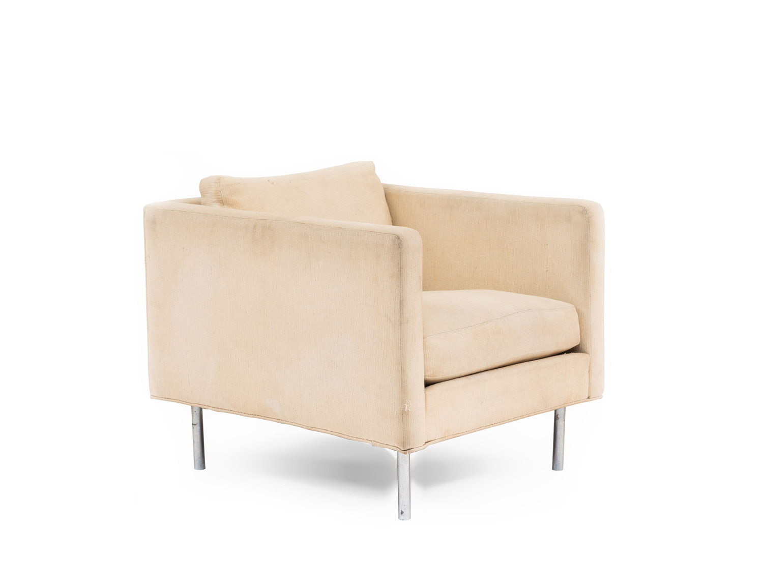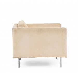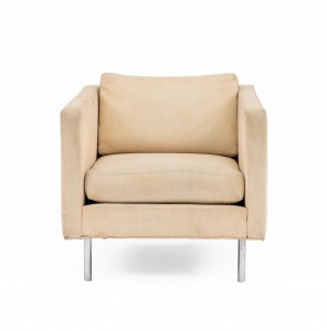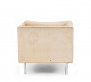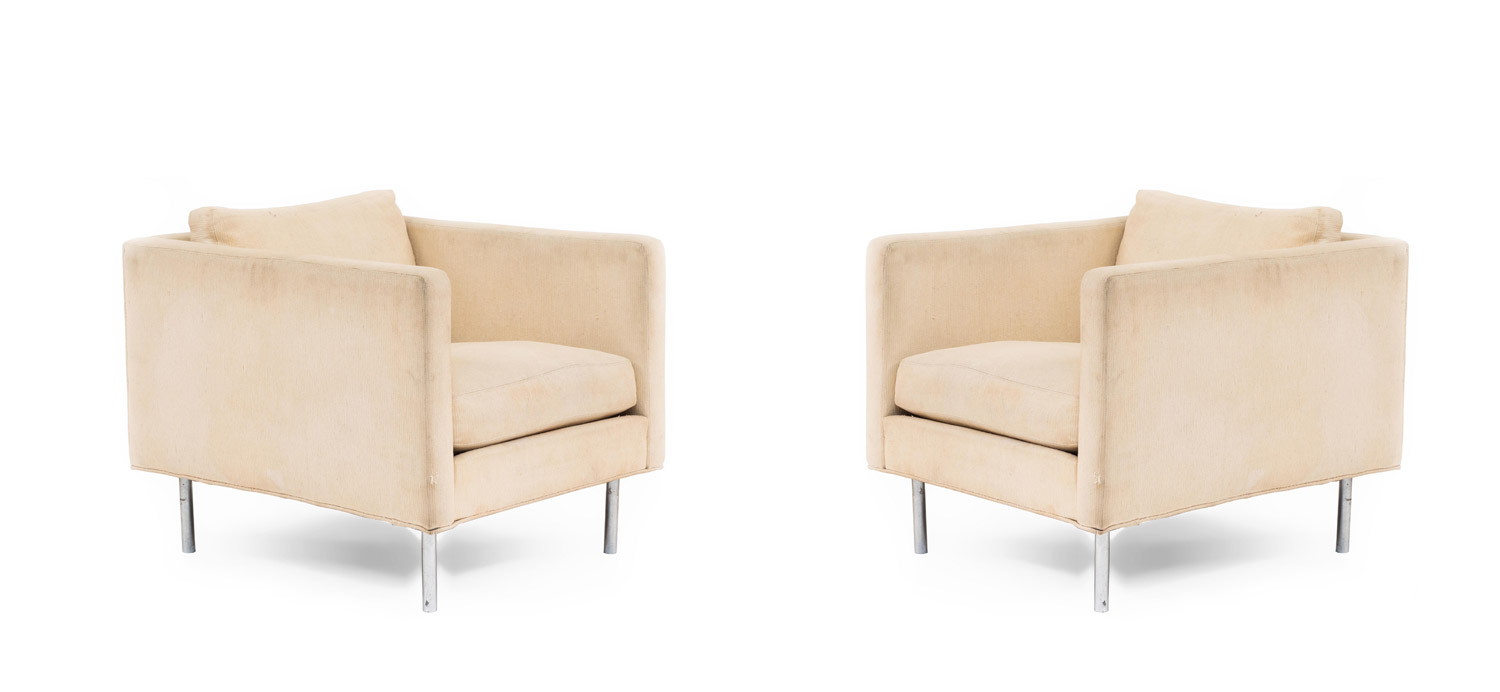 PAIR of American Mid-20th Cent cube form off-white upholstered Armchairs supported on chrome feet (designed by MILO BAUGHMAN, labeled: James Inc ).